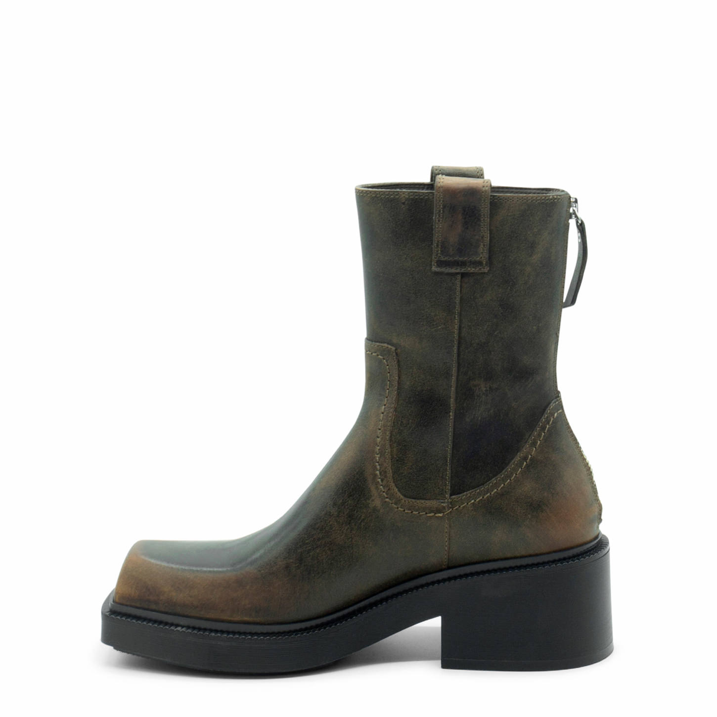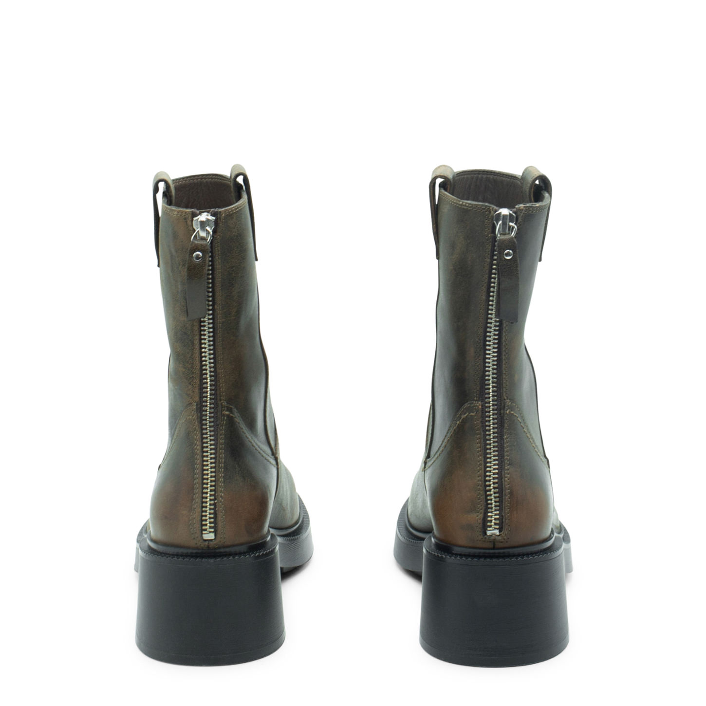 Fray tronchetto biscotto in pelle di vitello vintage, con zip di metallo sul retro e tiranti laterali in pelle. Morbido plantare ricoperto pelle. Made in Italy.