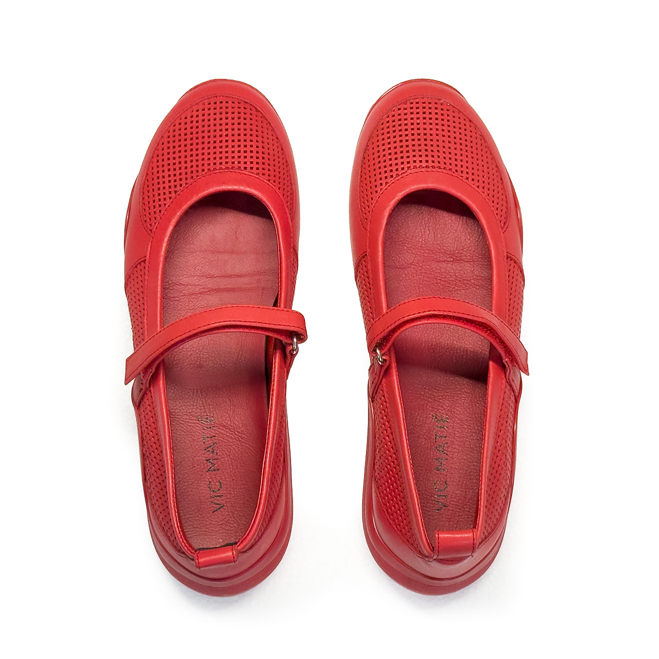 G32_Ondina Ballerina low top in pelle di vitello traforata rossa,leggera e traspirante. Design Mary Jane con cinturino a velcro e anellino decorativo per calzata stabile. Suola in gomma sagomata con texture antiscivolo e plantare in pelle. Versatile e confortevole, ideale per look casual o sportivi quotidiani.