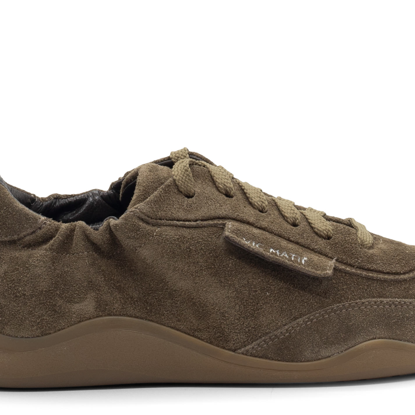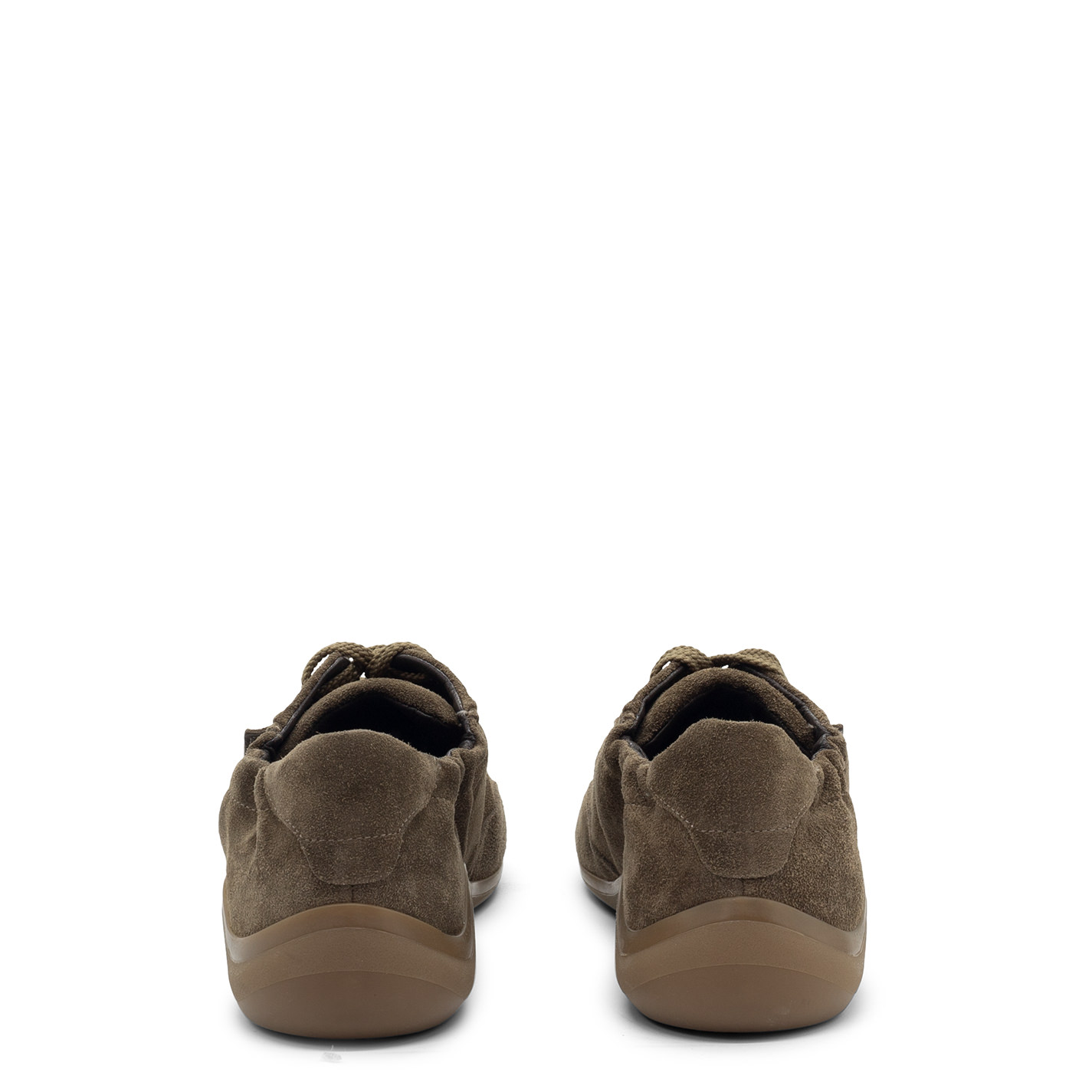 G32 Ondina-Scarpa allacciata tortora interamente realizzata in crosta di vitello con arricciatura su scollo. Etichetta laterale dello stesso materiale della tomaia e logata argento;