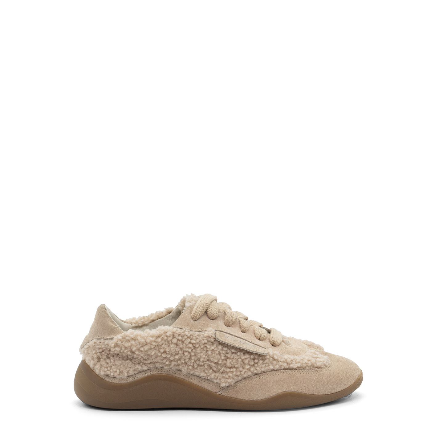 G32 Ondina-Scarpa peluche allacciata nera in crosta di vitello e pelliccetta sintetica. Etichetta laterale dello stesso materiale della tomaia e logata argento. Stringa extra large di cotone tono su tono. Suola in gomma dalla linea ondeggiante e stondata, con texture antiscivolo. Plantare in pelle. Made in Italy.