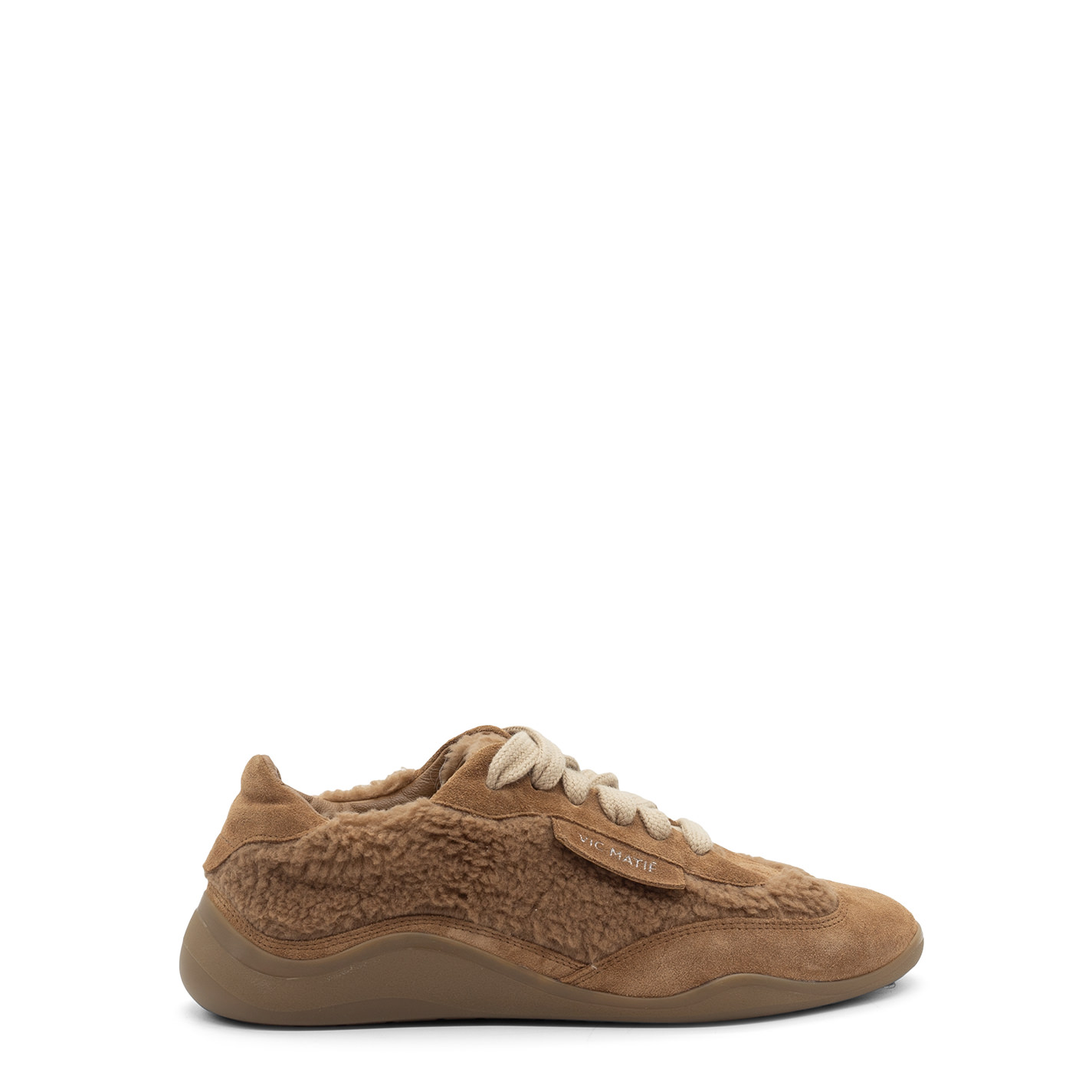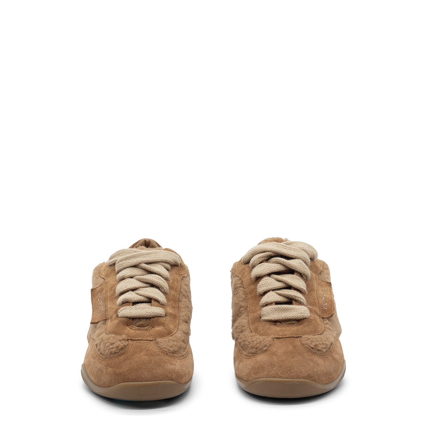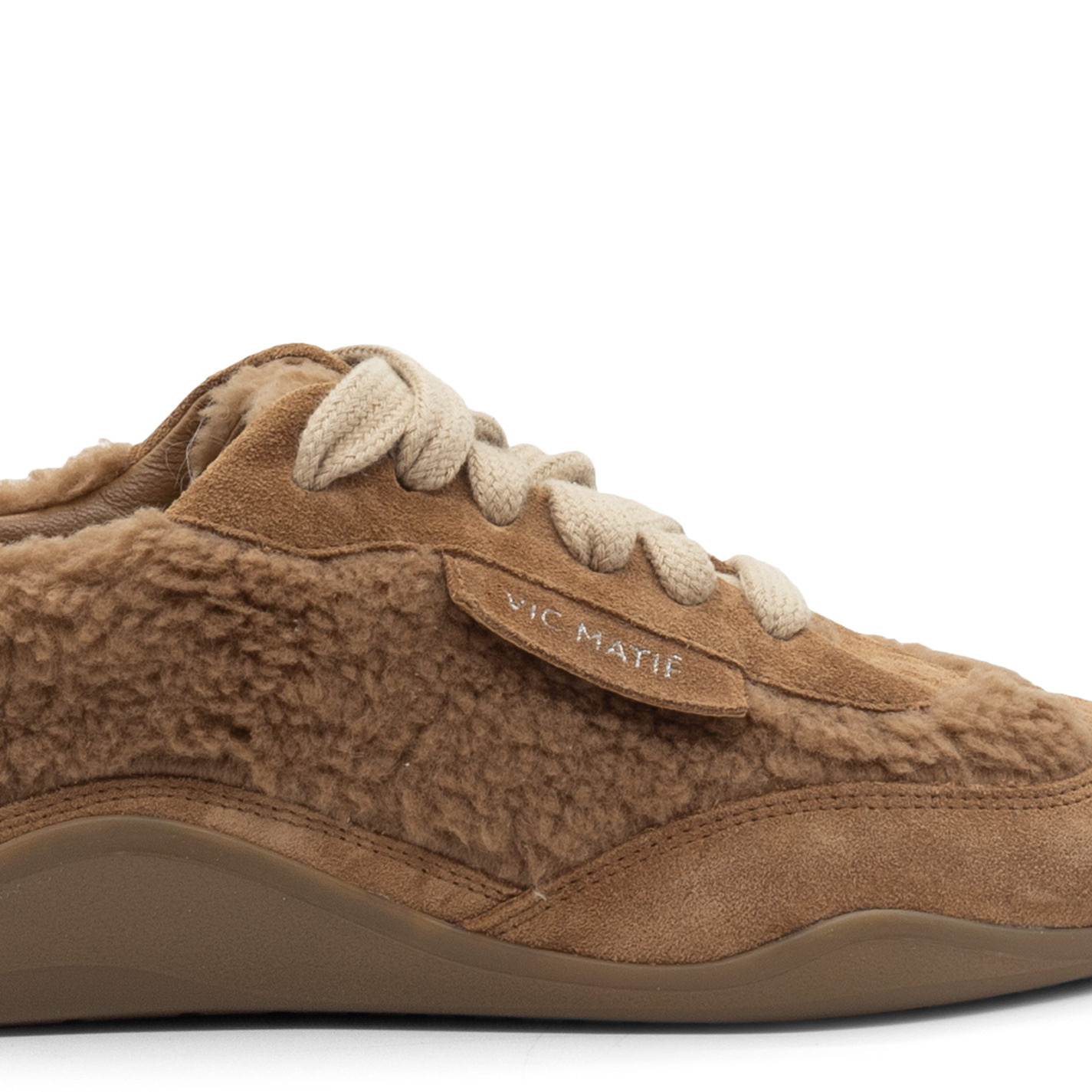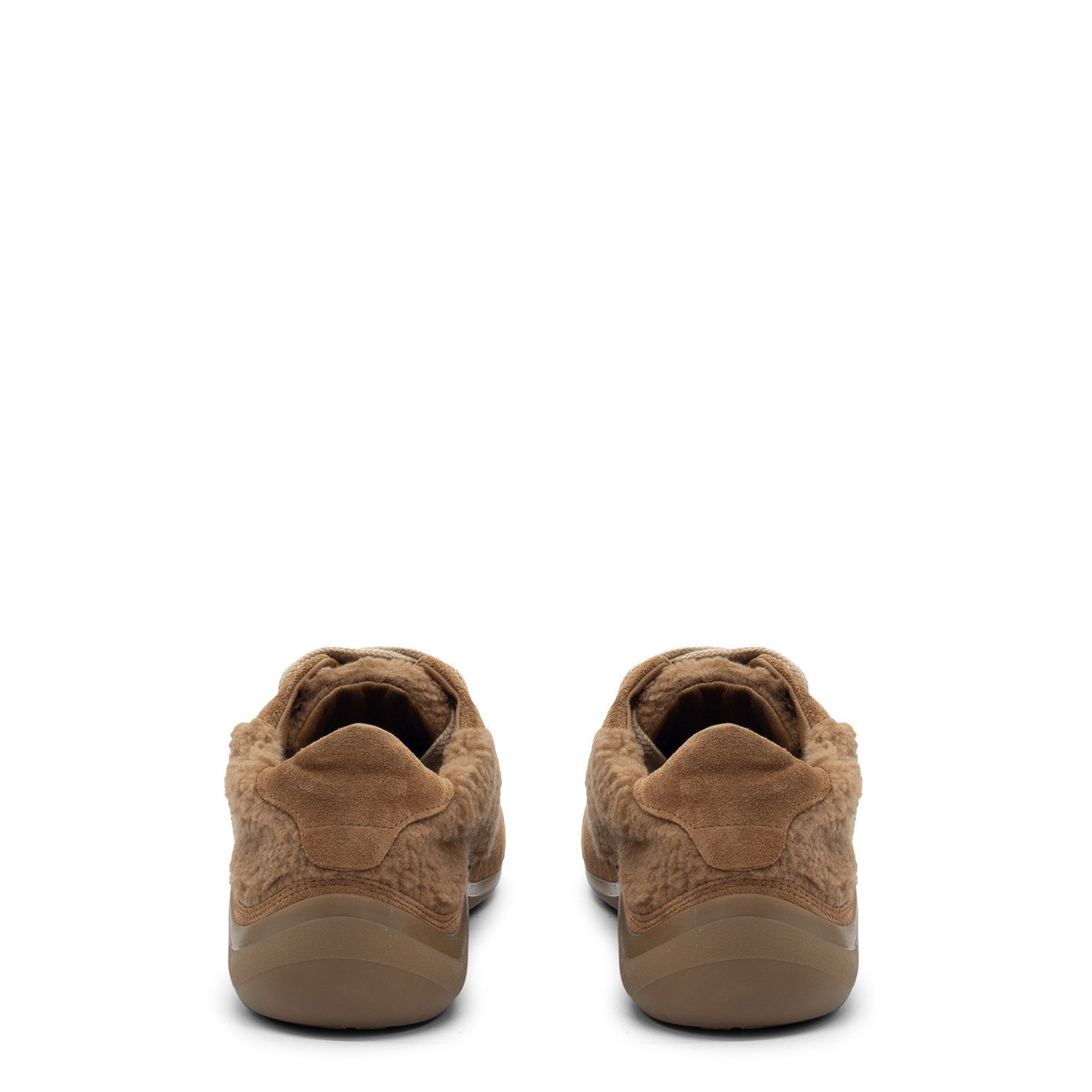G32 Ondina-Scarpa peluche allacciata terra di Siena in crosta di vitello e pelliccetta sintetica. Etichetta laterale dello stesso materiale della tomaia e logata argento. Stringa extra large di cotone tono su tono. Suola in gomma dalla linea ondeggiante e stondata, con texture antiscivolo. Plantare in pelle. Made in Italy.