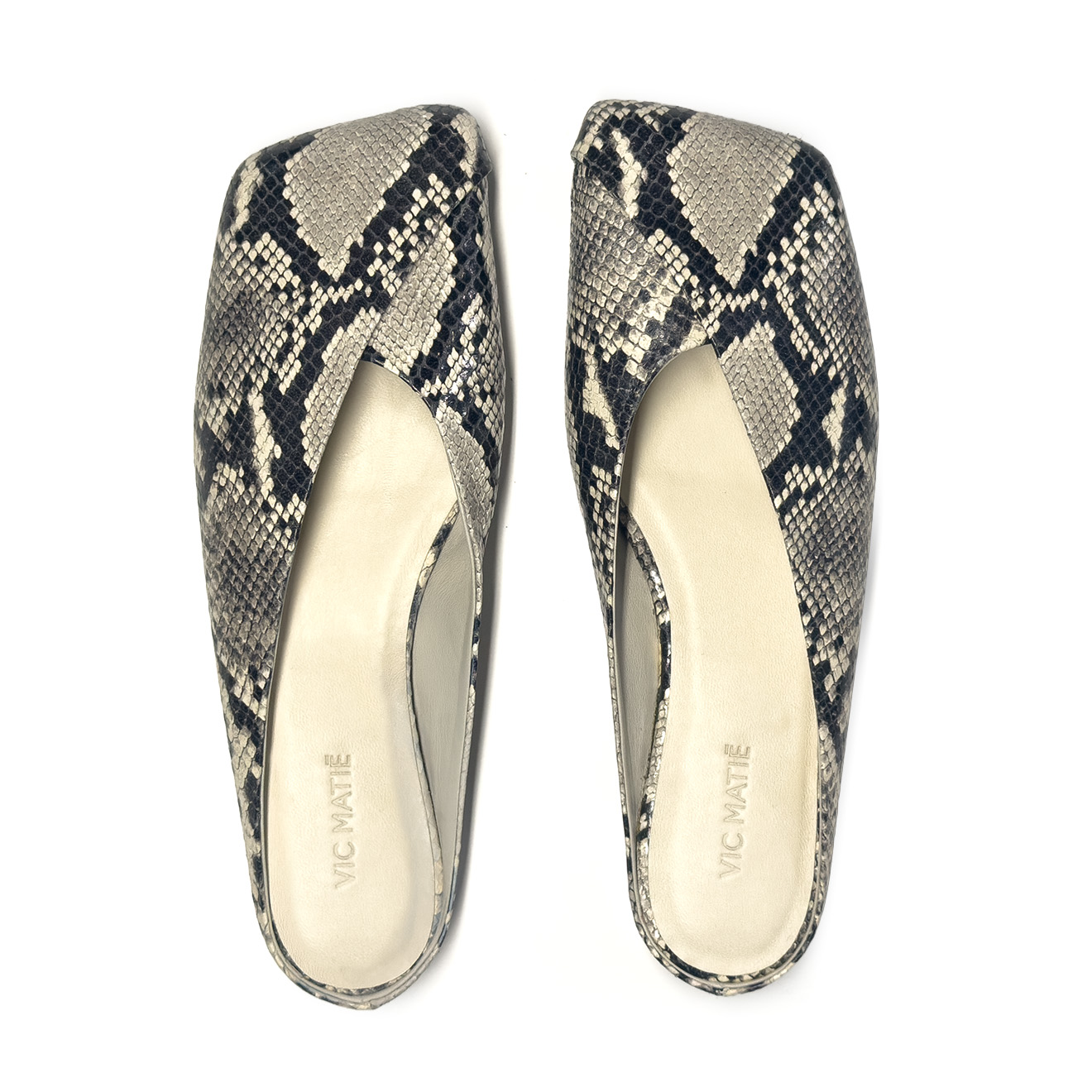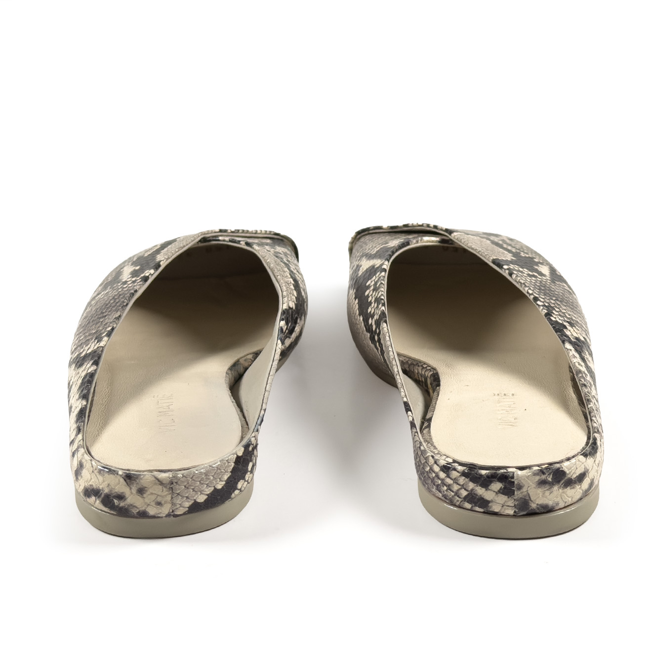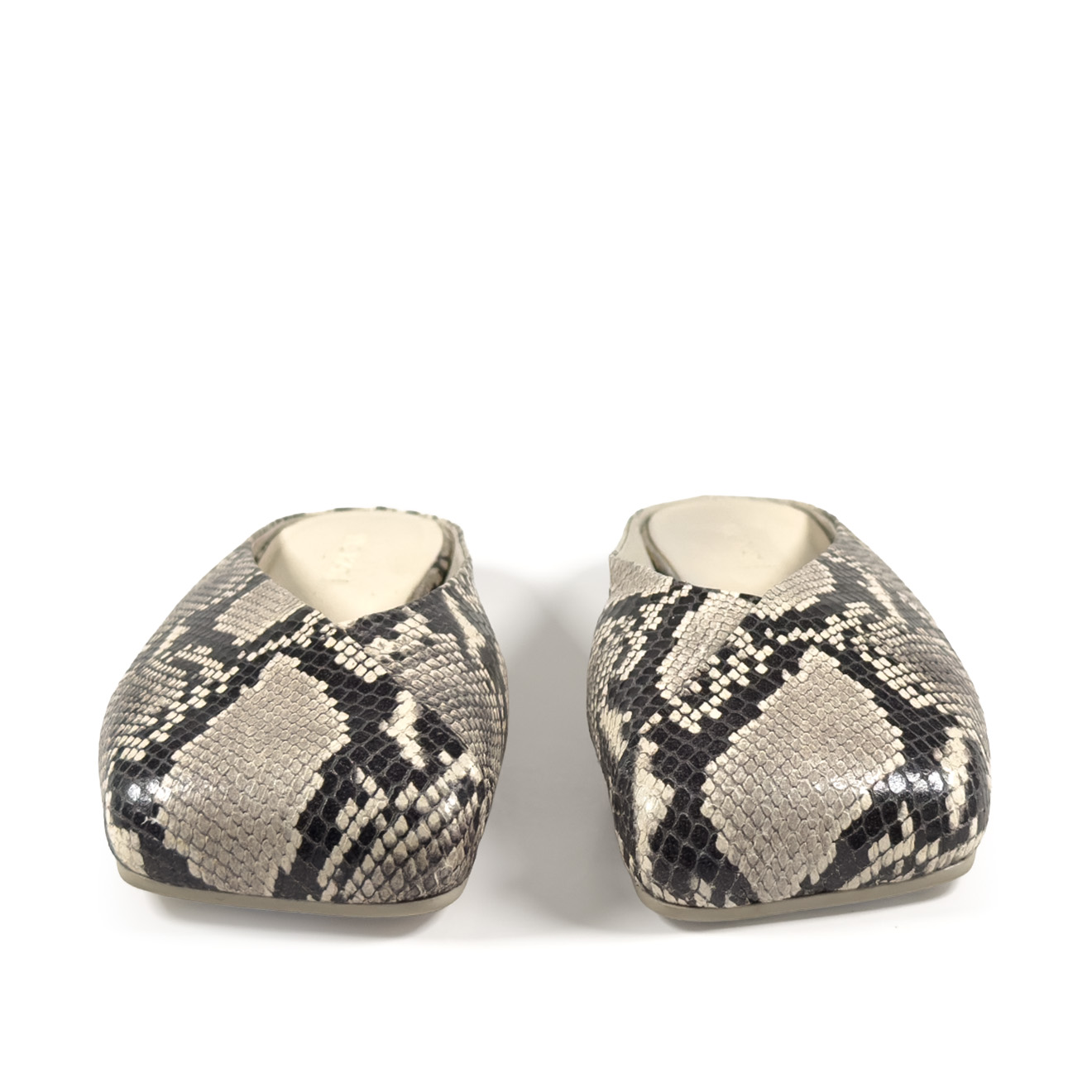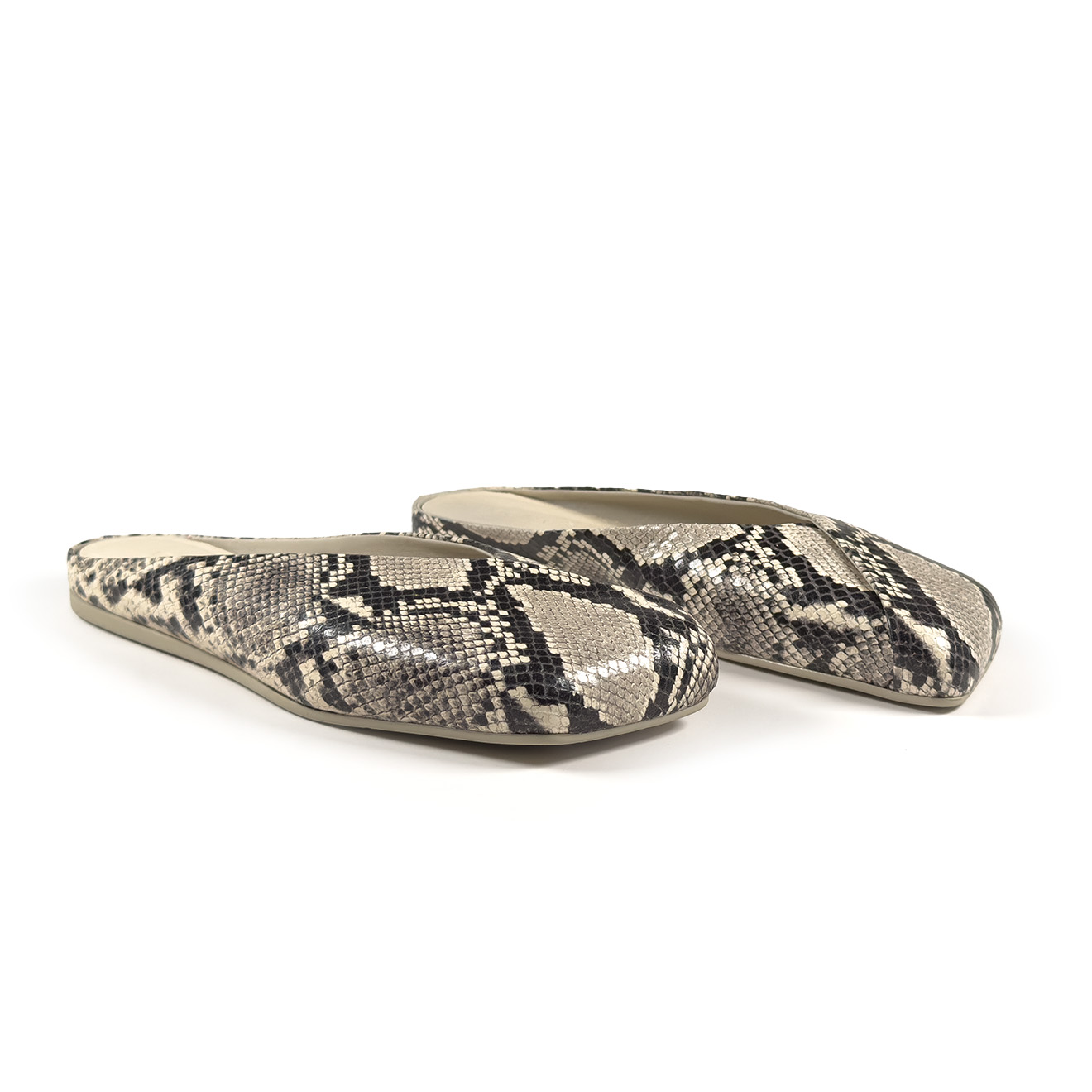 G34_Square closed_Pantofola ghiaccio,in pelle con effetto pitonato con tomaia a scollo asimmetrico e piega obliqua per un effetto elegante e moderno. Suola in gomma antiscivolo con maxi logo e punta squadrata, sottopiede in pelle comfort. Design essenziale e raffinato, ideale per un uso quotidiano chic.