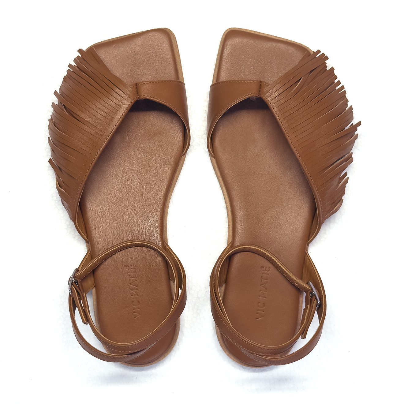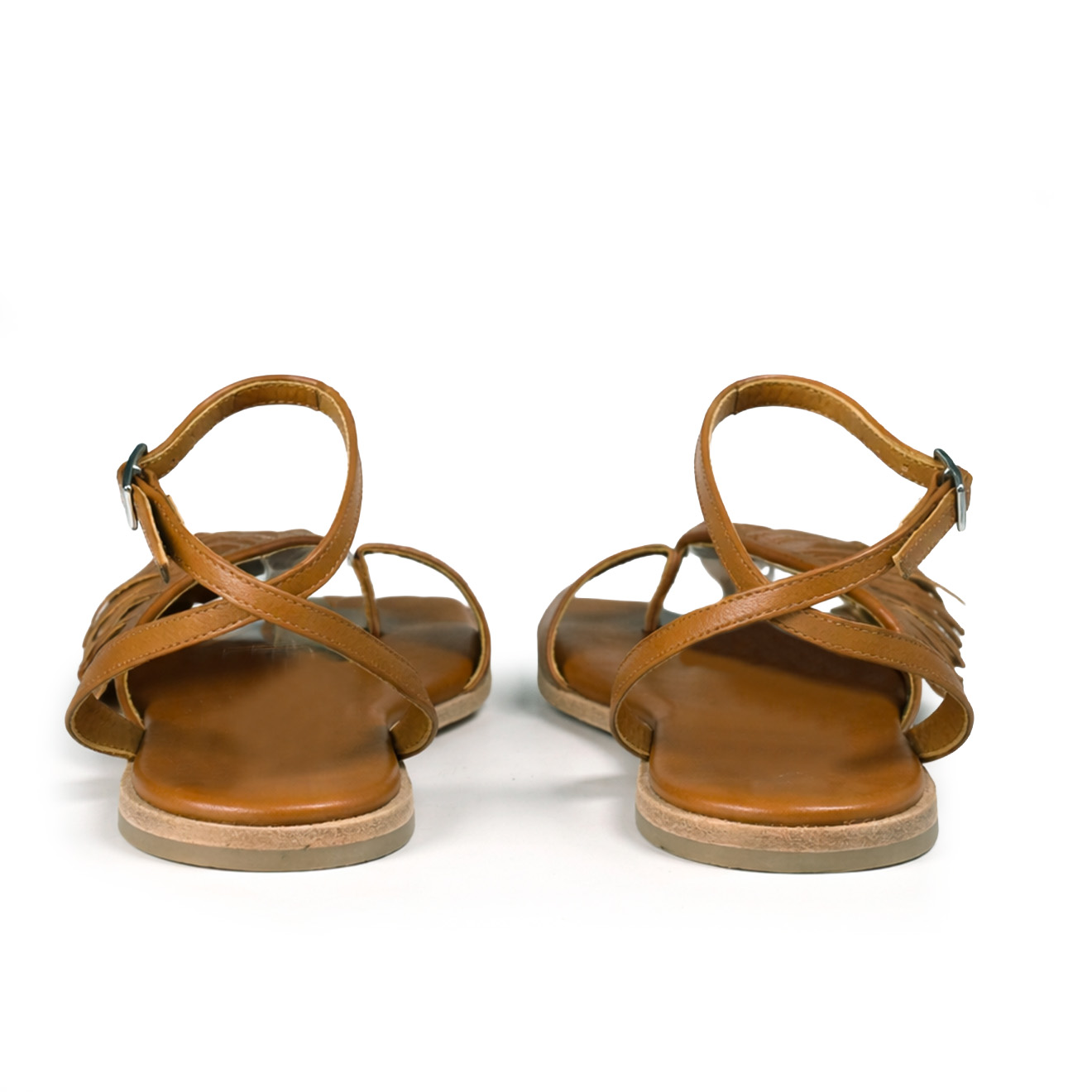 G42_Square open_Sandalo in nappa cuoio,con fascia frontale decorata da frange sottili per un look boho e contemporaneo. Cinturino alla caviglia regolabile con fibbia in metallo, suola piatta in cuoio con tacco antiscivolo in gomma e sottopiede imbottito in pelle. Comodo, versatile e perfetto per distinguersi con stile nelle giornate estive.