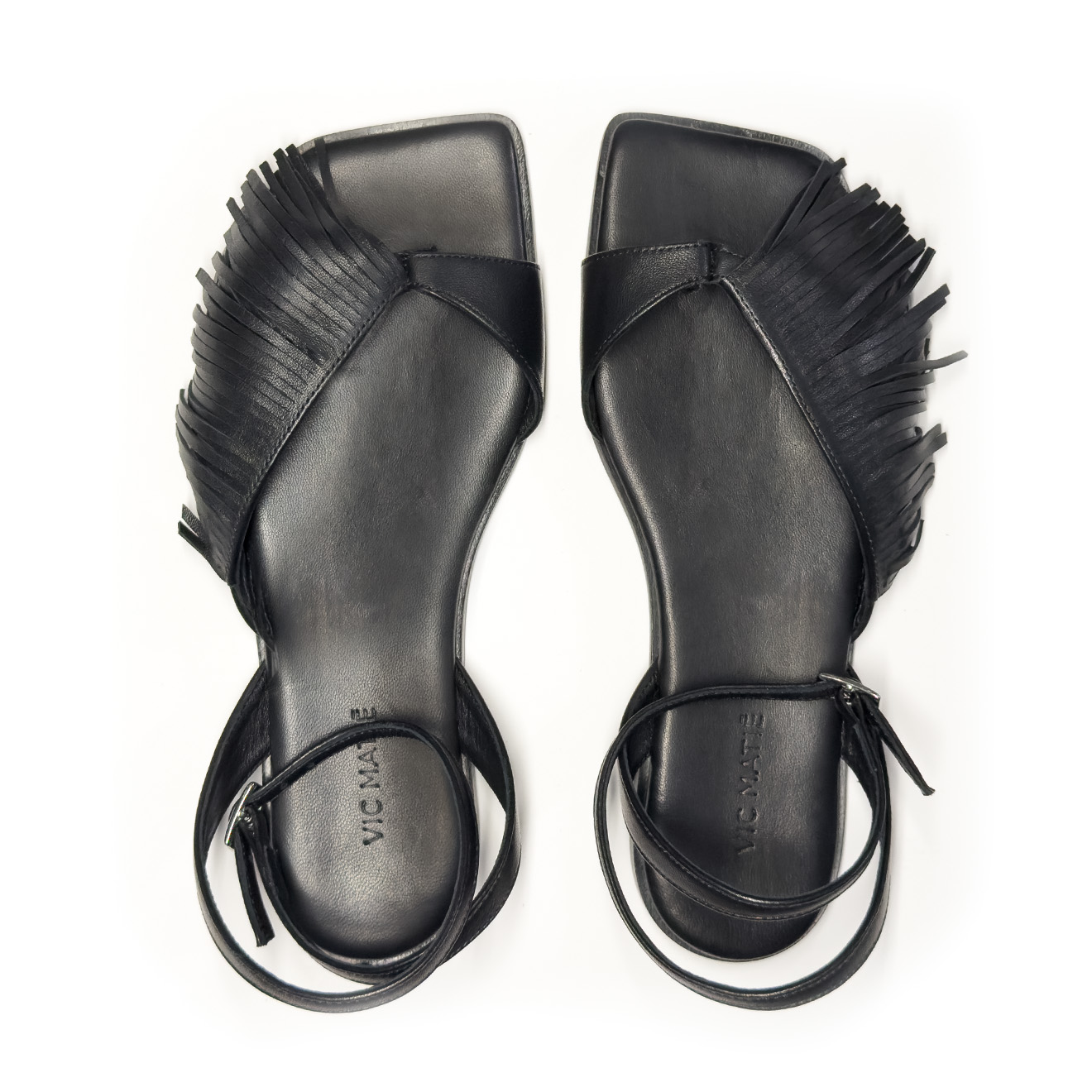 G42_Square open_Sandalo in nappa nera ,con fascia frontale decorata da frange sottili per un look boho e contemporaneo. Cinturino alla caviglia regolabile con fibbia in metallo, suola piatta in cuoio con tacco antiscivolo in gomma e sottopiede imbottito in pelle. Comodo, versatile e perfetto per distinguersi con stile nelle giornate estive.