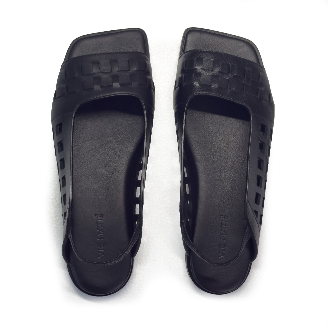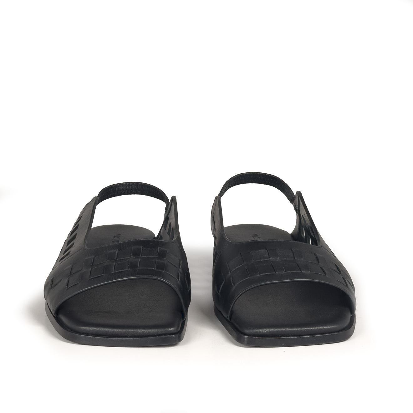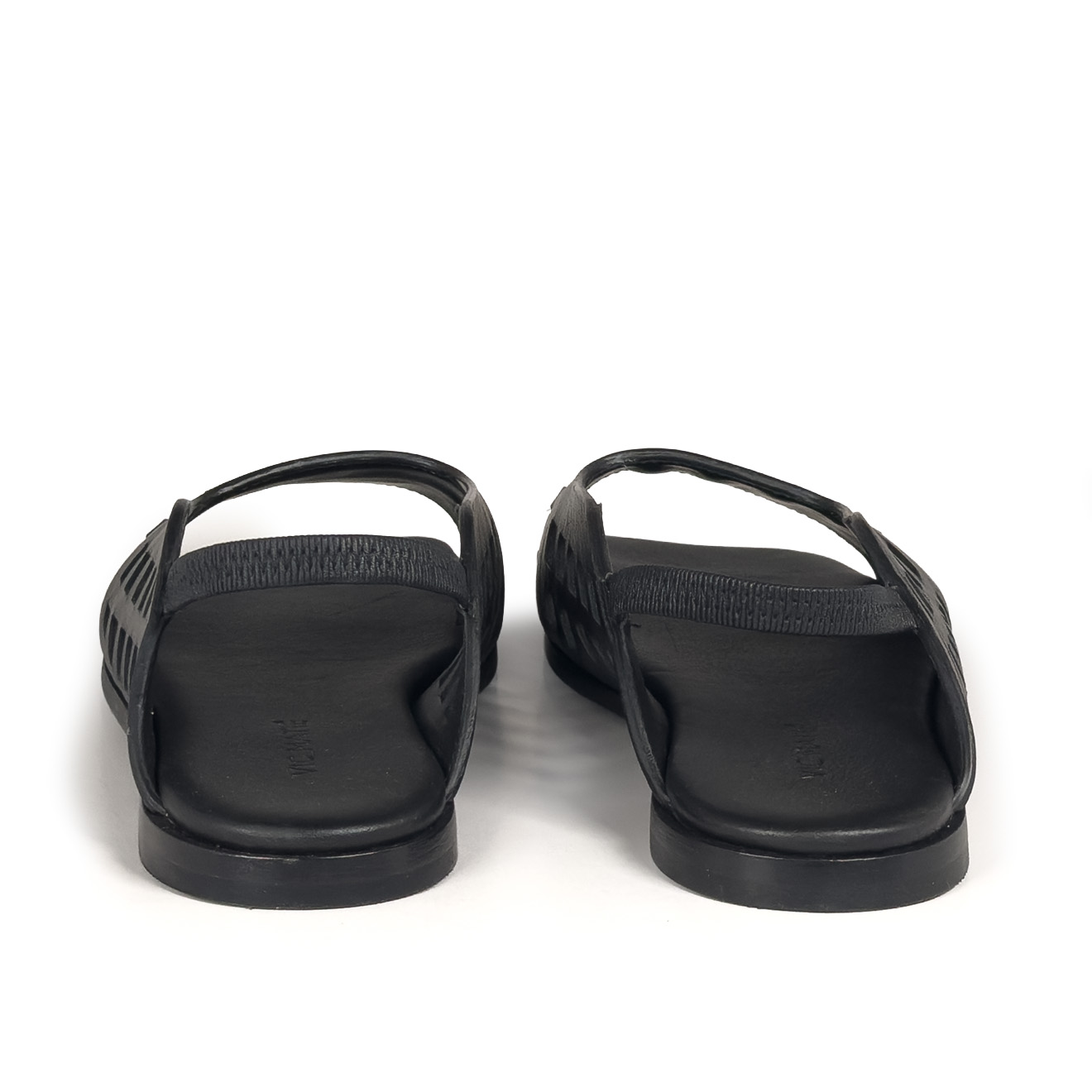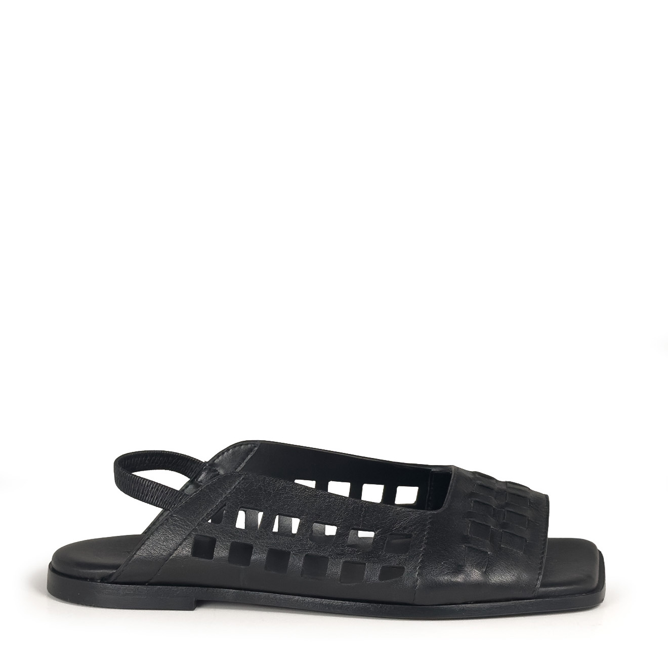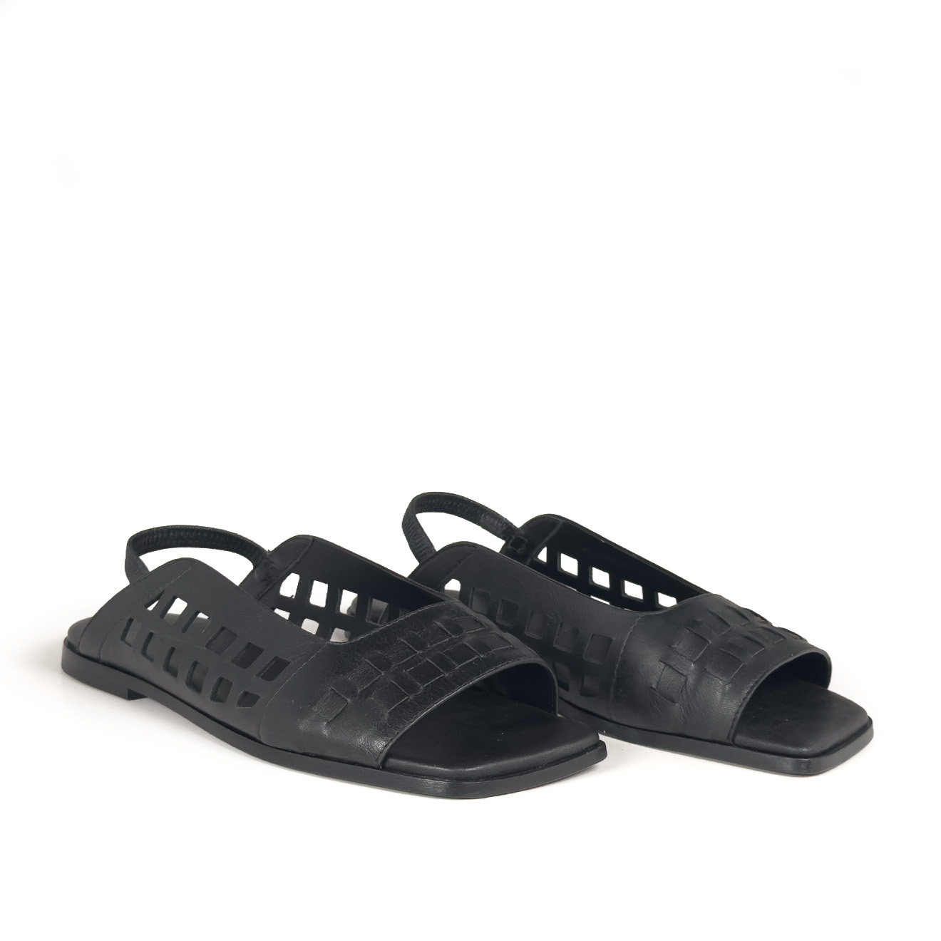 G42_Square open_Sandalo nero con intagli ,realizzato in pelle liscia con tomaia traforata a motivo geometrico, leggero e traspirante. Design open-toe con cinturino slingback sul tallone, suola piatta in cuoio con tacco antiscivolo e sottopiede imbottito in pelle. Essenziale, moderno e confortevole: ideale per look urbani e minimal.
