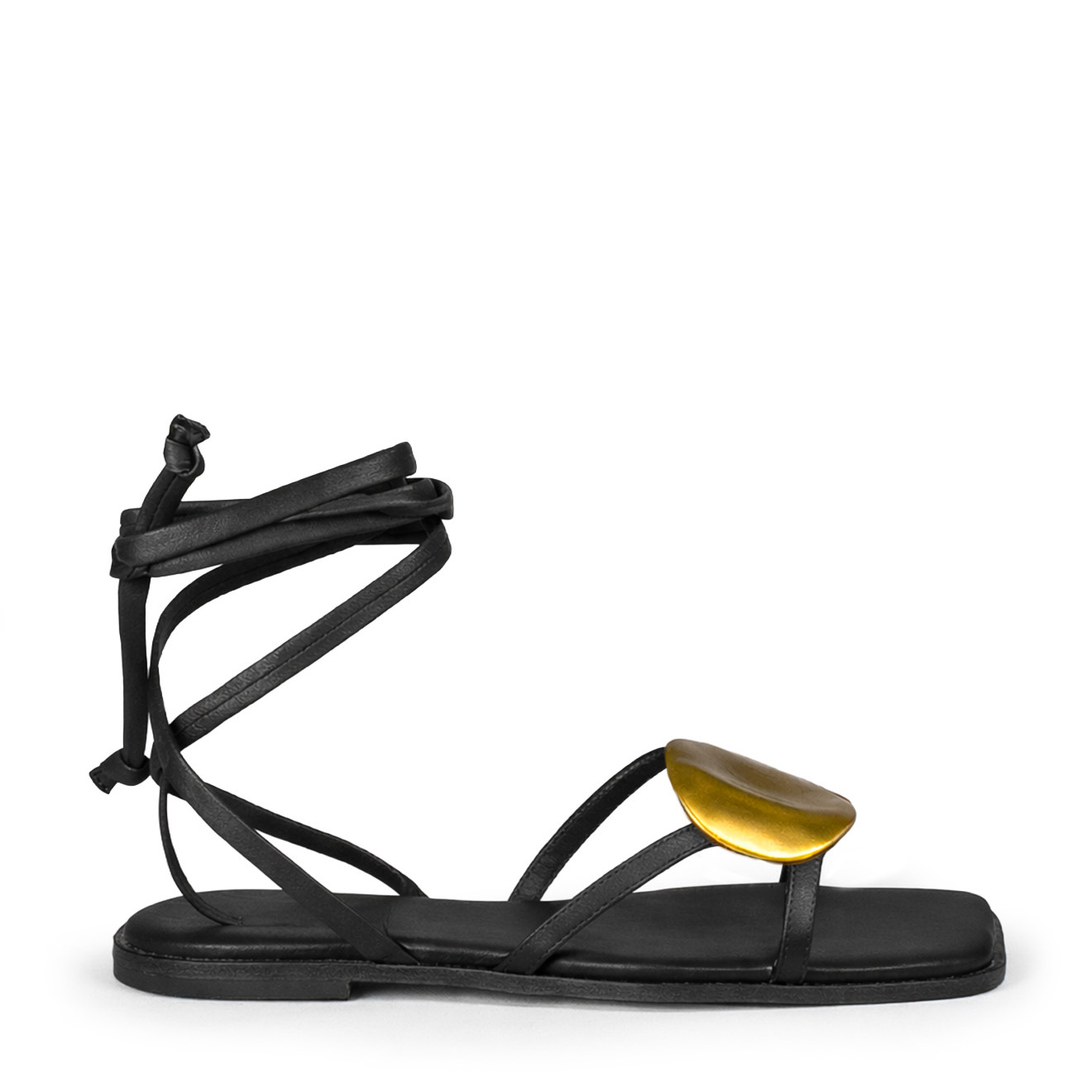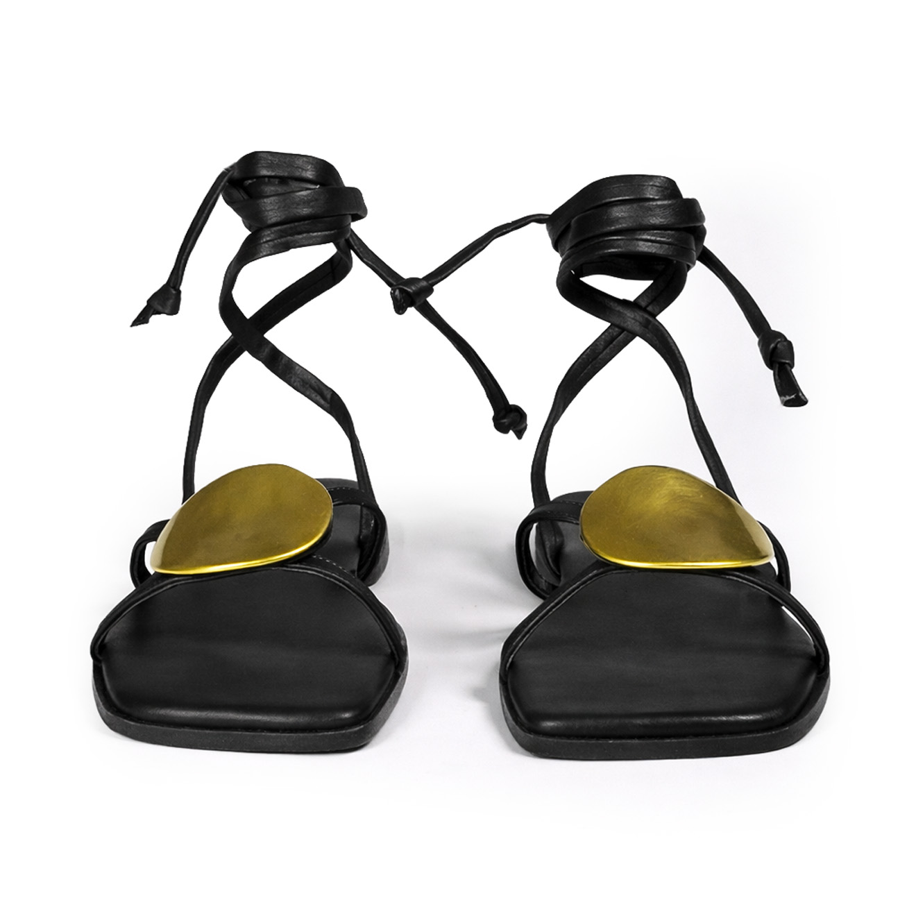 G42_Square open_Sandalo nero con maxi borchia ,decorativa sulla fascia frontale, dettaglio forte e contemporaneo. Realizzato in morbida nappa, con allacciatura alla caviglia stile schiava con sottili listini in pelle, suola piatta in cuoio con tacco antiscivolo in gomma e sottopiede imbottito in pelle. Un modello audace e raffinato, ideale per look estivi dal carattere deciso.