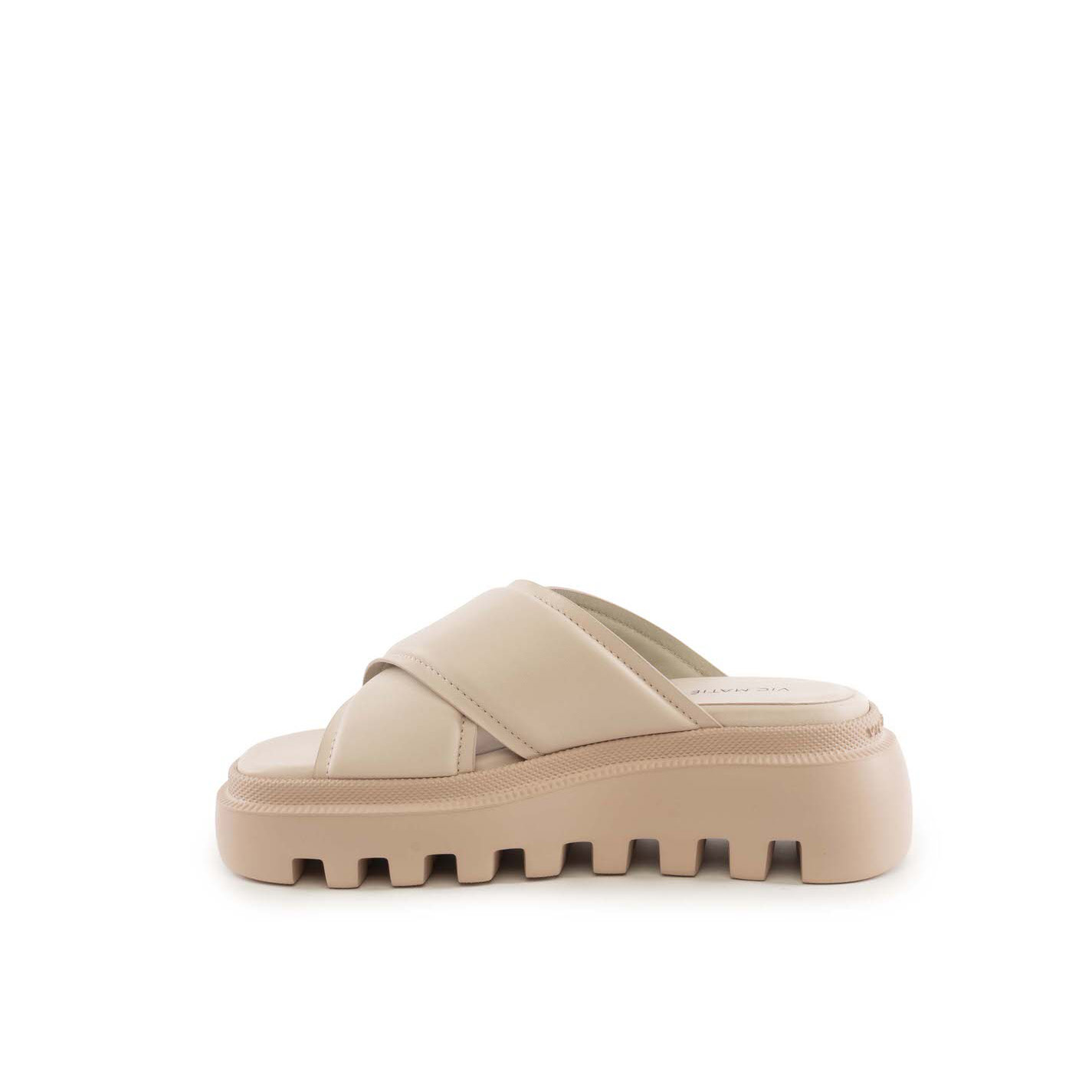 Gear ciabatta rosa pallido in vitello nappato, con maxi fasce incrociate e imbottite. La suola realizzata in materiale espanso super leggero ha delle tacche che ricordano l'ingranaggio;