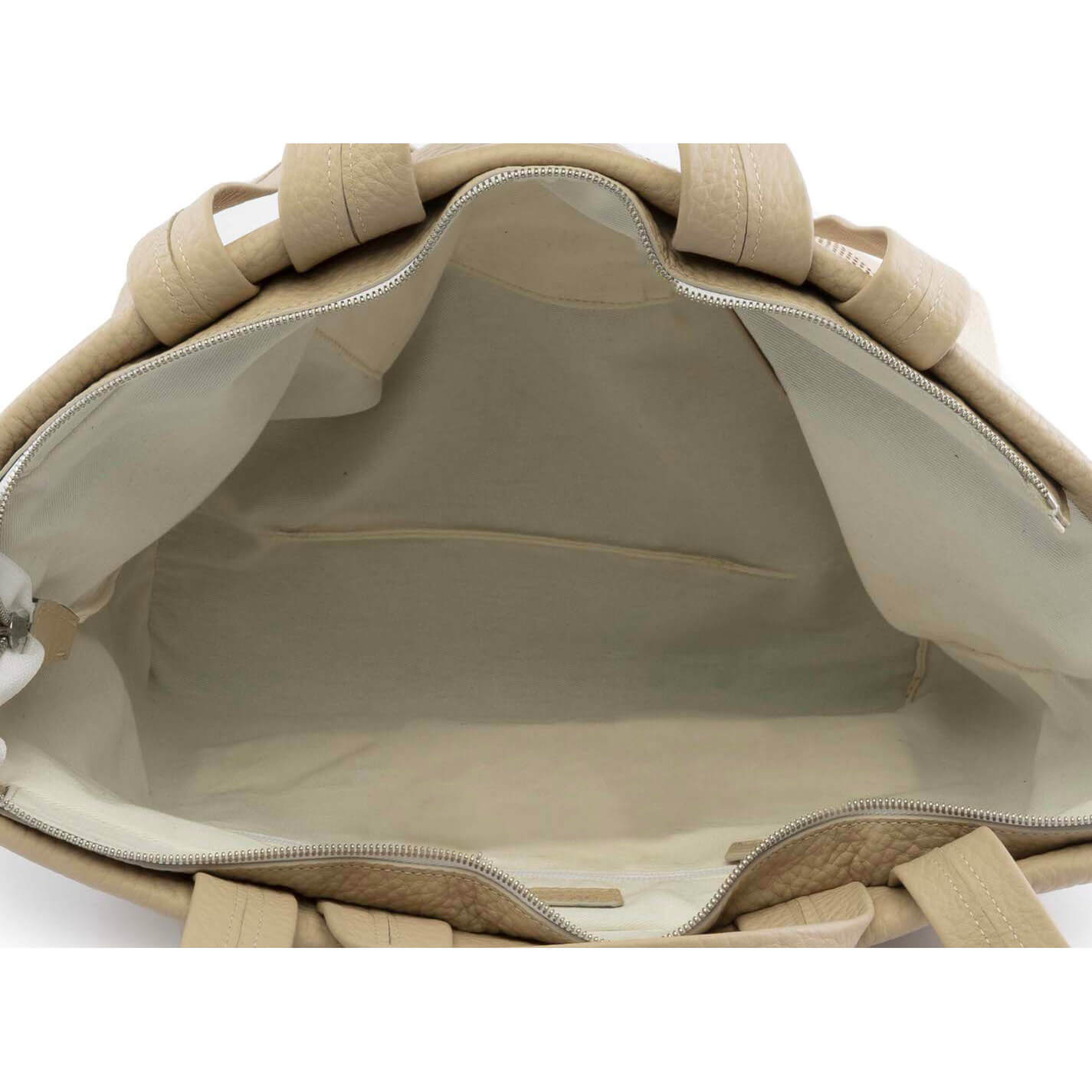 Maxi shopper rosa sabbia realizzata in pelle di vitello grana grosa, con traforo e logo con infilatura nella parte anteriore. Chiusura con zip di metallo. Doppi manici di diversa lunghezza.