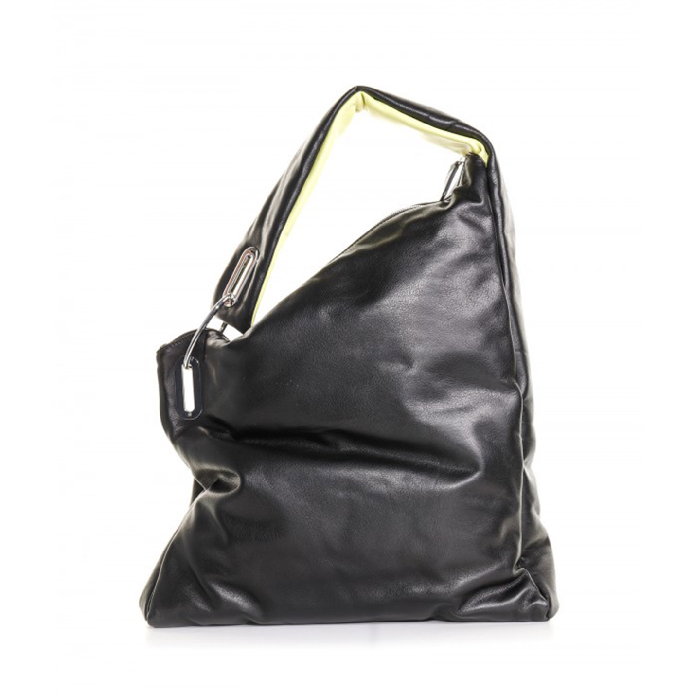Shopper monospalla nera/lime in morbida nappa di vitello, dalla forma asimmetrica, con tracolla incorporata; dettagli di maxi occhielli e moschettone metallico laterale.Impreziosita da logo metallico.
