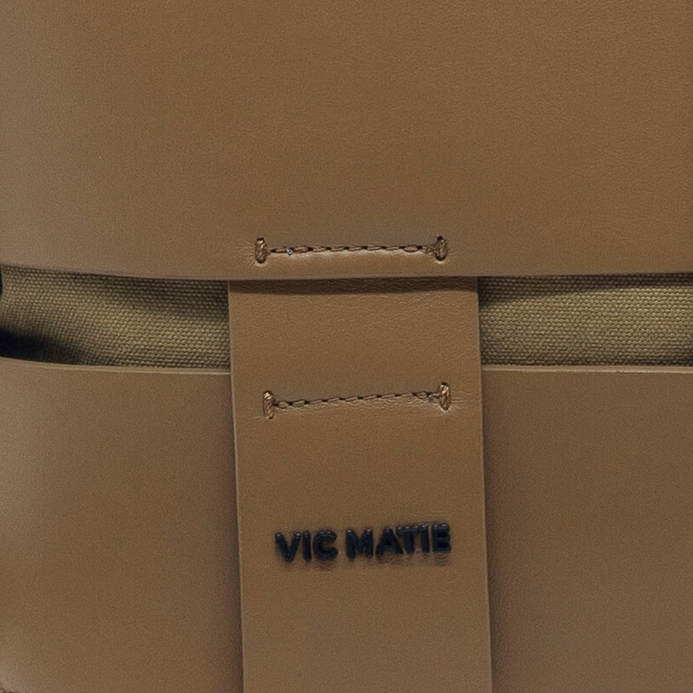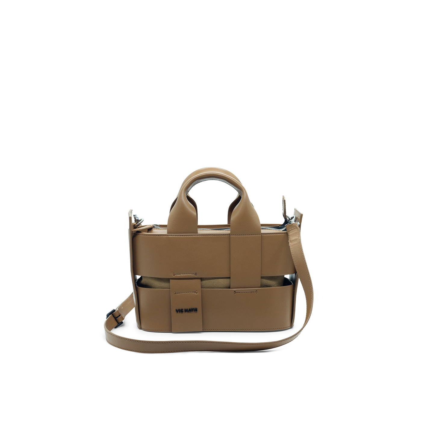 secchiello ovale cuoio, realizzata da fasce accoppiate di pelle di vitello liscio e canvas di cotone. Manici in pelle che si intersecano al corpo della borsa;