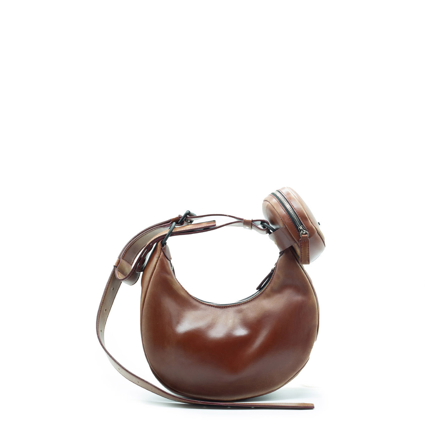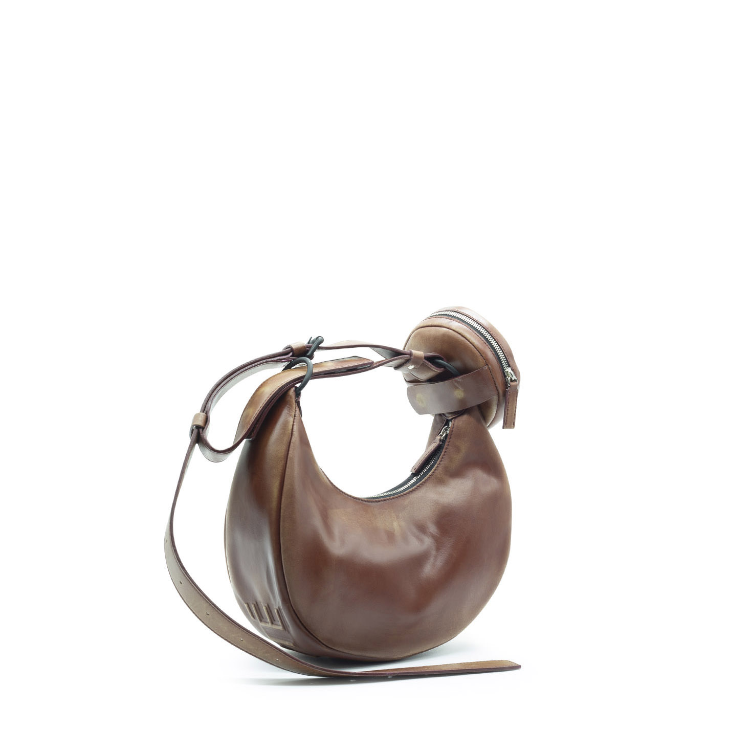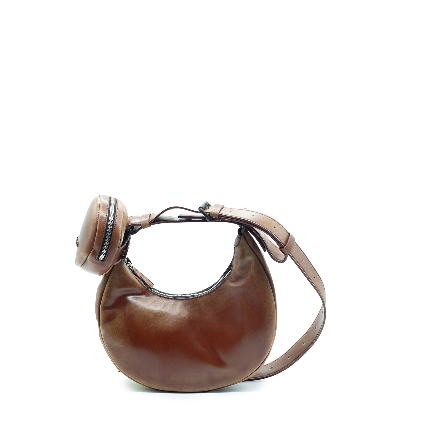 Borsa a tracolla marrone, realizzata in vitello effetto vintage , con logo 3d nel fondo. Tracolla regolabile ed estraibile, chiusura con zip di metallo. Borsellino rotondo logato e staccabile, con possibilità di indossarlo al polso tramite cinturino di cui è dotato.