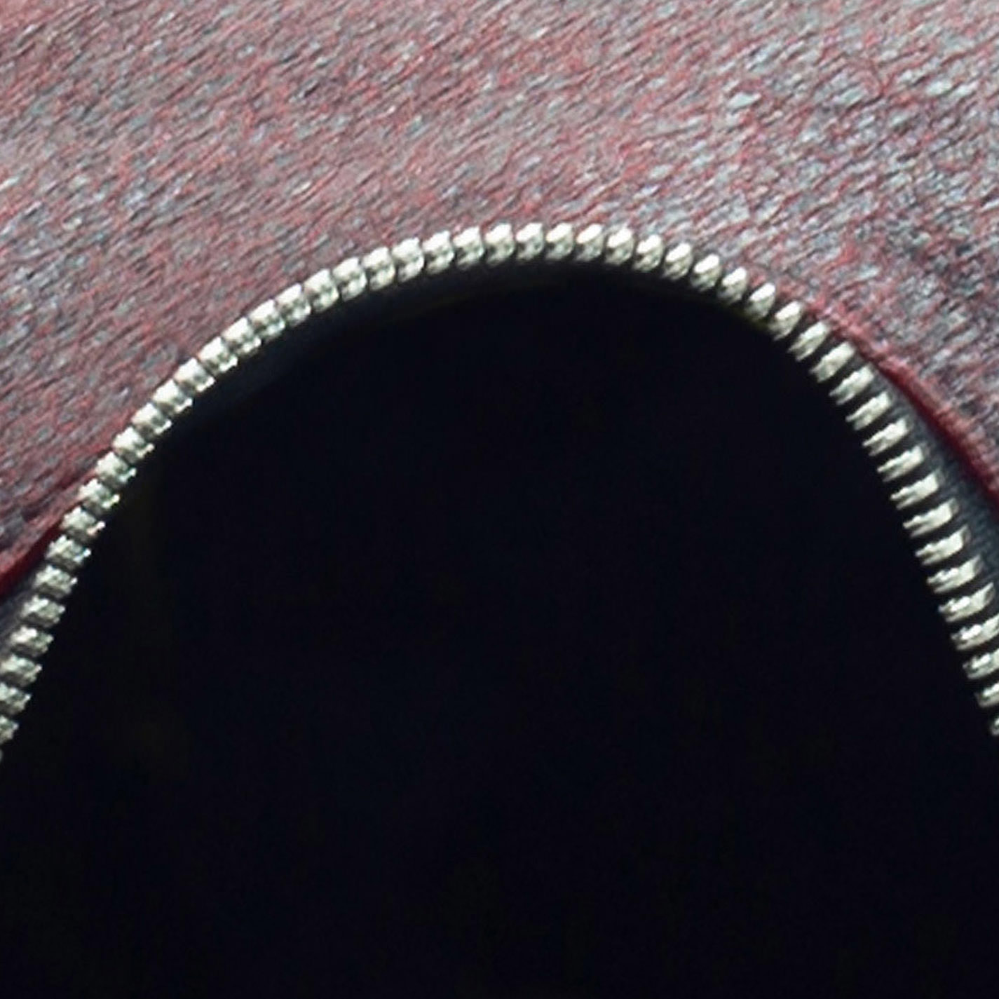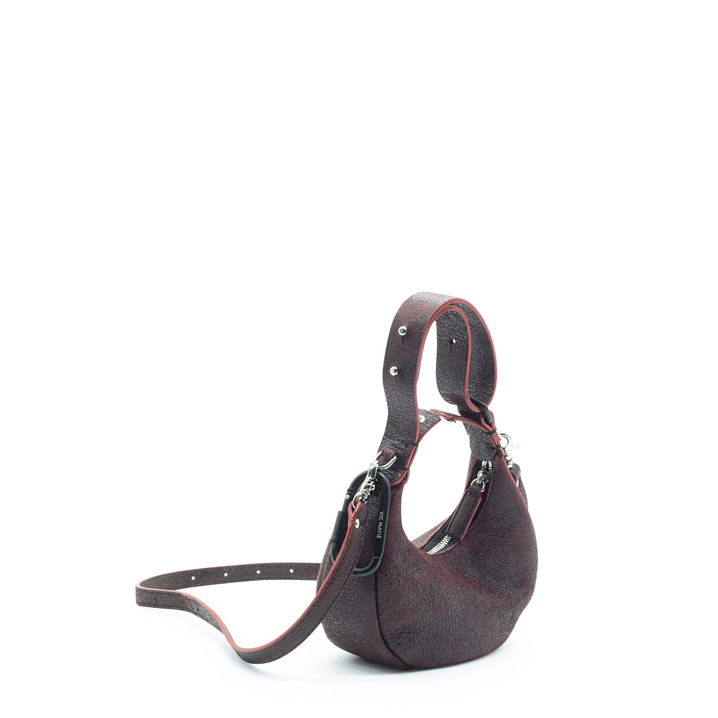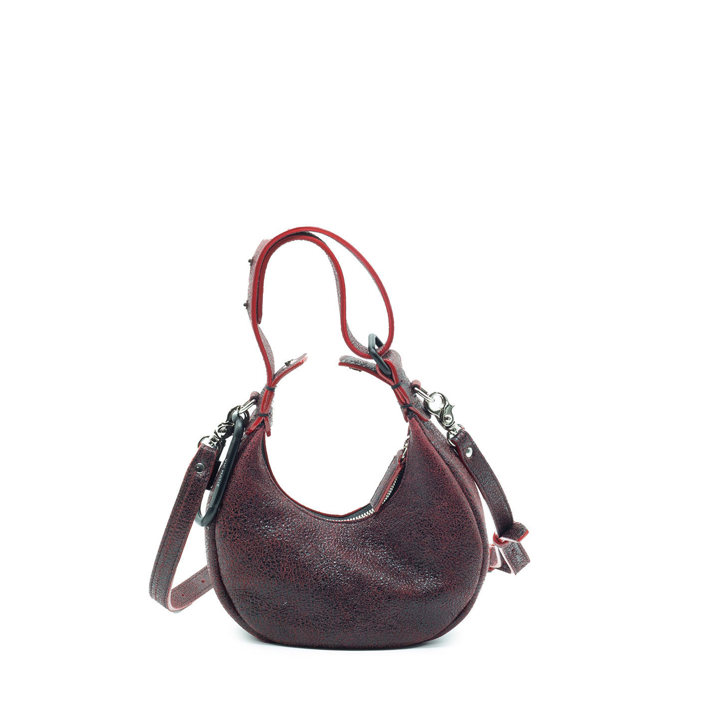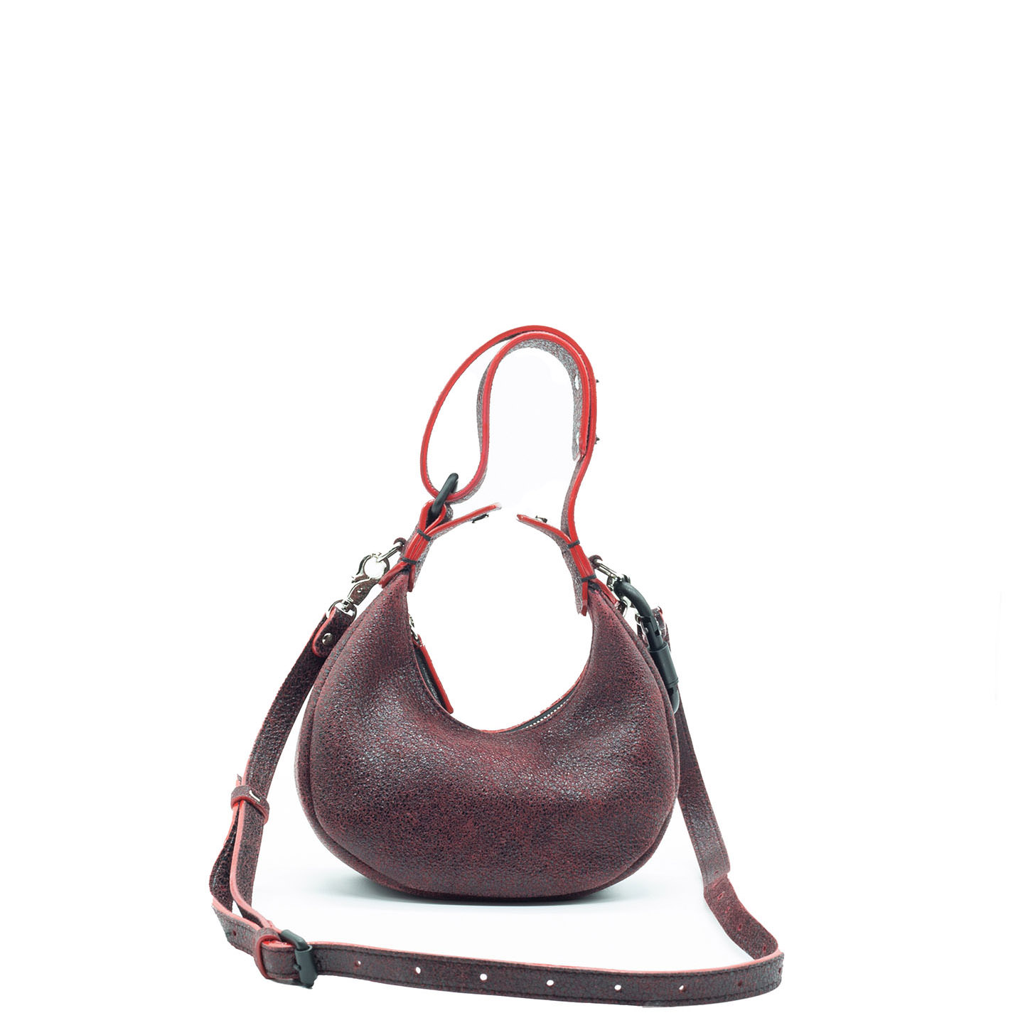 Borsa spicchio effetto screpolato rosso scuro "punk style "anni 90,con maxi logo a rilievo su fondo. Tracolla regolabile e removibile, come il manico, che agganciando l'automatico si può indossare a manicotto. Chiusura con zip metallica.