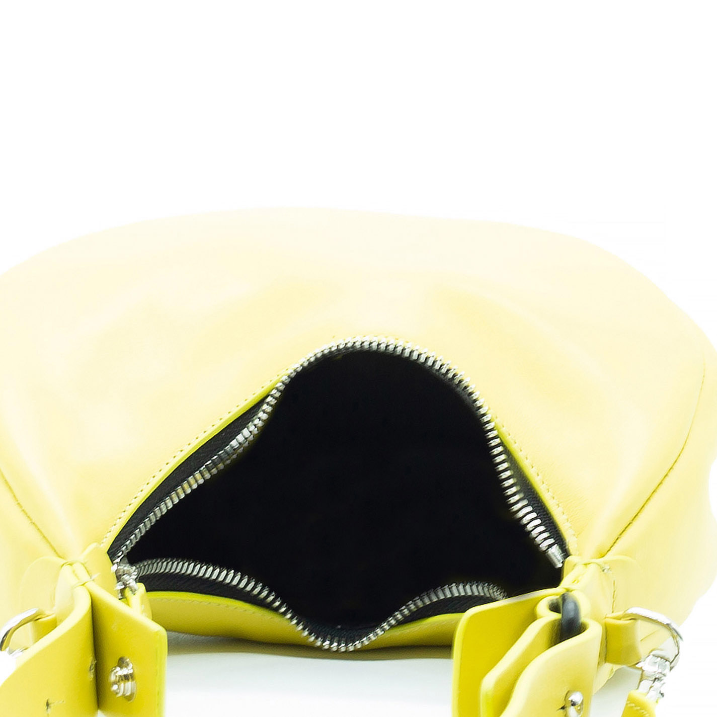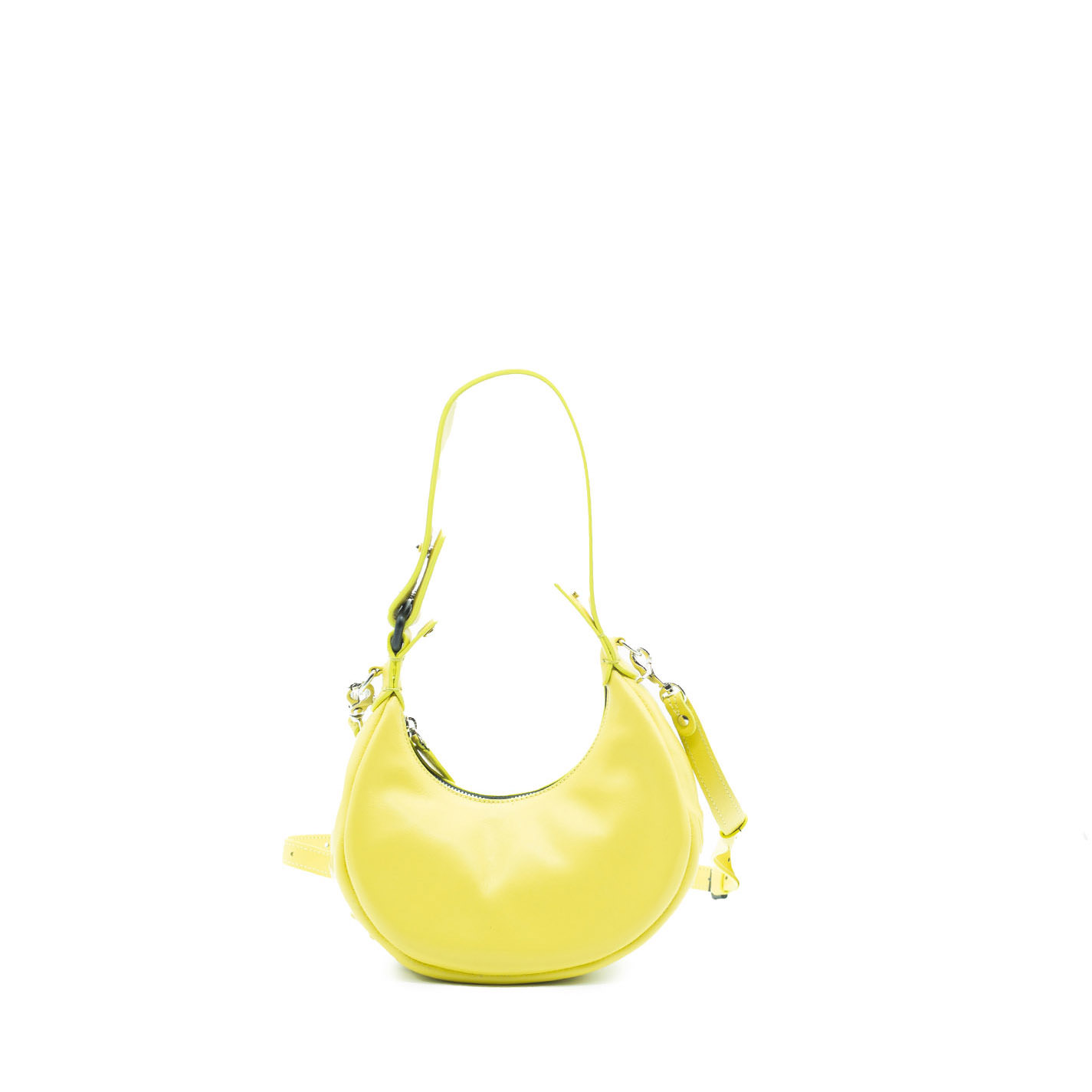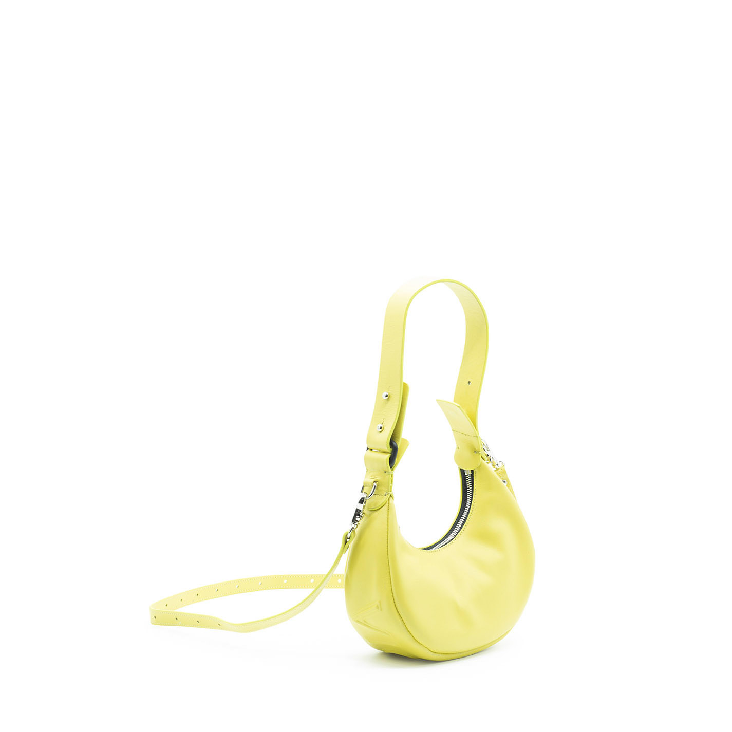 Borsa spicchio gialla in pelle di vitello liscio, con maxi logo a rilievo su fondo. Tracolla regolabile e removibile, come il manico, che agganciando l'automatico si può indossare a manicotto. Chiusura con zip metallica.