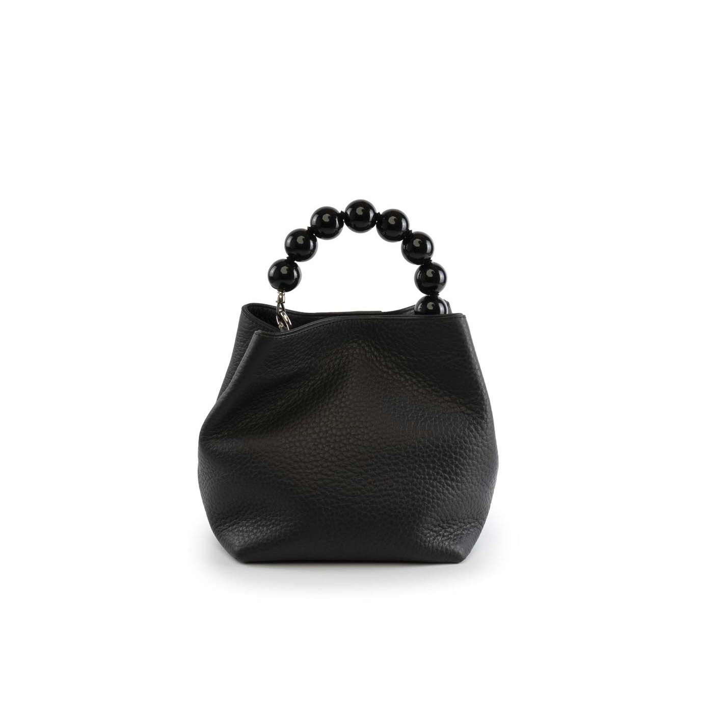 Secchiello a tracolla nero realizzato in pelle di vitello grana grande, con doppi manici: uno di sfere tono su tono e l'altro in pelle rimovibile, chiusura con magnete ed automatico, tracolla in pelle regolabile. Impreziosita da logo metallico sul davanti.
