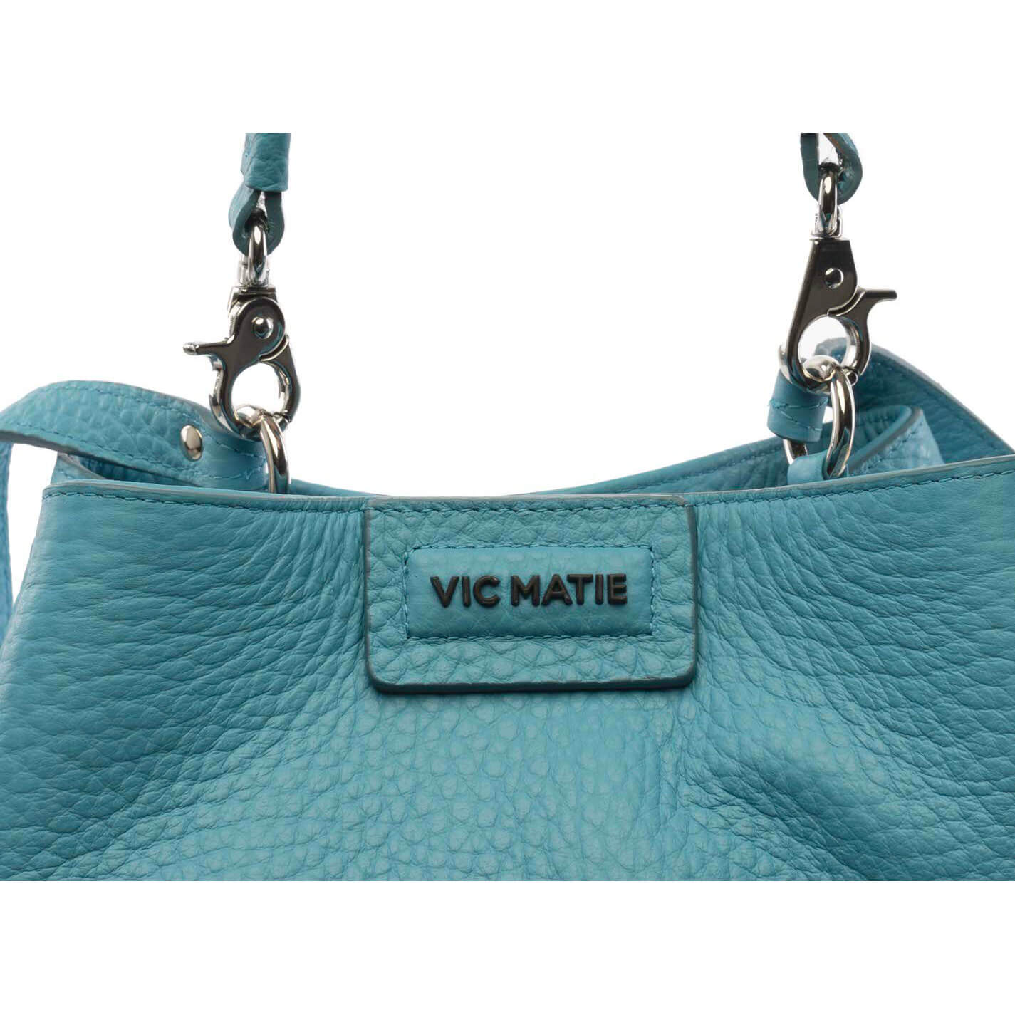 Secchiello a tracolla turchese realizzato in pelle di vitello grana grande, con doppi manici: uno di sfere tono su tono e l'altro in pelle rimovibile, chiusura con magnete ed automatico, tracolla in pelle regolabile. Impreziosita da logo metallico sul davanti.