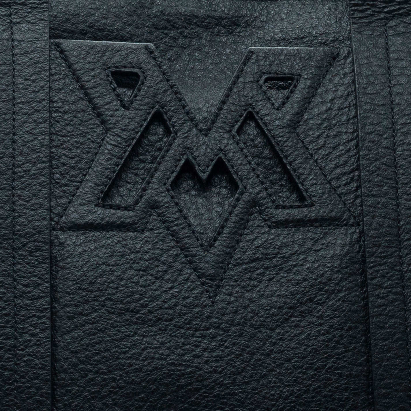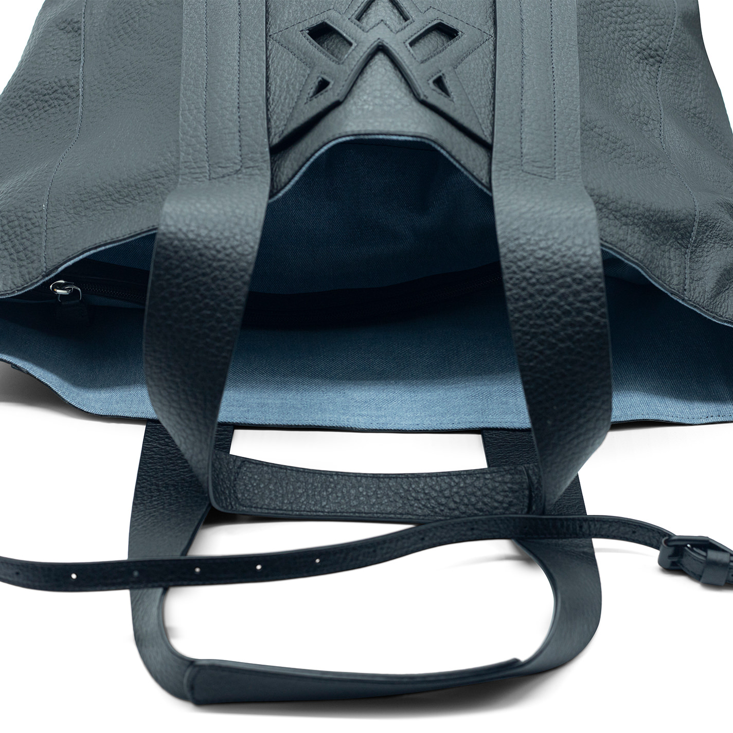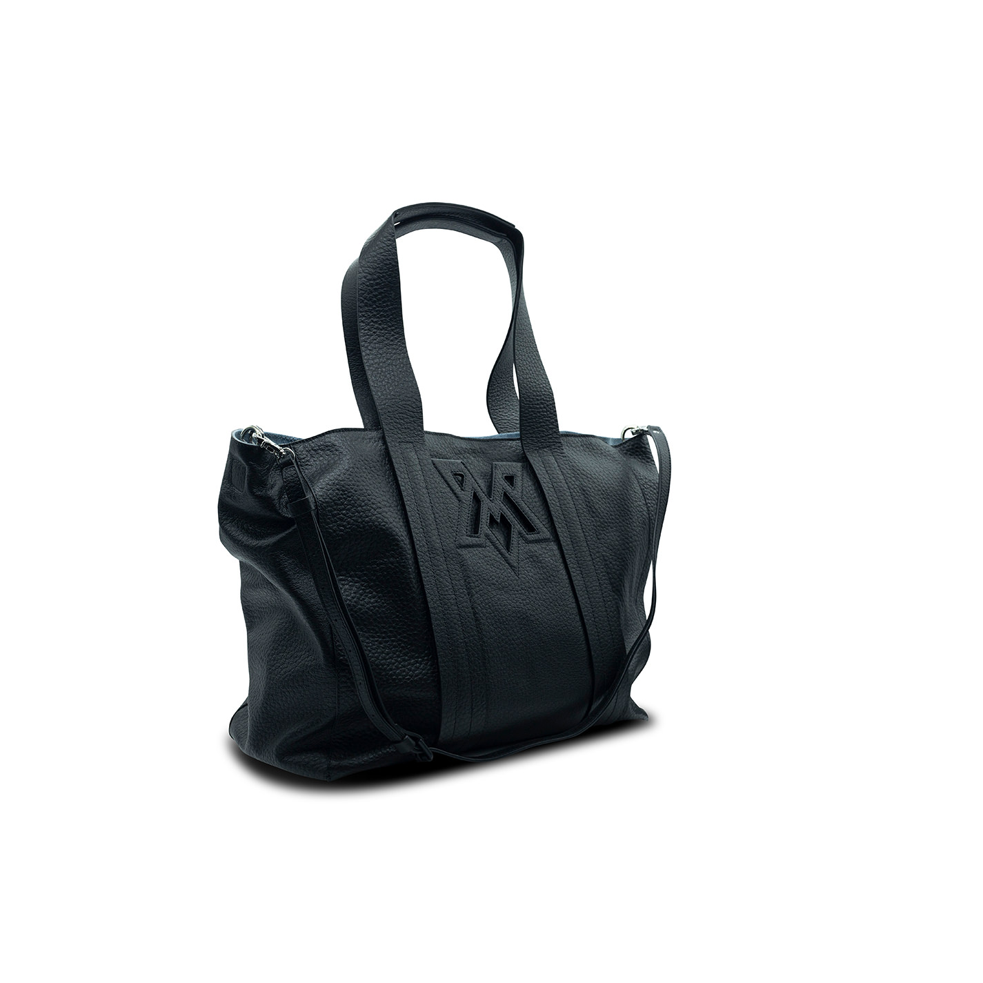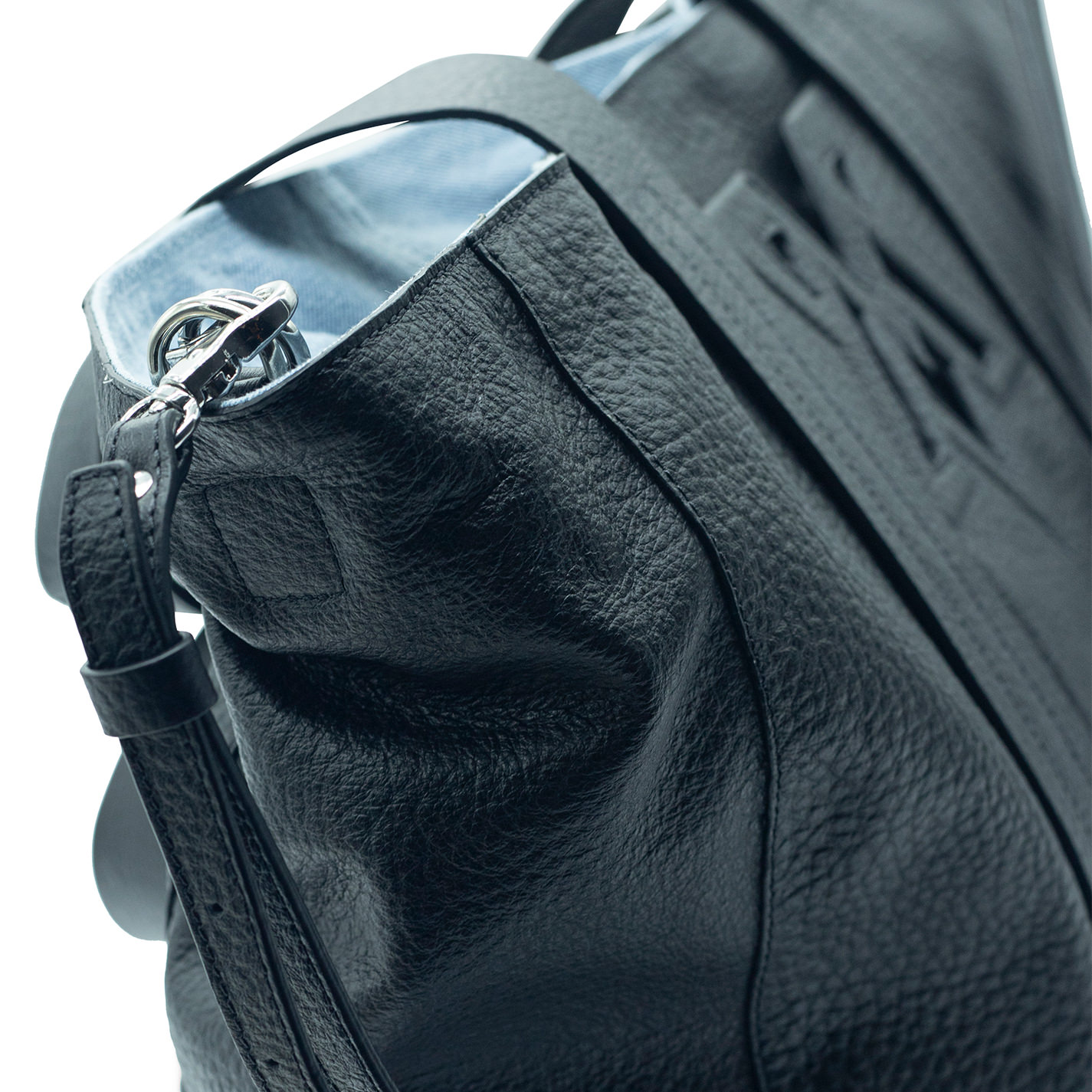 Maxi shopper reverse double nerarealizzata in pelle di vitello a grana grande, completamente foderata in denim all'interno per uso reversibile come seconda borsa. Logo ricamato, tracolla in pelle intercambiabile.