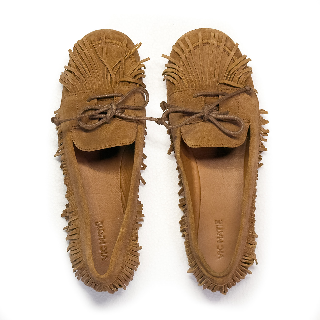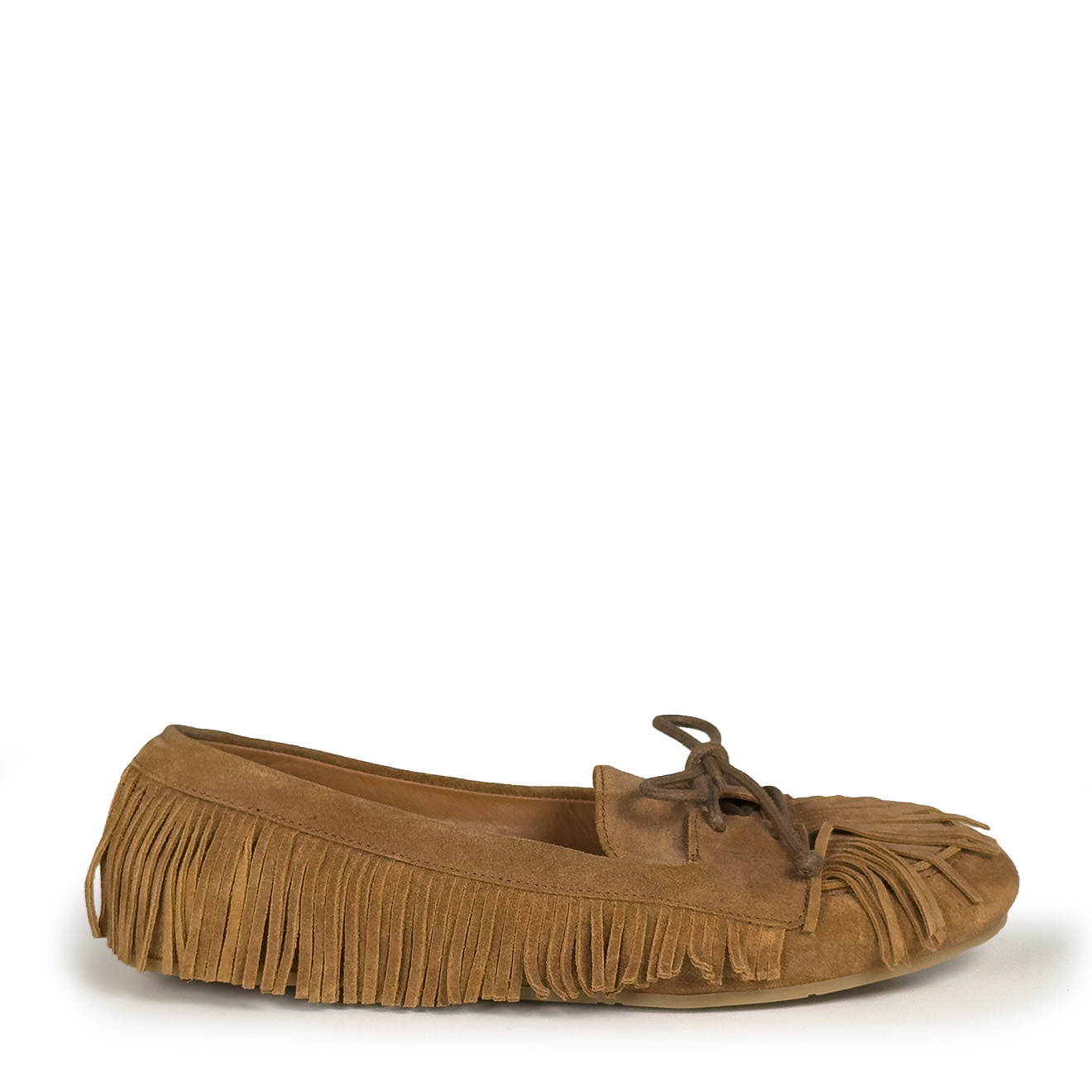 K02_Moka_Mocassino frange cuoio,realizzato in morbida crosta scamosciata con frange decorative e laccetto superiore dal carattere artigianale. Leggero, flessibile e confortevole grazie alla suola in gomma, è perfetto per look casual e boho-chic. Una scarpa versatile che unisce stile, praticità e personalità.