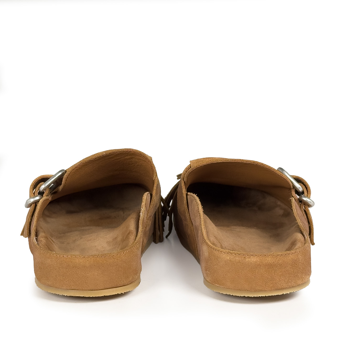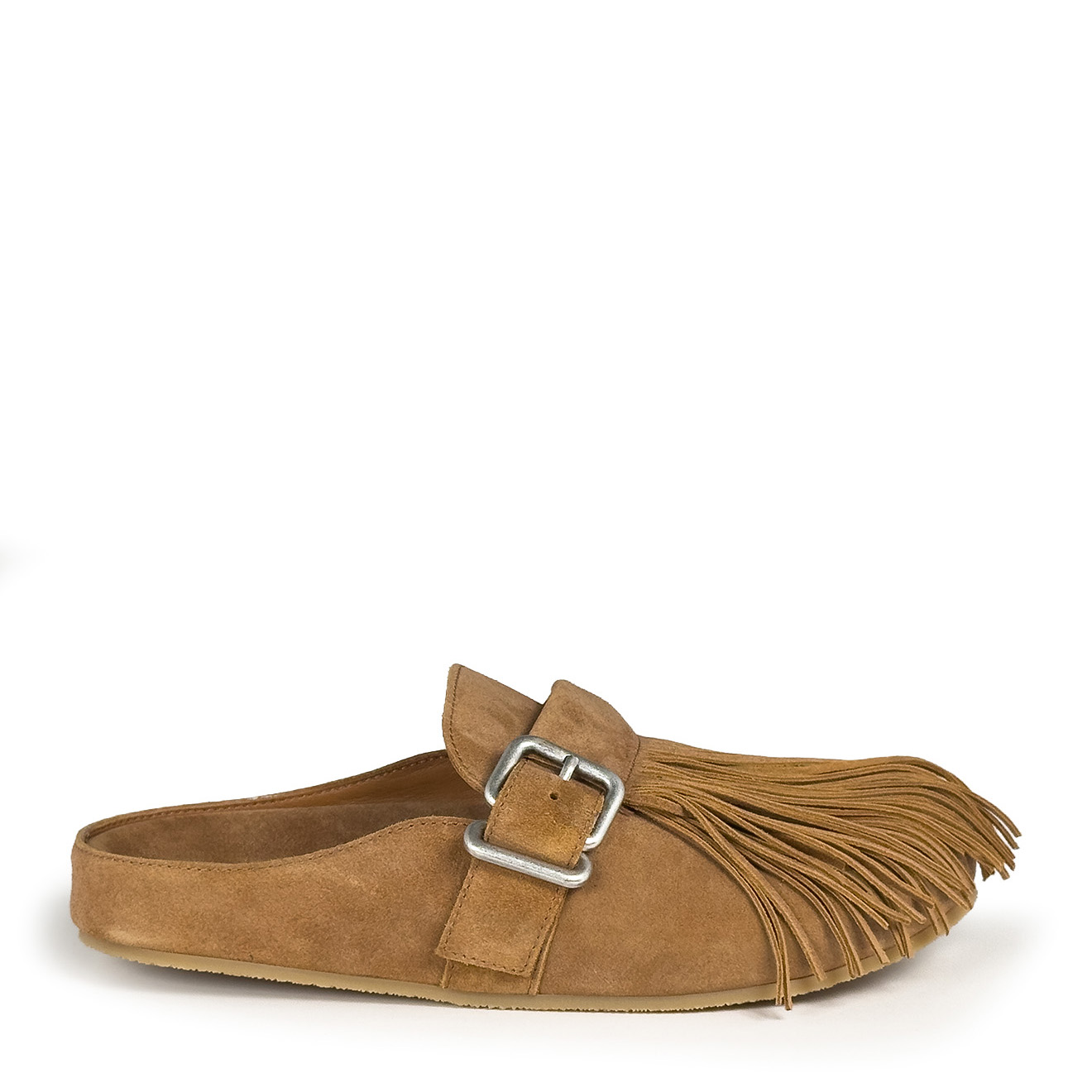 K06_Panorama_Sabot in crosta di vitello cuoio,con frange decorative removibili sulla tomaia, dal look artigianale e contemporaneo. Cinturino laterale regolabile con fibbia in metallo, plantare anatomico integrato e suola piatta in gomma antiscivolo. Comodo, leggero e ricco di personalità: ideale per look informali e tempo libero con stile.