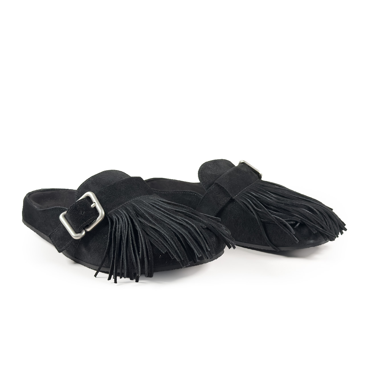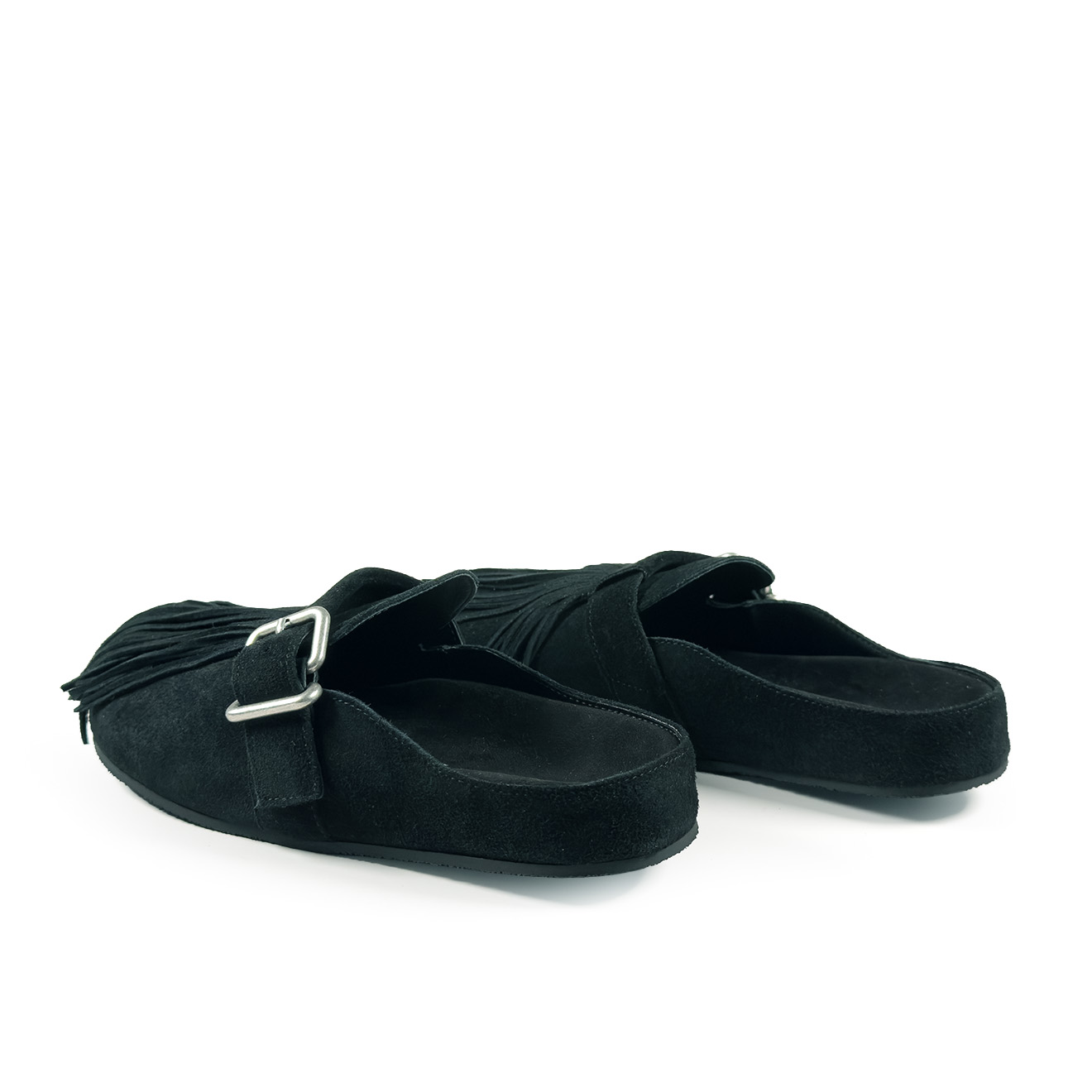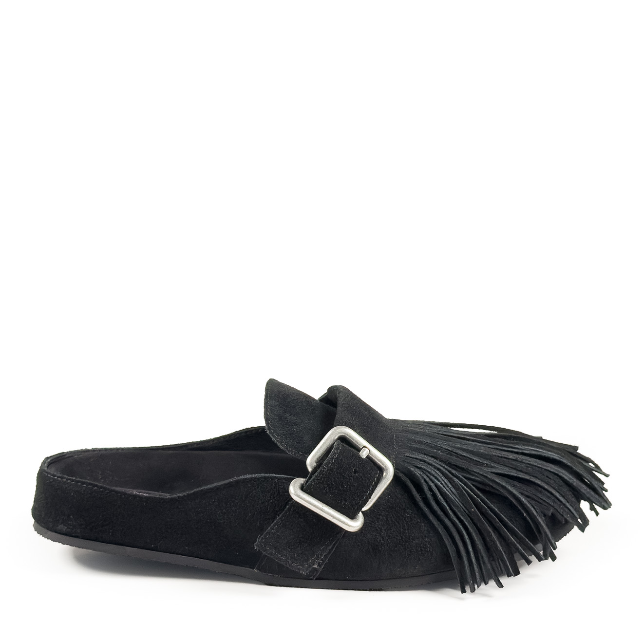 K06_Panorama_Sabot in crosta di vitello nera,con frange decorative removibili sulla tomaia, dal look artigianale e contemporaneo. Cinturino laterale regolabile con fibbia in metallo, plantare anatomico integrato e suola piatta in gomma antiscivolo. Comodo, leggero e ricco di personalità: ideale per look informali e tempo libero con stile.
