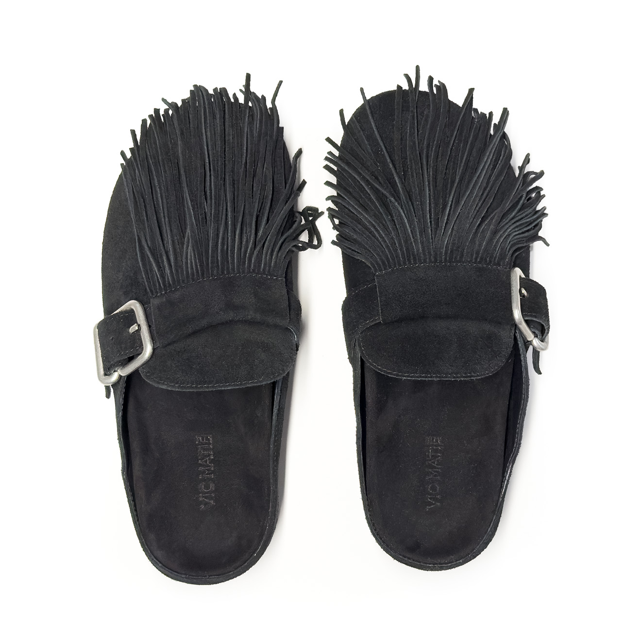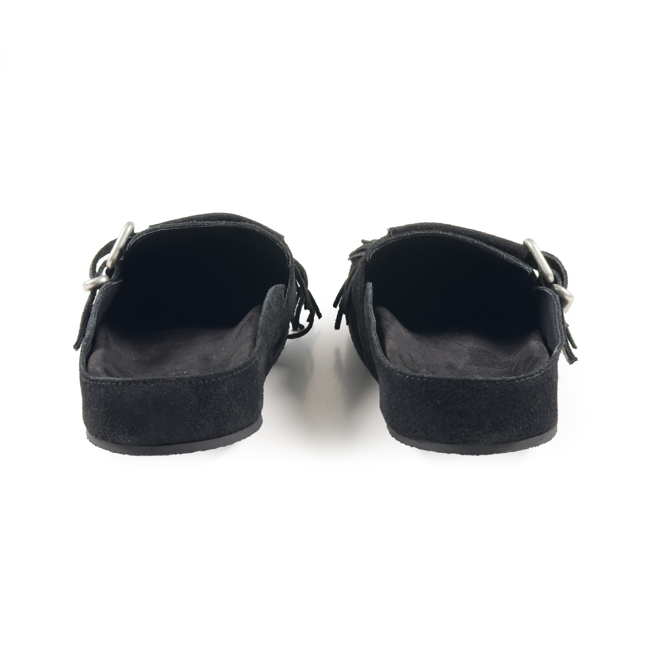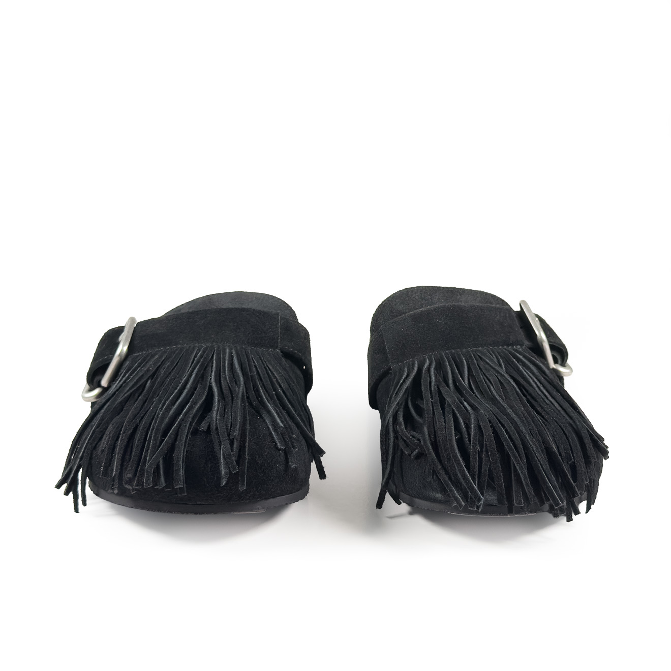 K06_Panorama_Sabot in crosta di vitello nera,con frange decorative removibili sulla tomaia, dal look artigianale e contemporaneo. Cinturino laterale regolabile con fibbia in metallo, plantare anatomico integrato e suola piatta in gomma antiscivolo. Comodo, leggero e ricco di personalità: ideale per look informali e tempo libero con stile.