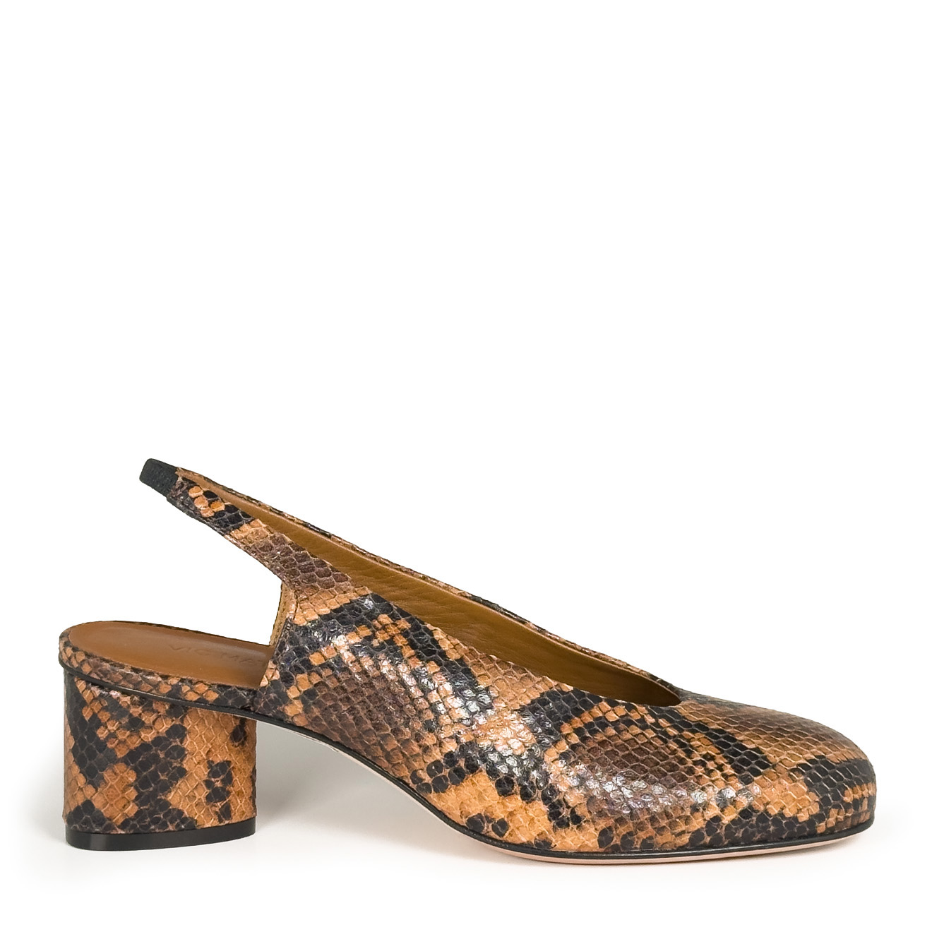 K14_Drop_Slingback cuoio,realizzata in pelle con stampa effetto pitone con linea essenziale e punta arrotondata. Il cinturino posteriore assicura una calzata stabile e confortevole, mentre il tacco medio a blocco garantisce equilibrio e praticità. Un modello dal design pulito e contemporaneo, ideale per look quotidiani raffinati e outfit eleganti dal gusto minimal.