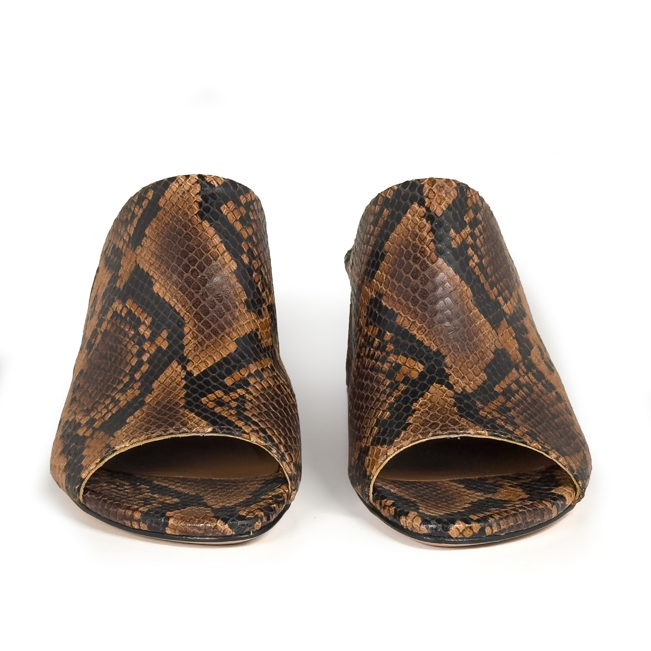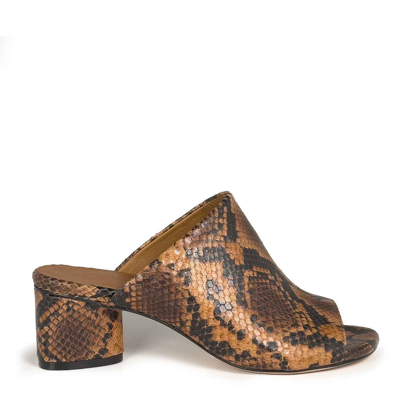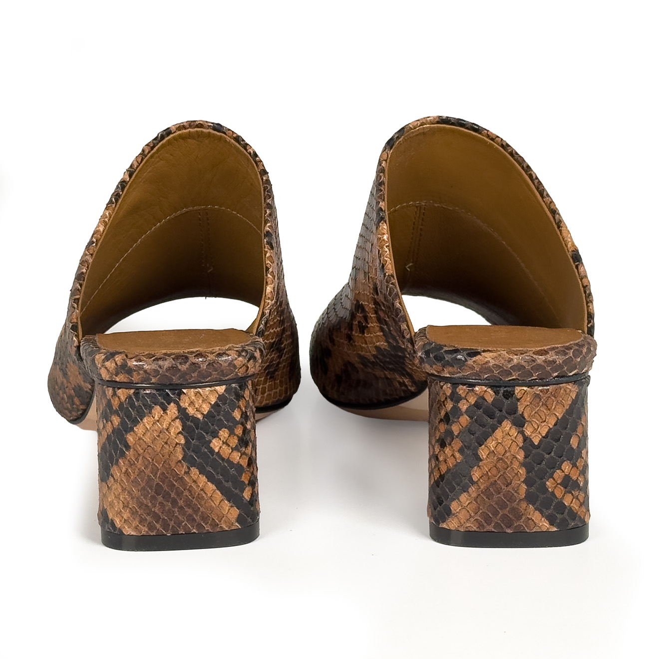 K16_Drop_Mule cuoio,realizzata in pelle con stampa effetto pitone, con design minimal e linea pulita. La fascia ampia avvolge il piede offrendo comfort e stabilità, mentre il tacco medio a blocco garantisce equilibrio e praticità. Un modello contemporaneo e versatile, ideale per look quotidiani raffinati e outfit dal gusto moderno.