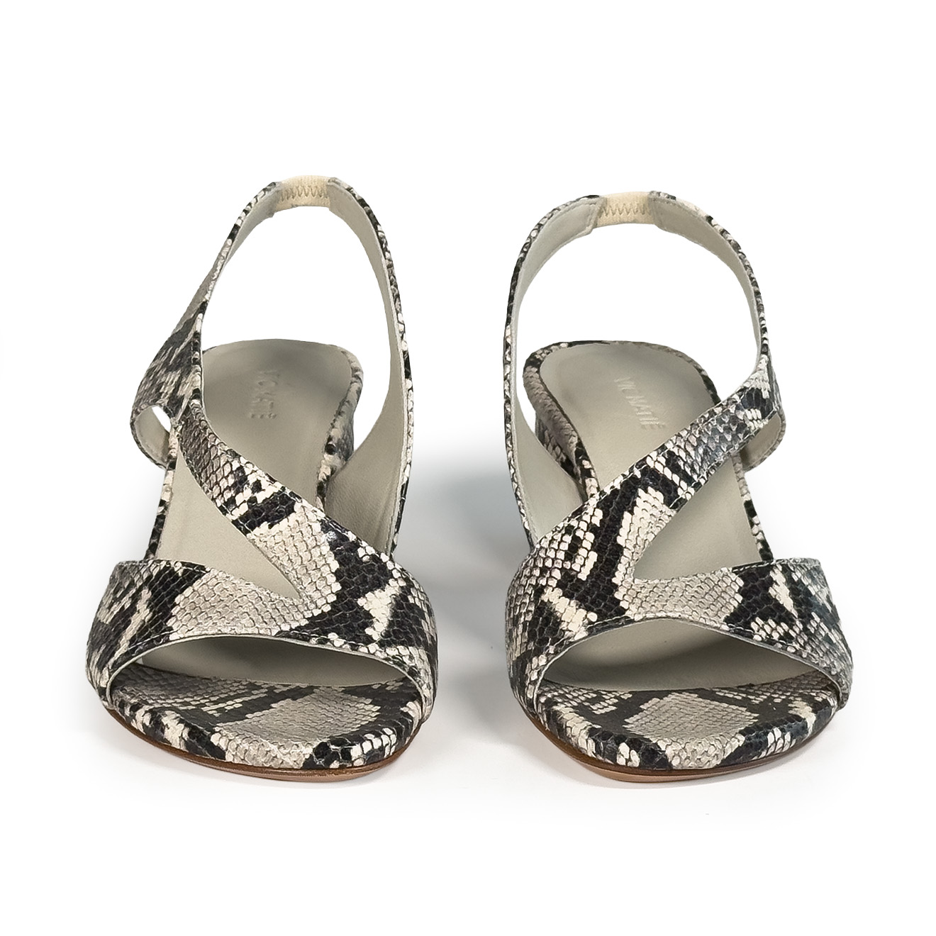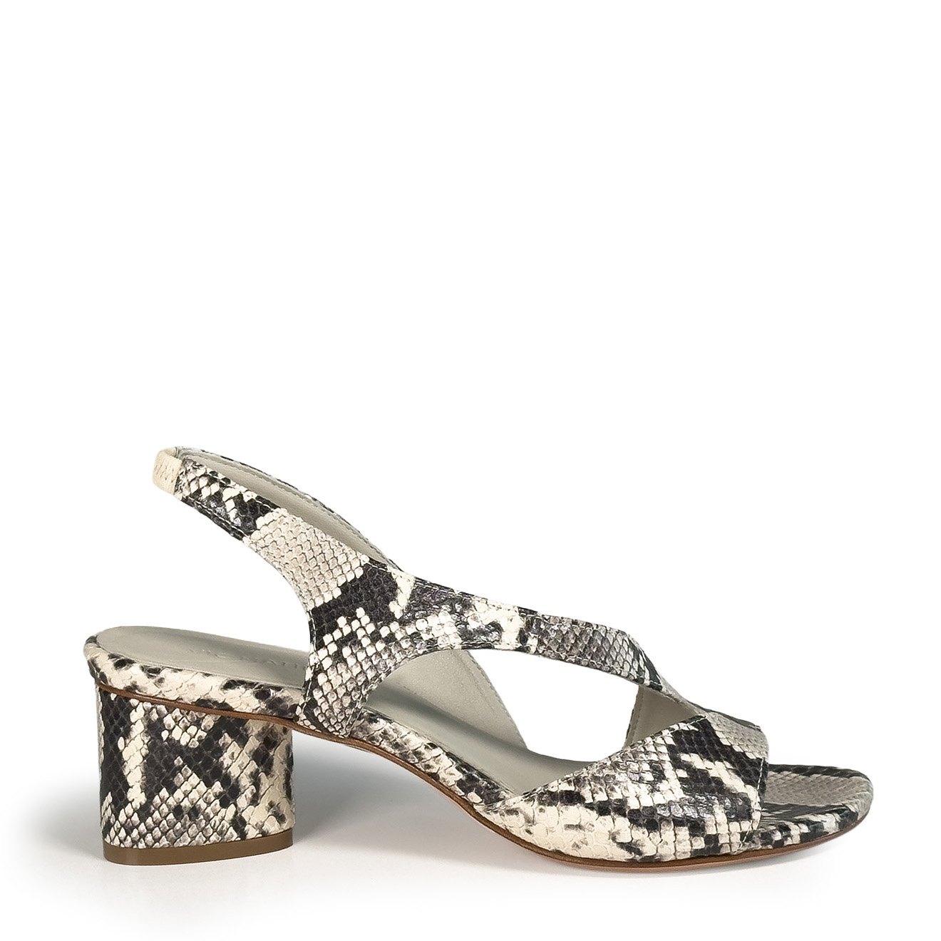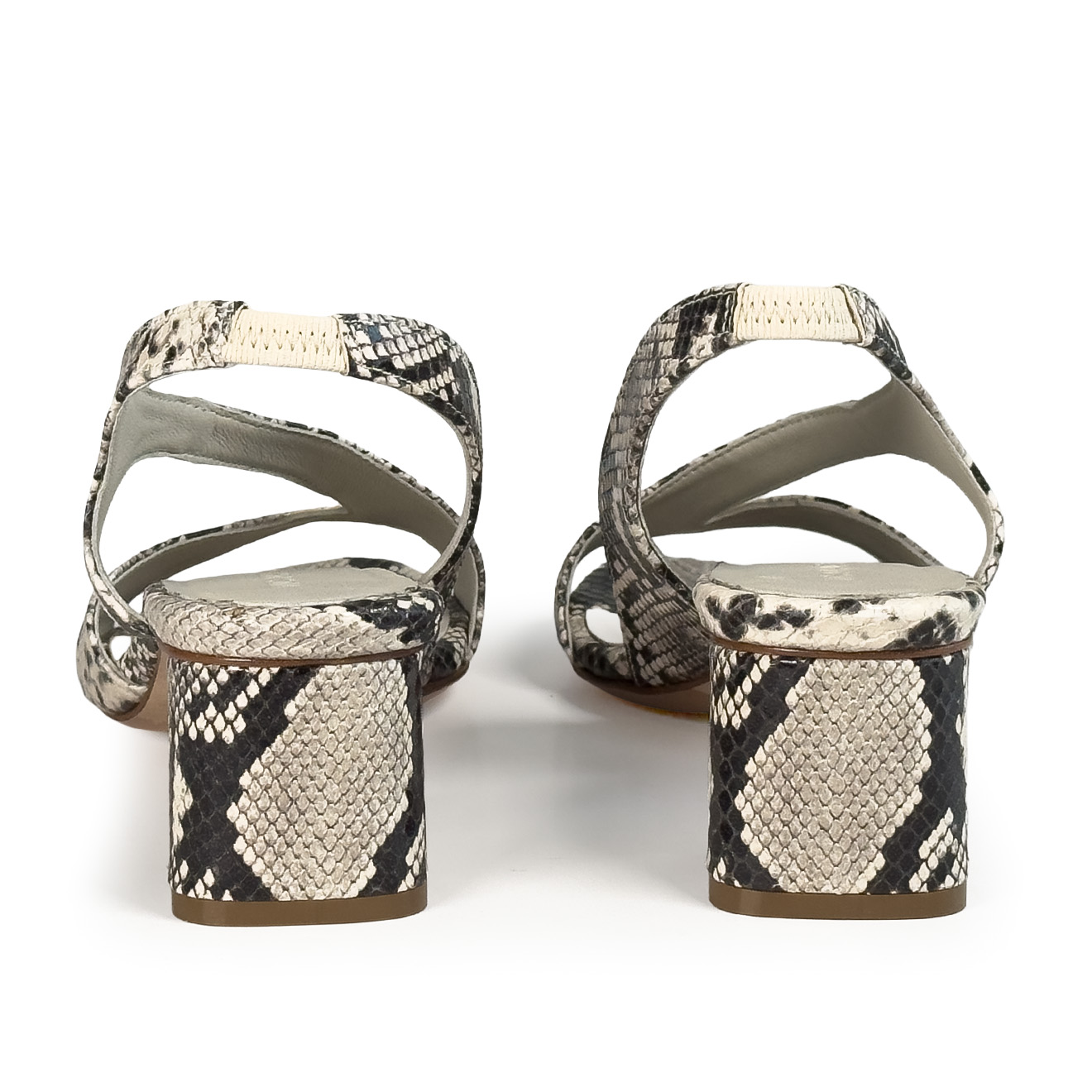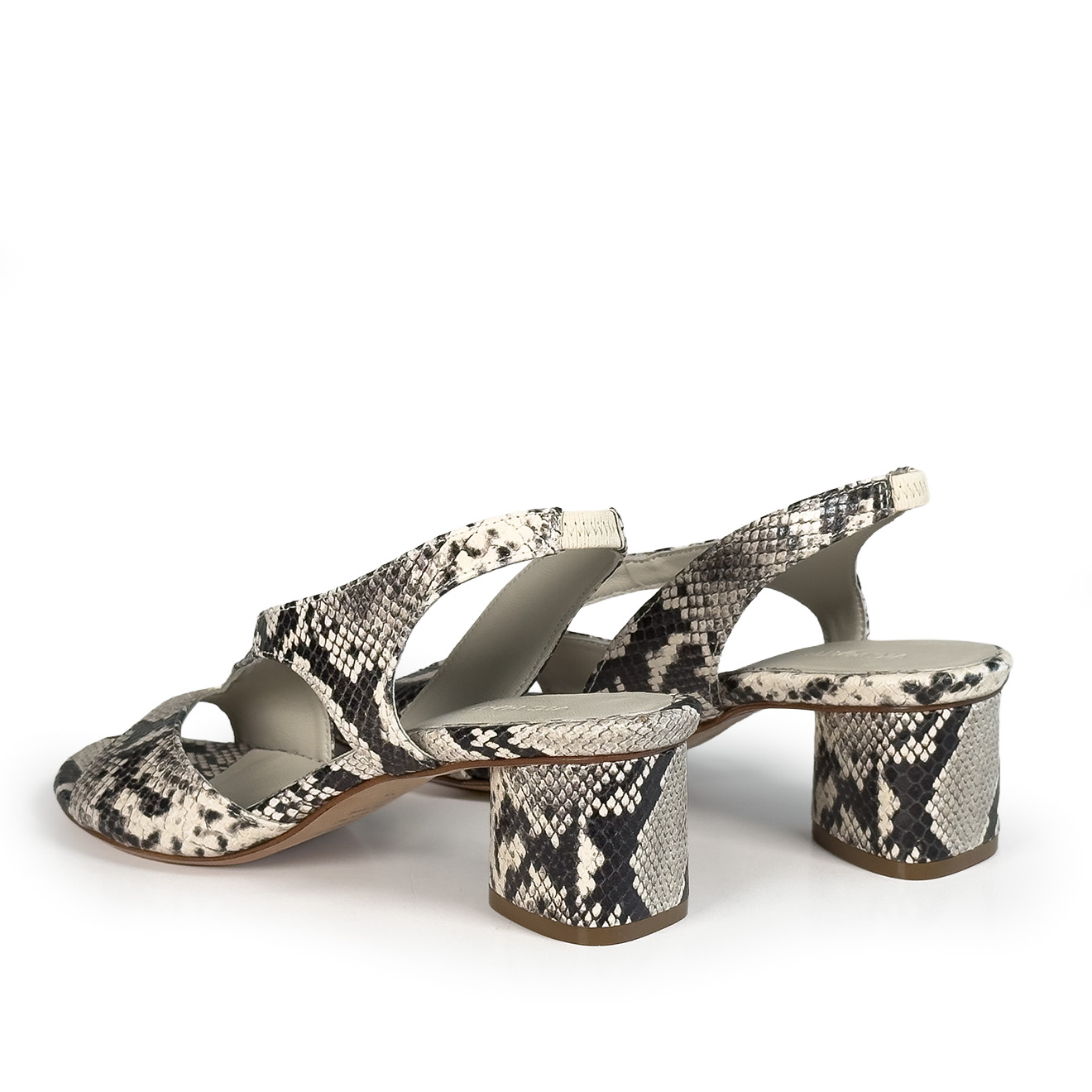 K16_Drop_Sandalo ghiaccio in pelle con stampa effetto pitone,design essenziale e linee incrociate sul fronte. Il cinturino posteriore assicura una calzata stabile, mentre il tacco medio a blocco garantisce comfort ed equilibrio. Un modello pulito e contemporaneo, ideale per look estivi raffinati e outfit quotidiani dal gusto minimal.