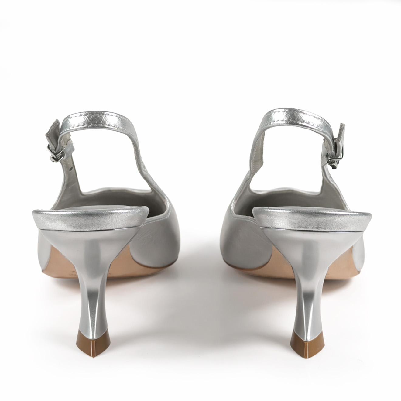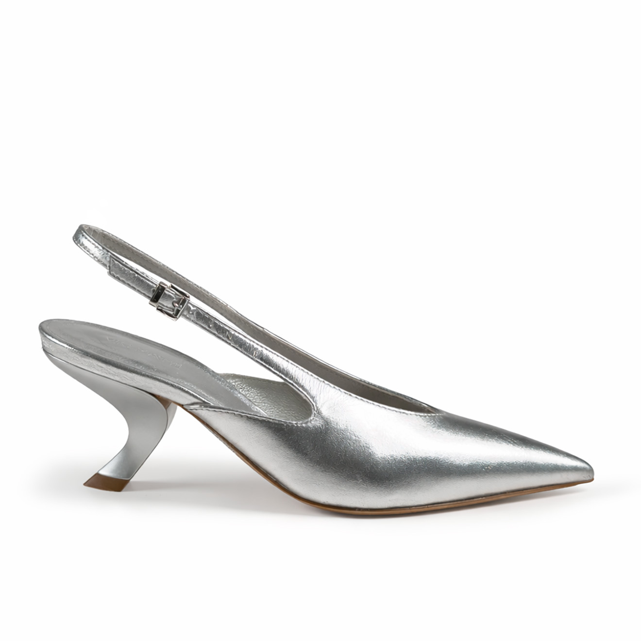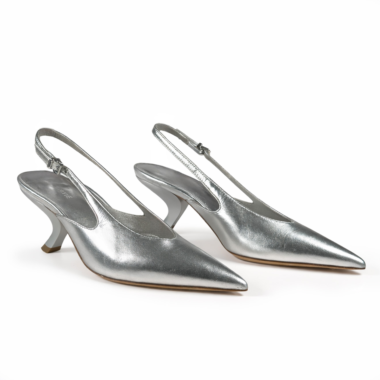 K18_Apostrophe_Chanel argento,realizzata in morbida nappa laminata, con cinturino alla caviglia regolabile tramite fibbia per una calzata precisa e femminile. Il tacco fasciato in pelle, dalla forma scultorea ispirata a un apostrofo, dona carattere e movimento al design. Completa di suola in cuoio e lavorazione artigianale Made in Italy. Un modello sofisticato e femminile, ideale per outfit eleganti e look moderni dal carattere distintivo.