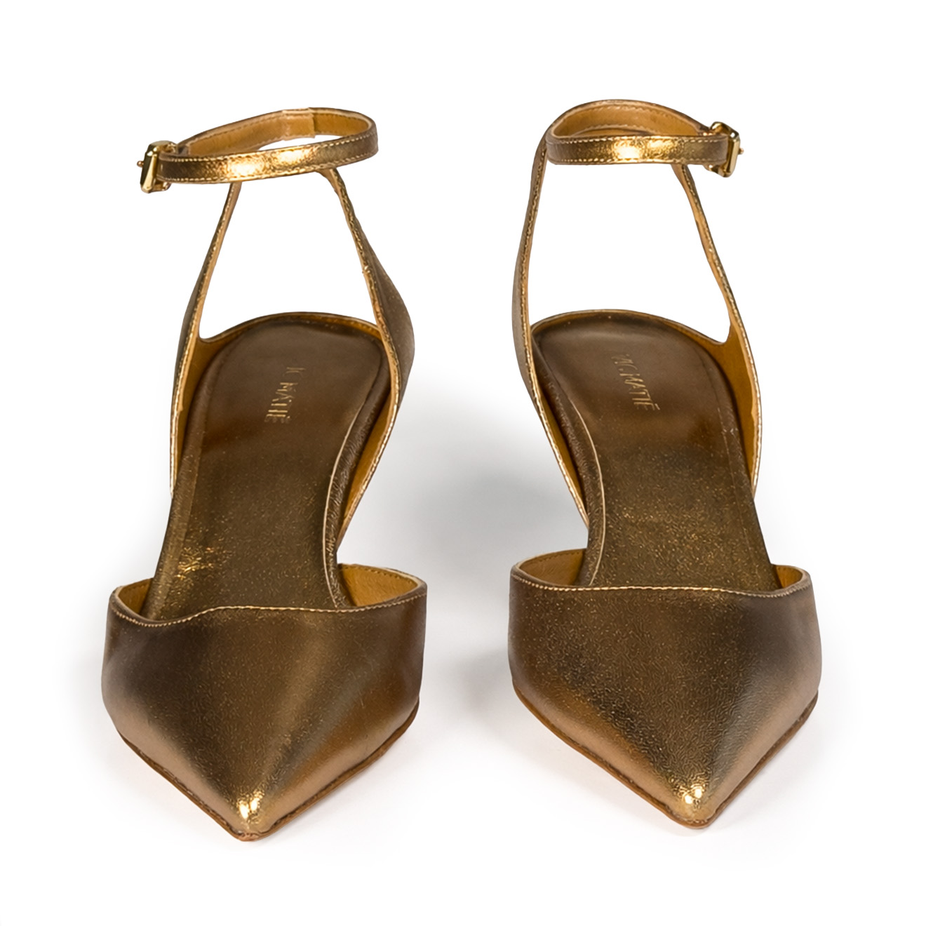 K18_Apostrophe_Décolleté bronzo,realizzata in morbida nappa con punta affusolata e cinturino alla caviglia regolabile. Il tacco fasciato in pelle, dalla forma scultorea ispirata a un apostrofo, dona carattere e movimento al design. Linea essenziale, suola in cuoio e finitura artigianale di alta qualità. Ideale per look serali e outfit minimal-chic.