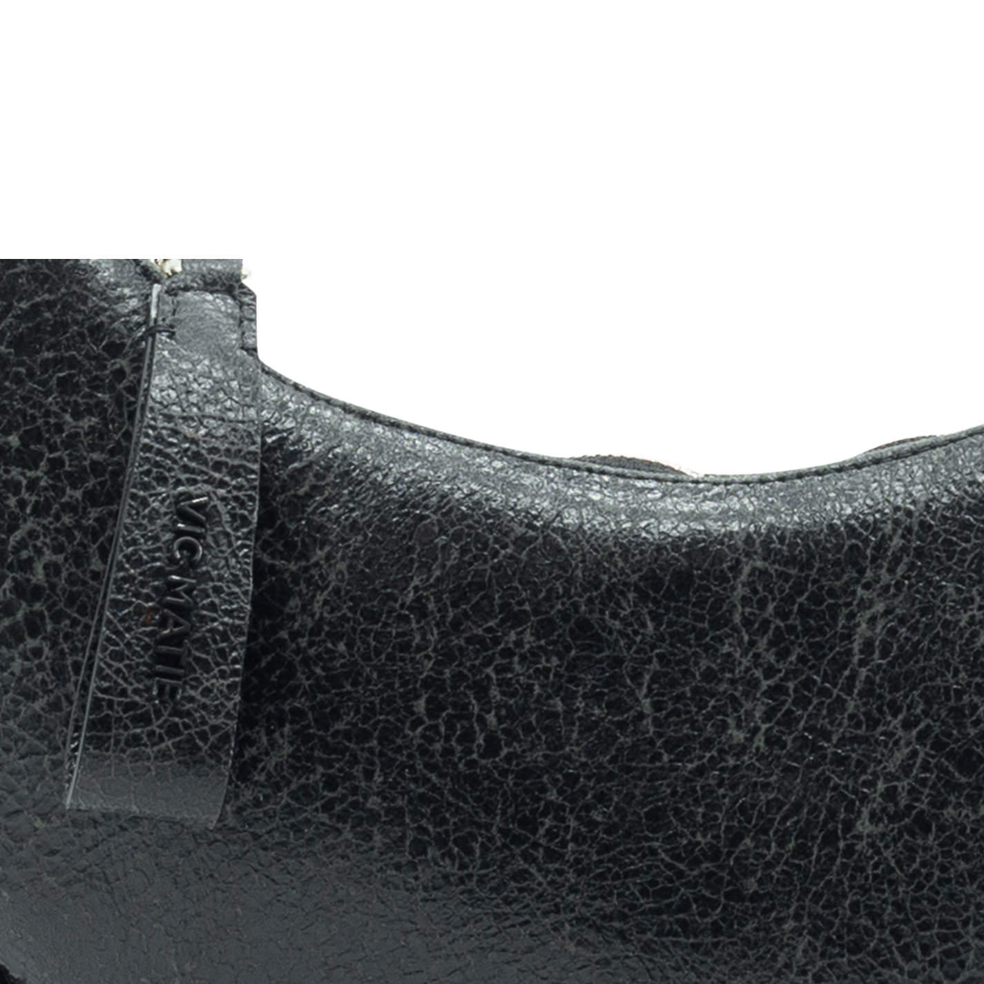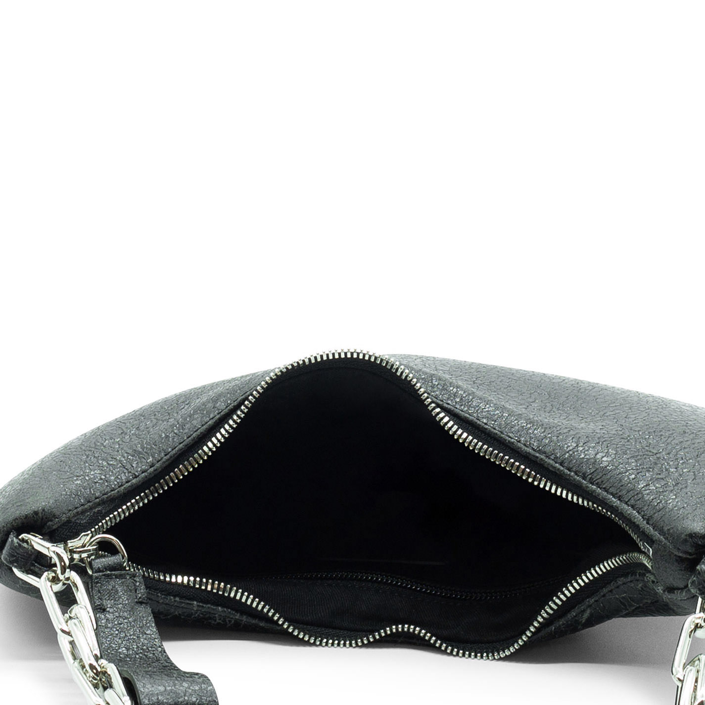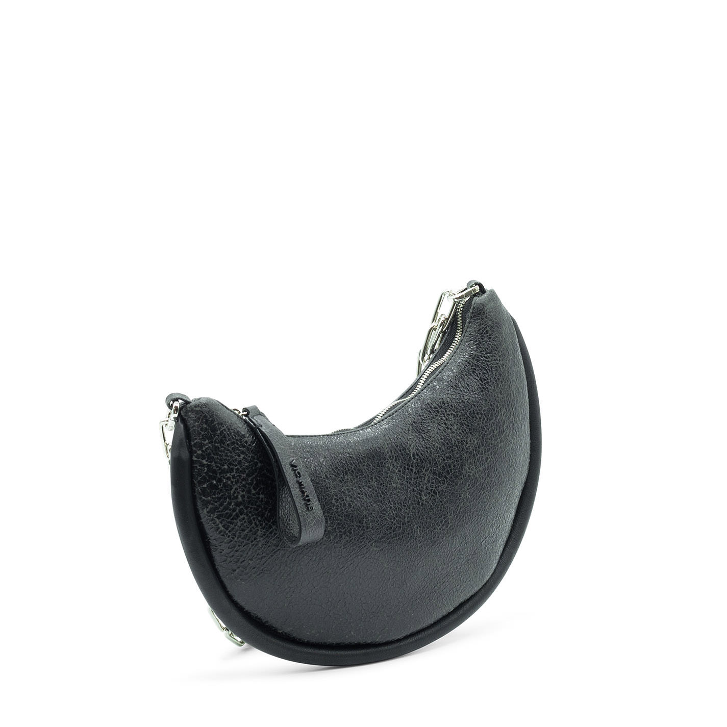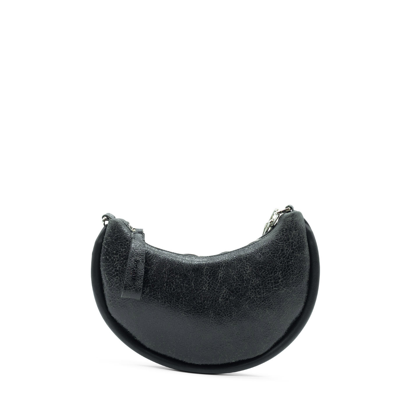 Borsa mezza luna effetto screpolato grigia "punk style "anni 90,con maxi profilo, tracolla di catena metallica staccabile. Chiusura zip.