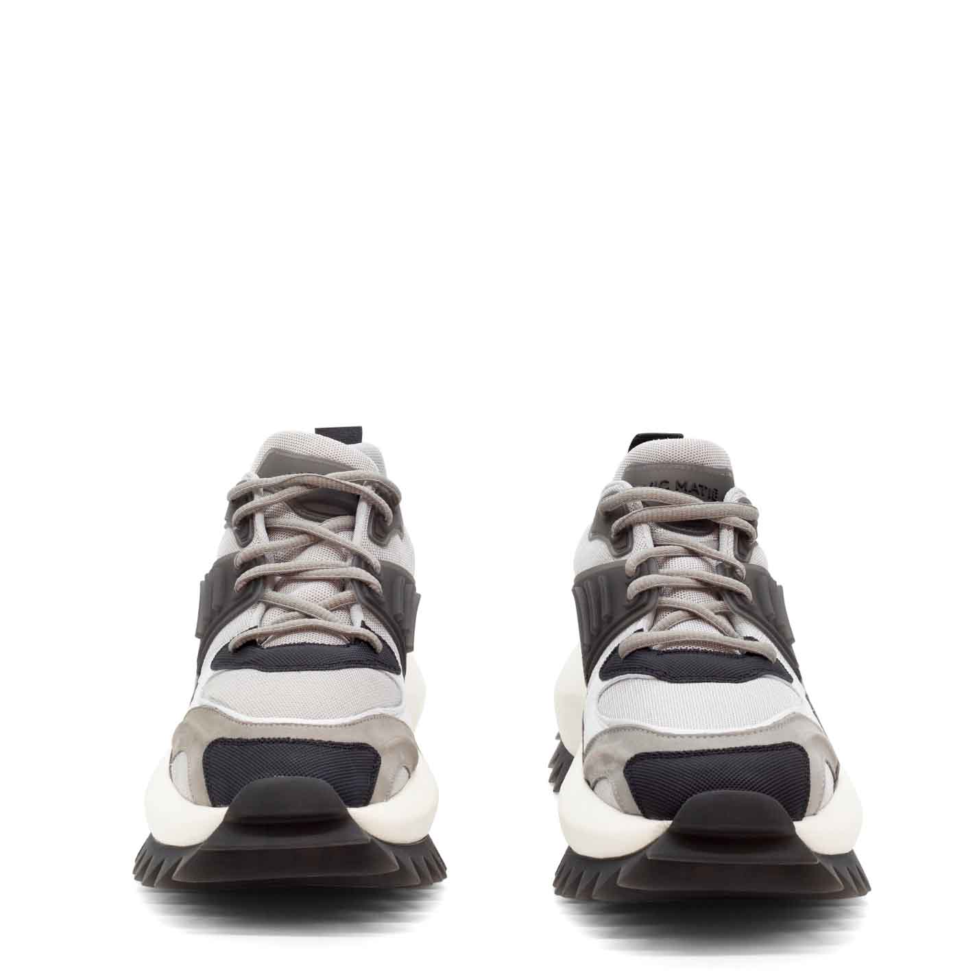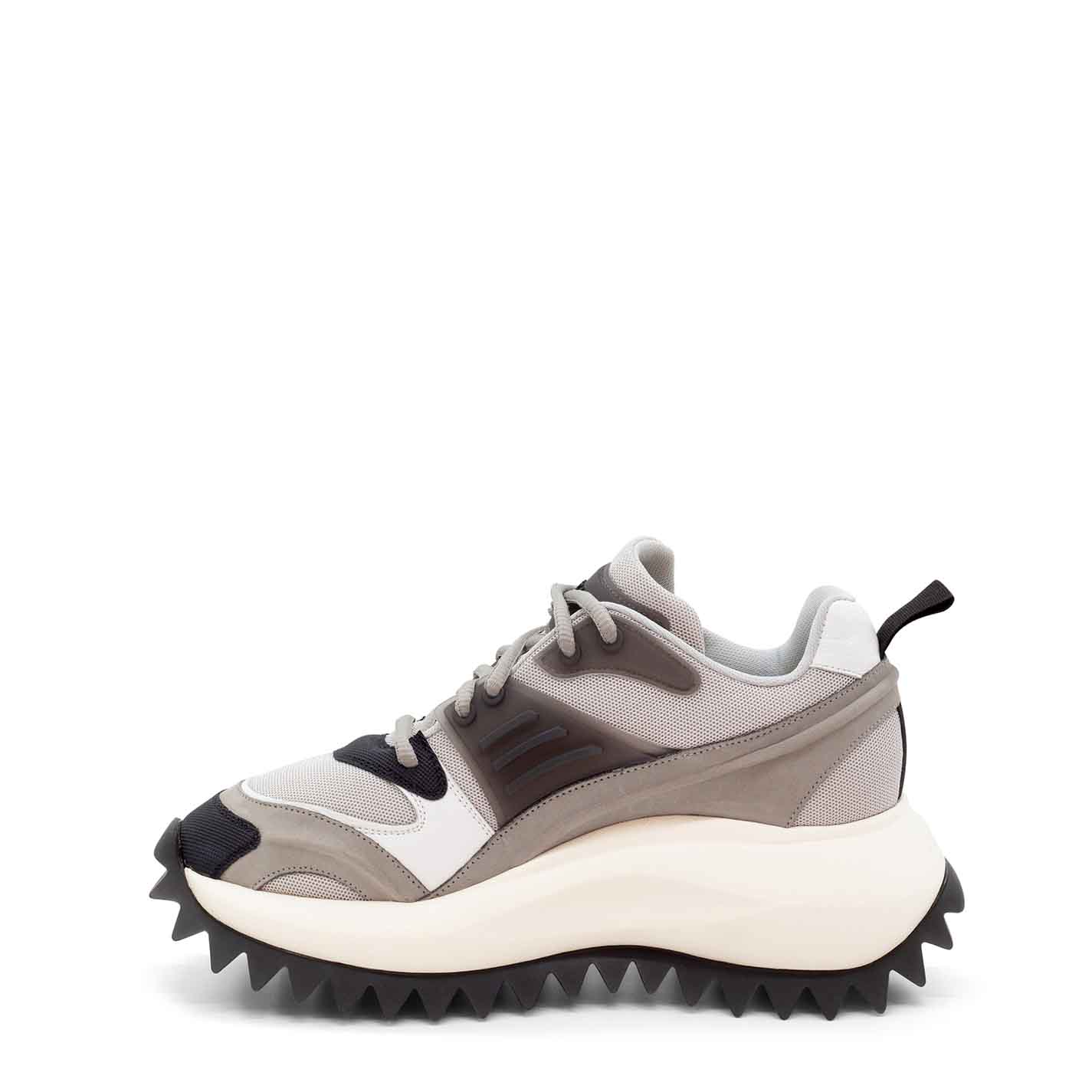 M2m running bianca/grigia realizzata in nabuk, pelle e rete con accessori,passalacci e rilievi in gomma ,che caratterizzano anche la tomaia. Suola monoblocco xl extralight,logata con riporto in gomma e battistrada con maxi spikes , plantare anatomico rivestito in puro cotone. Made in Italy.