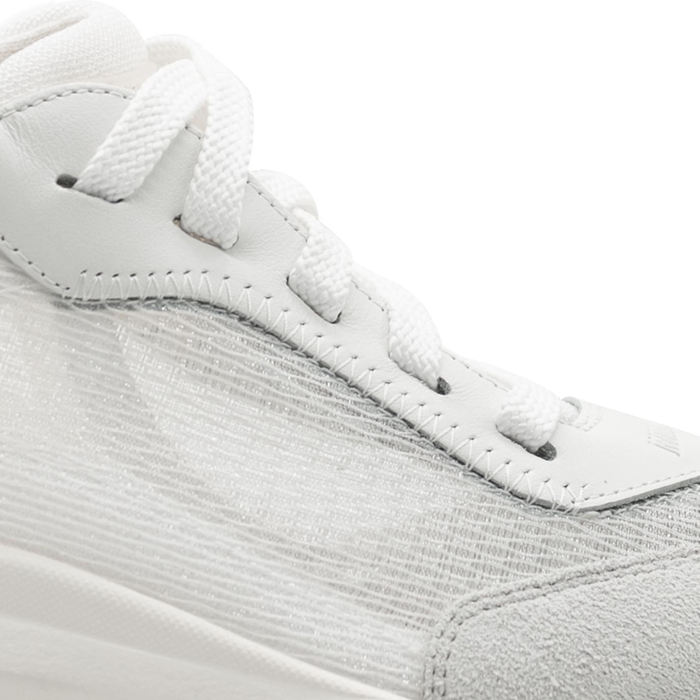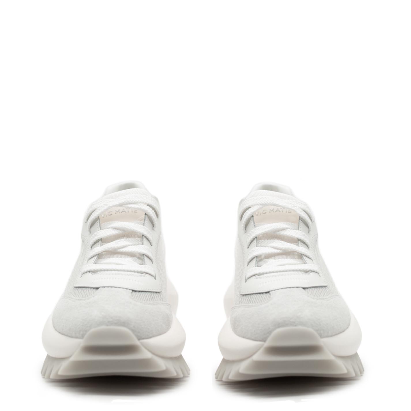 M2m scarpa allacciata bianca ,realizzata in crosta di vitello e rete trasparente, con cuciture a contrasto. Suola monoblocco xl extralight,logata con riporto in gomma e battistrada con maxi spikes , plantare anatomico rivestito in puro cotone. Made in Italy.