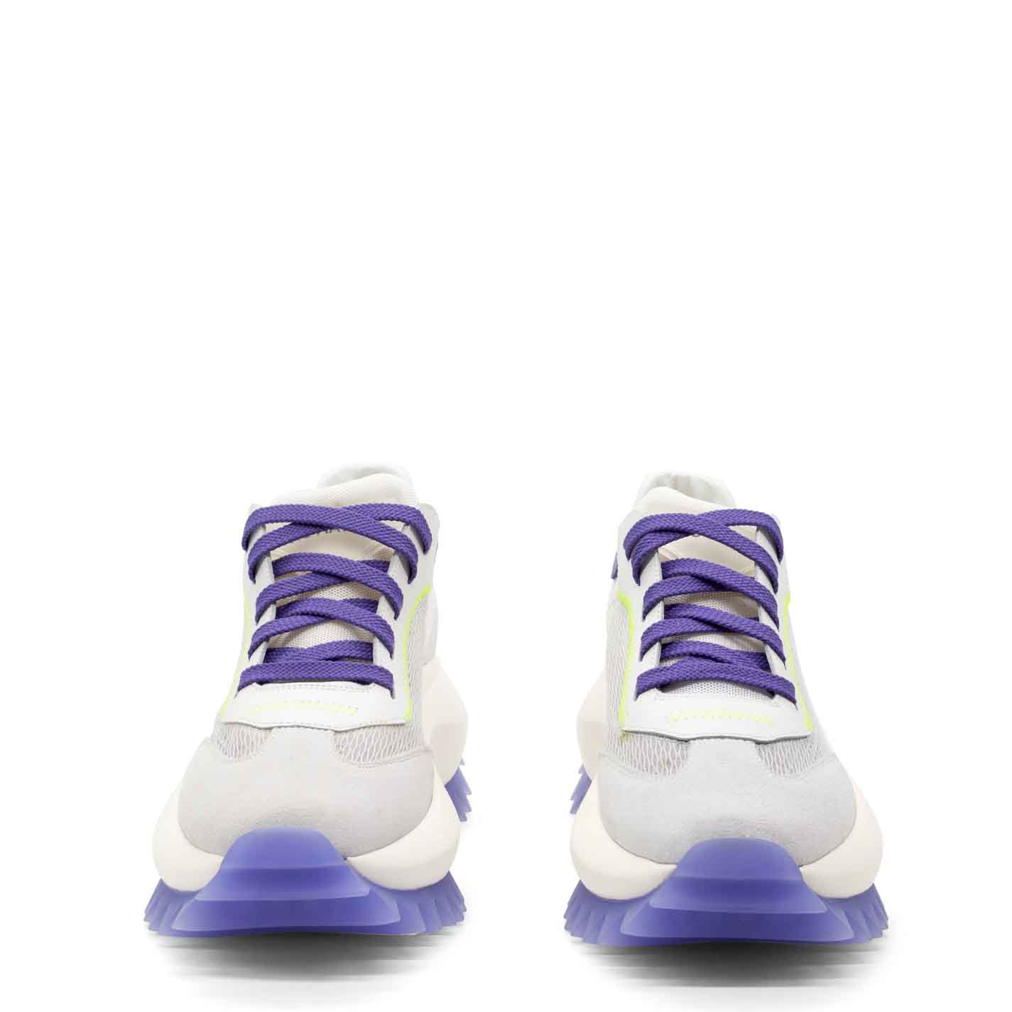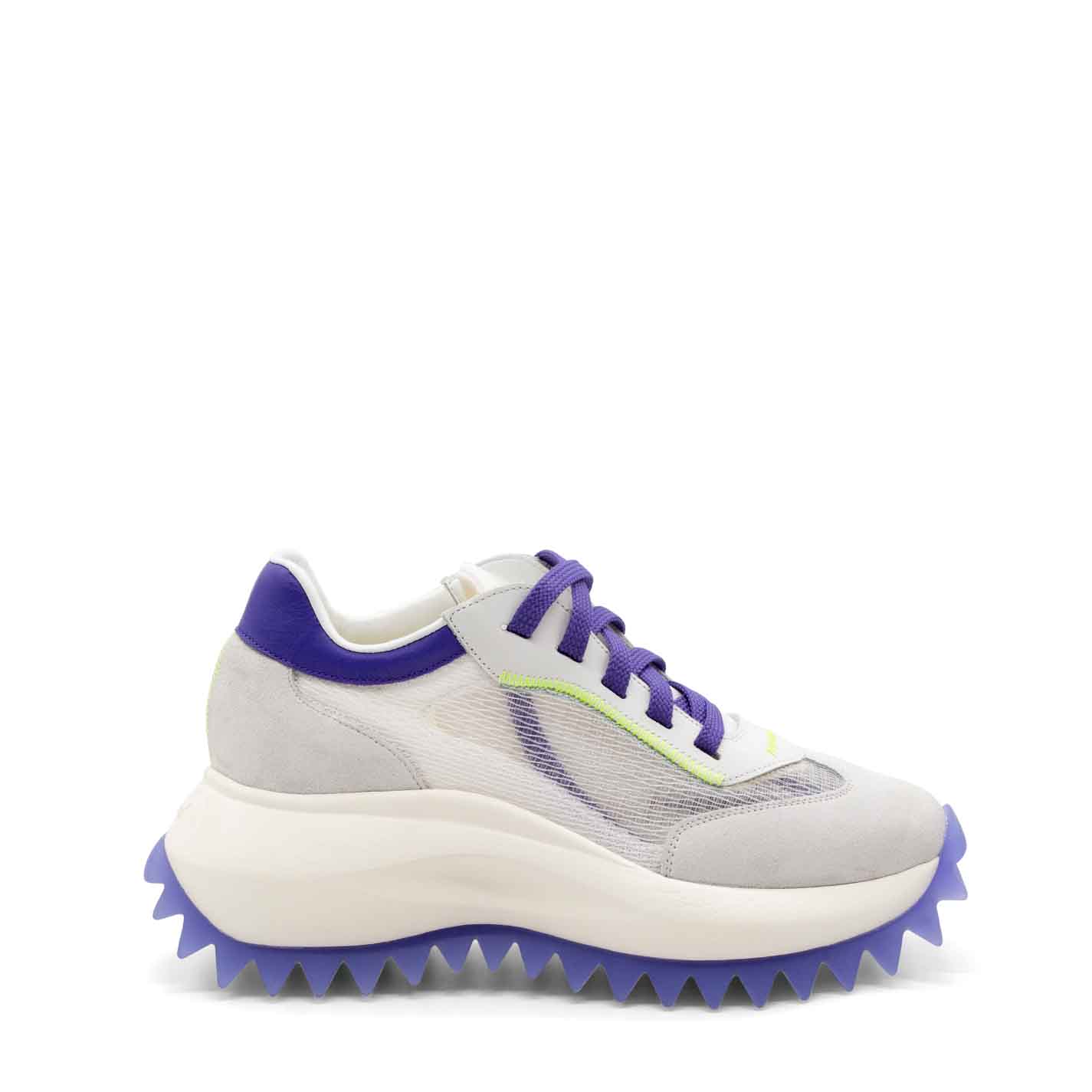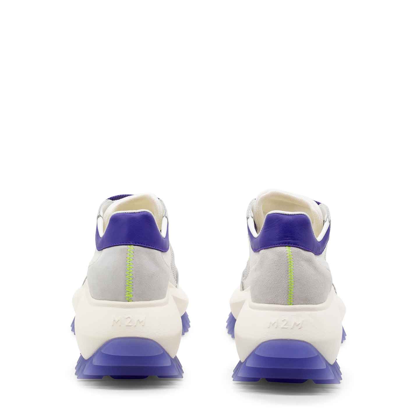 M2m scarpa allacciata bianca/viola ,realizzata in crosta di vitello e rete trasparente, con cuciture a contrasto. Suola monoblocco xl extralight,logata con riporto in gomma e battistrada con maxi spikes , plantare anatomico rivestito in puro cotone. Made in Italy.