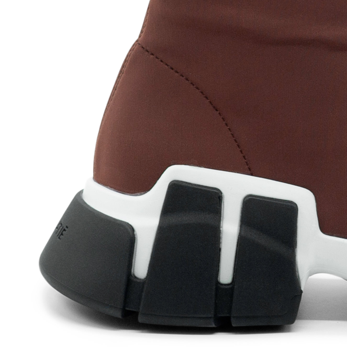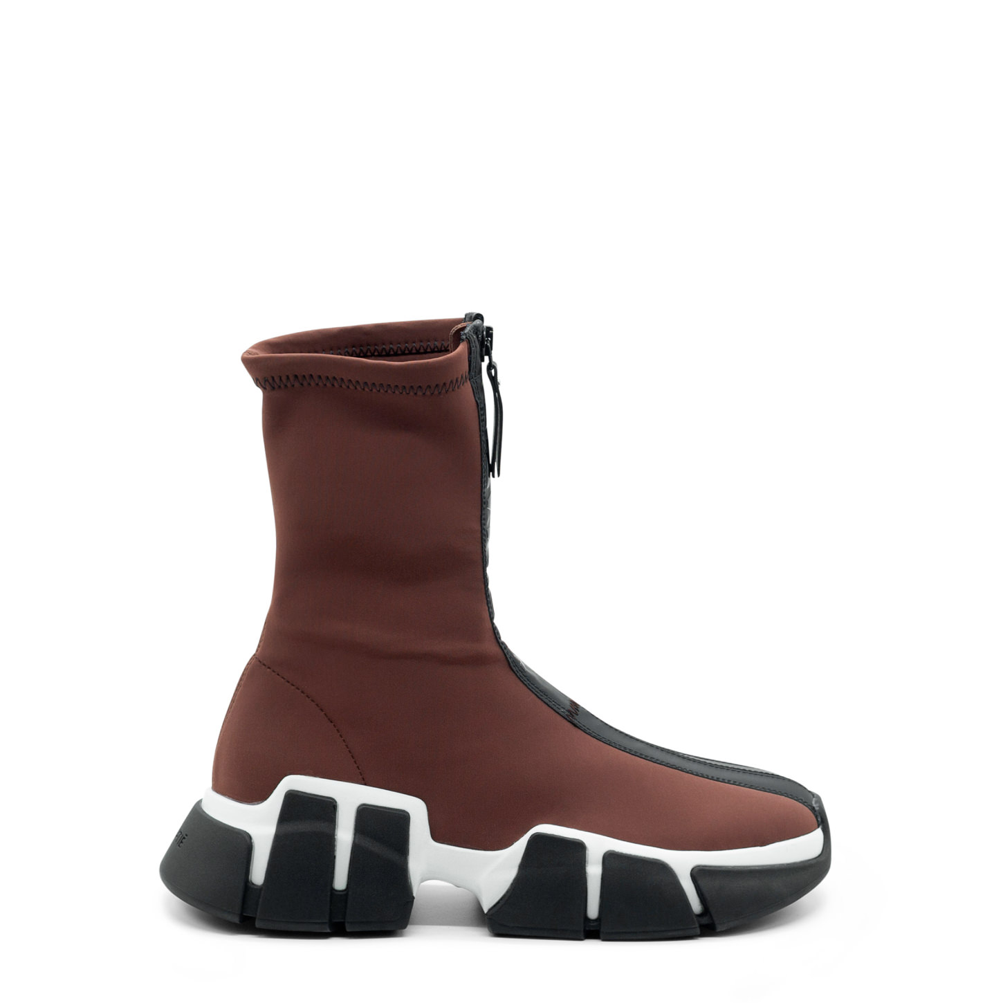 Mano tronchetto zip marrone bruciato in doppia lycra stretch, con zip logata e gommata sul davanti. Suola monoblocco in gomma con tacche, che si ispira ad una "mano "che tiene una scarpa. Morbido plantare ricoperto pelle. Made in Italy.