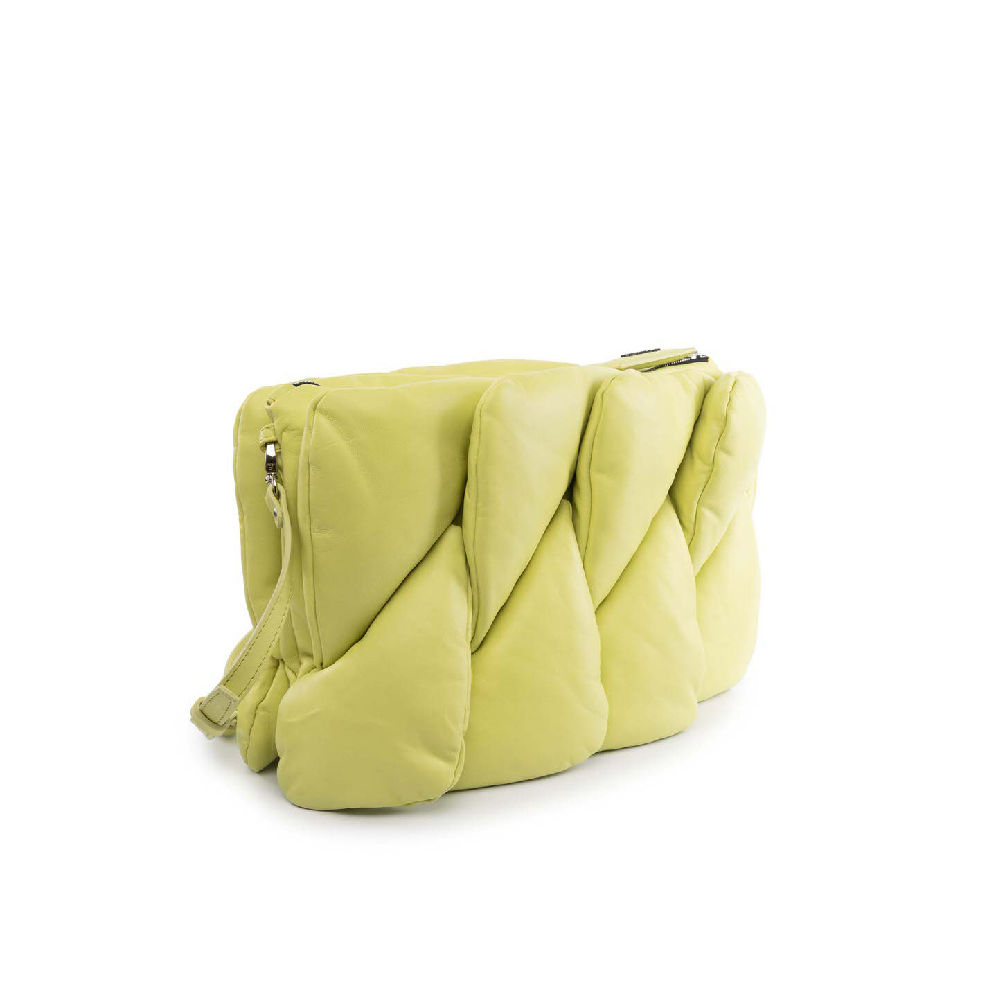 Tracolla lime realizzata in morbida nappa, con pareti imbottite ad effetto maxi squame, tracolla staccabile e regolabile, chiusura con zip;tirante in pelle impreziosito da logo metallico.