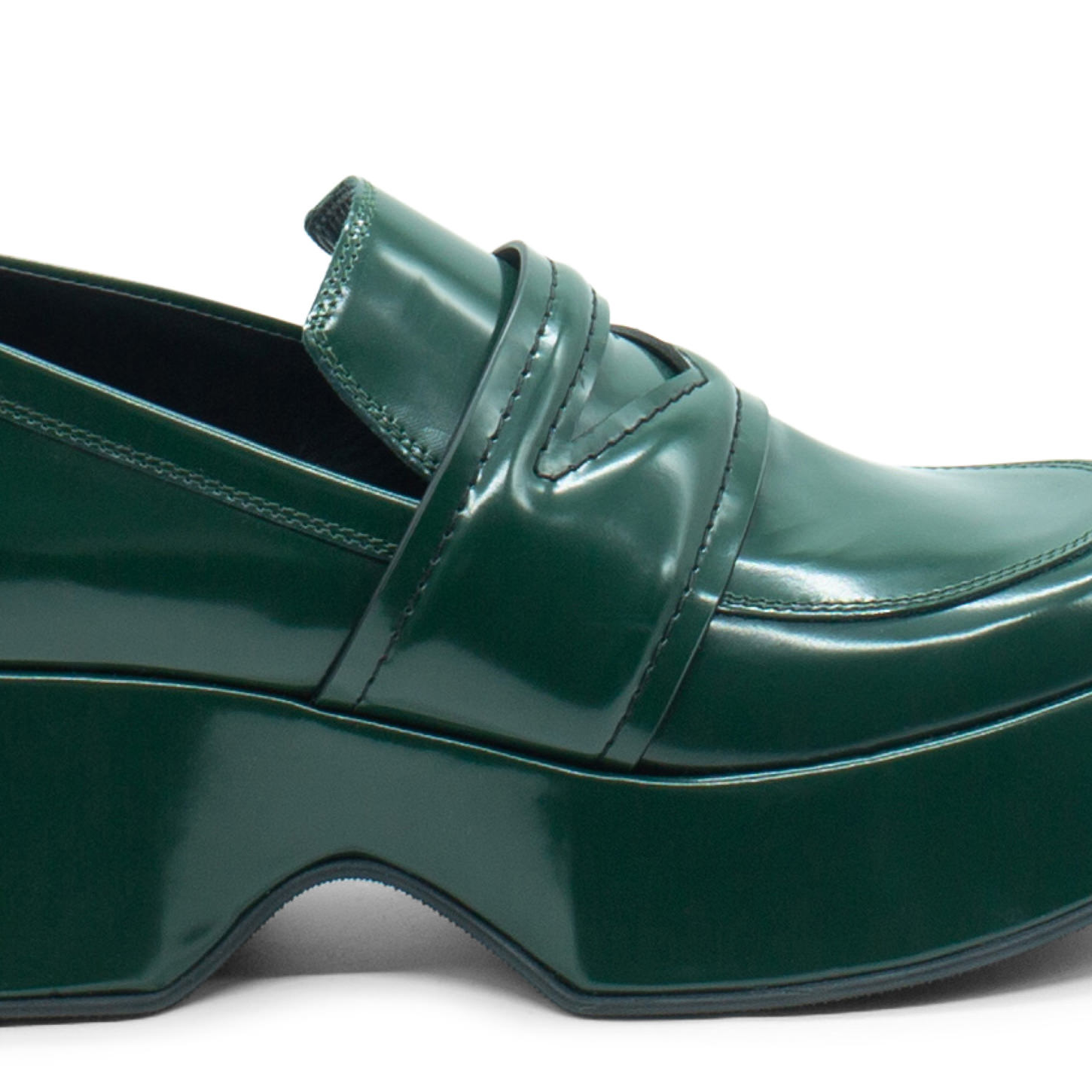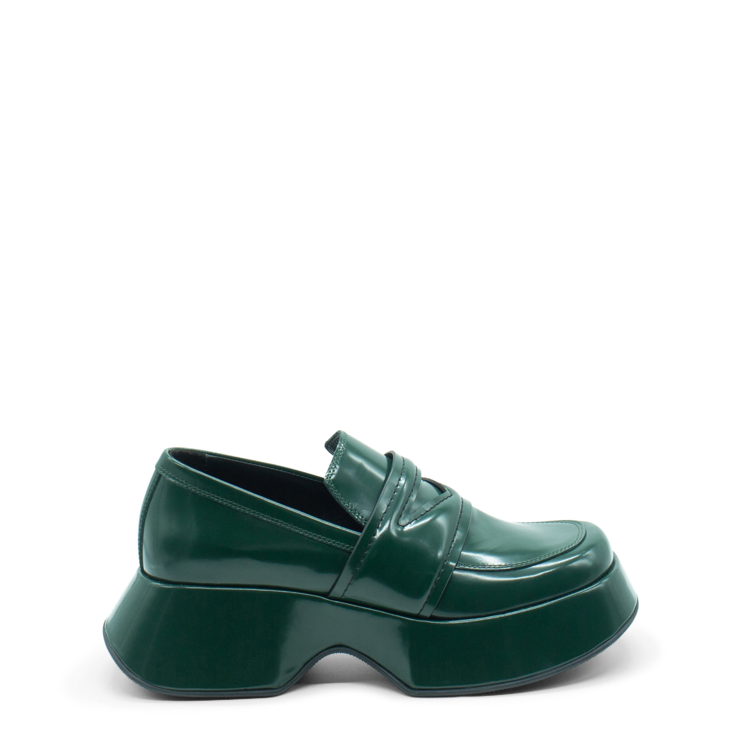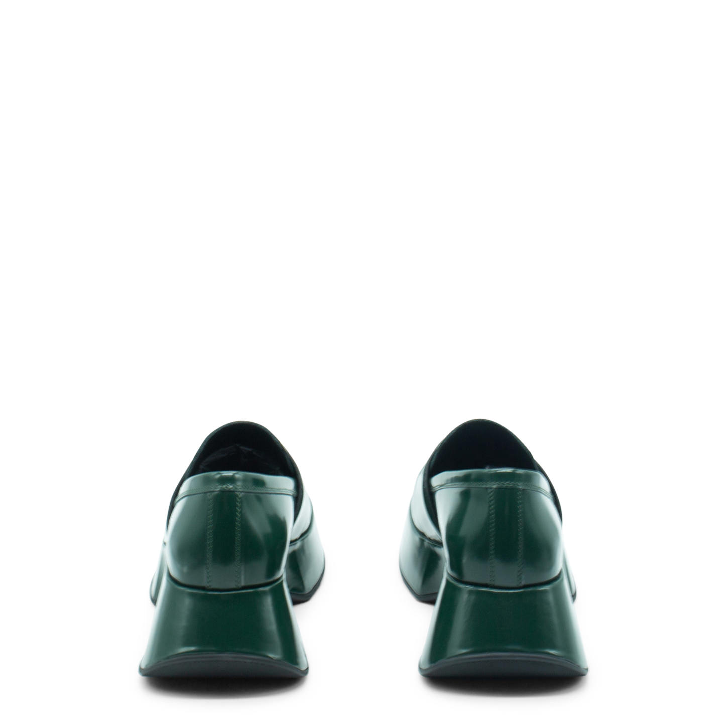 Mini yoko mocassino verde scuro in pelle di vitello spazzolato , traversino imbottito con apertura triangolare. Plateau dalla linea scampanata e ricoperto con lo stesso pellame della tomaia. Sottopiede imbottito e confortevole. Suola gomma con texture antiscivolo. Morbido plantare ricoperto pelle. Made in Italy.