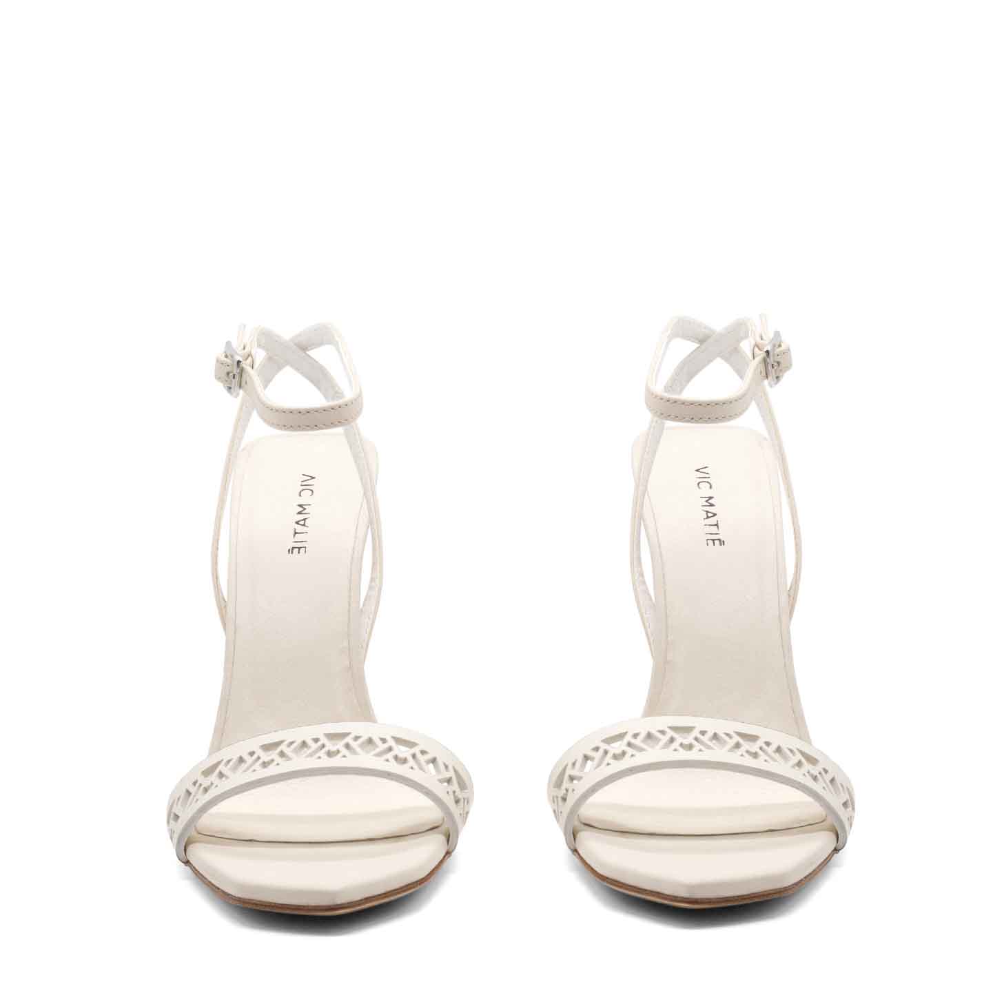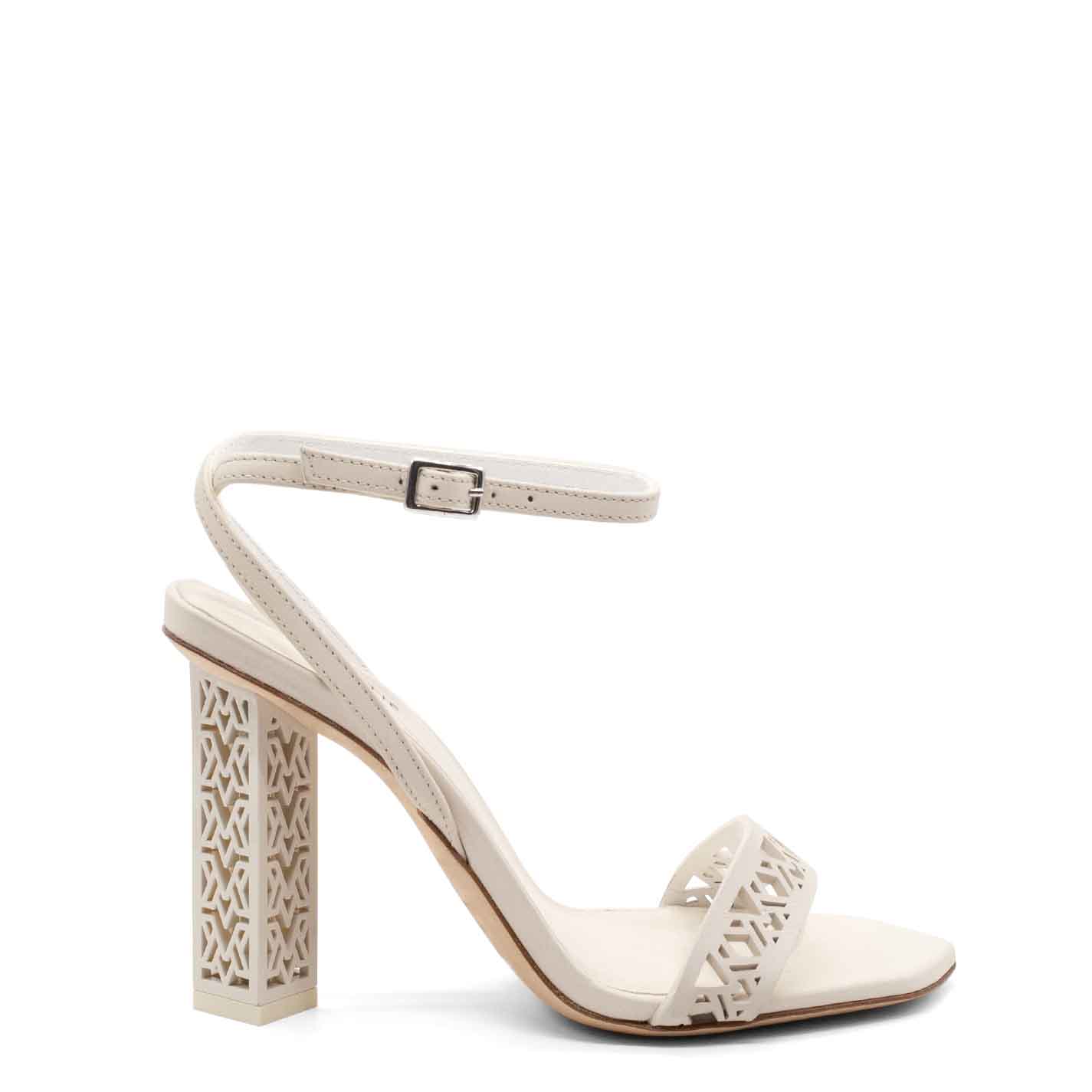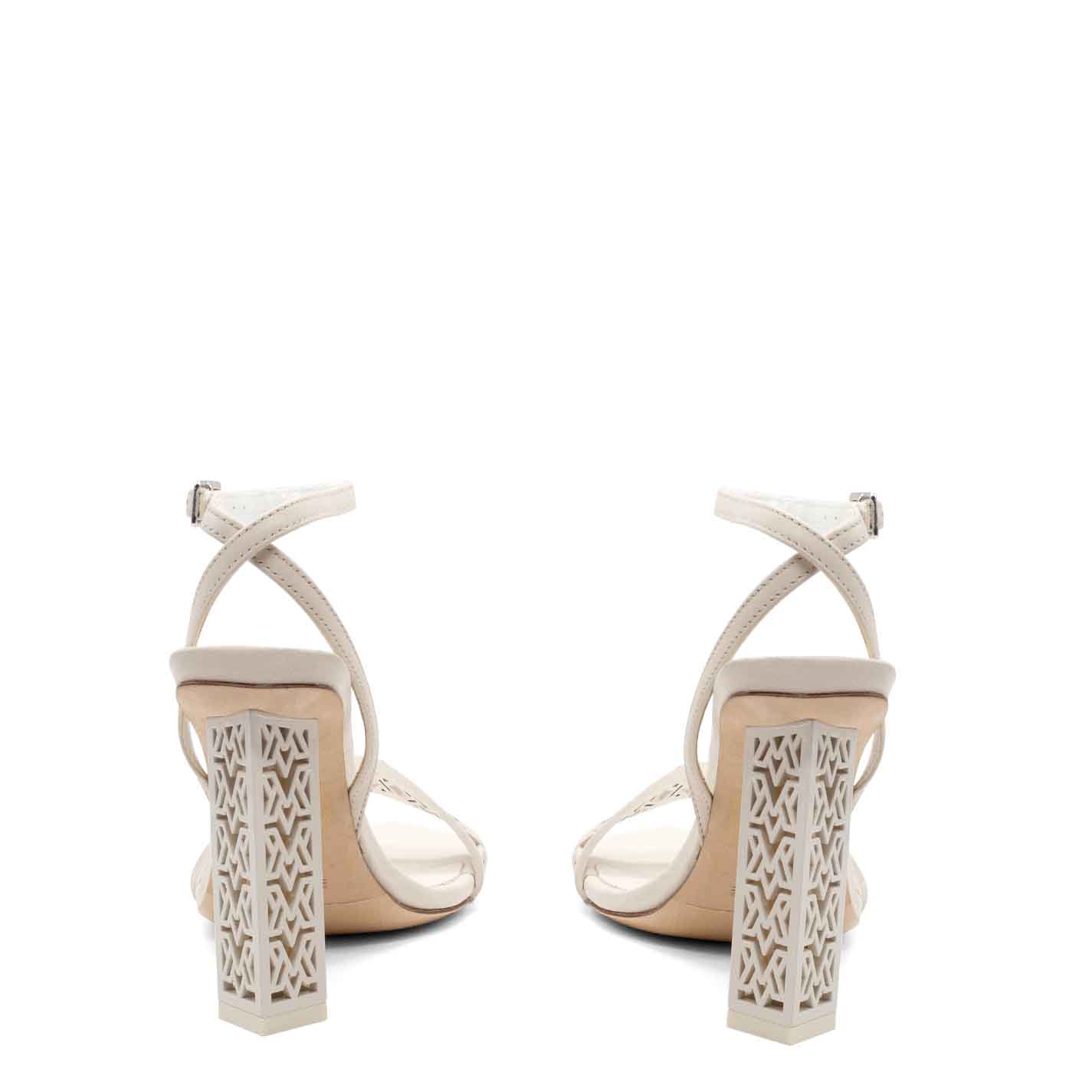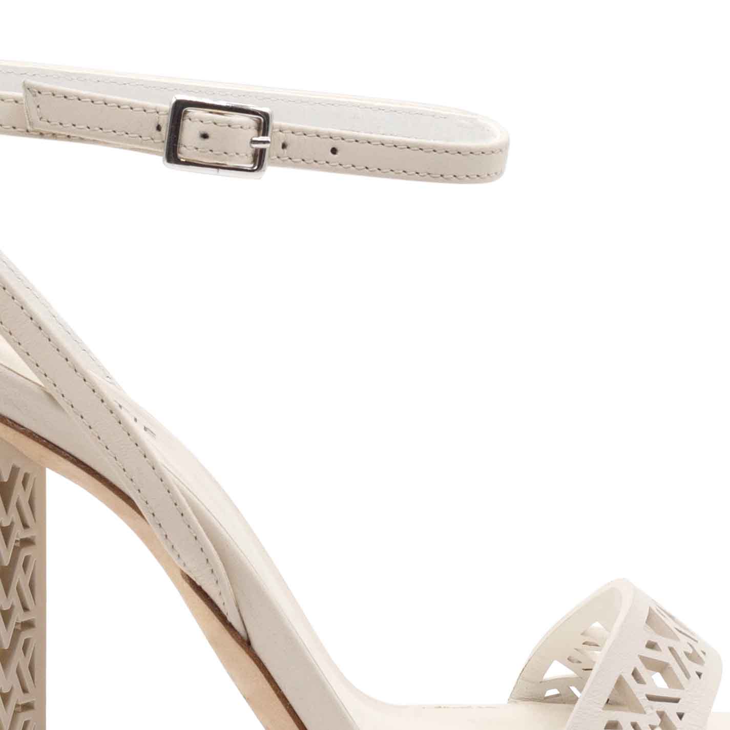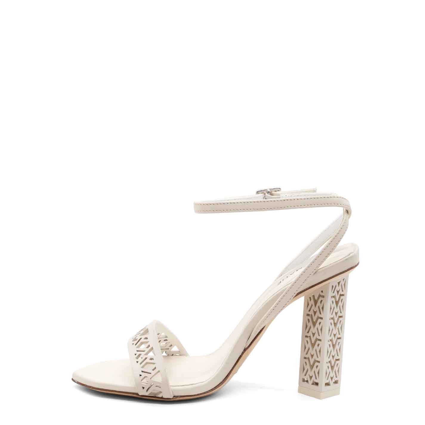 Monogram sandalo traforato in pelle di vitello bianca ,con lavorazione di laseratura che richiama il tacco scultura;