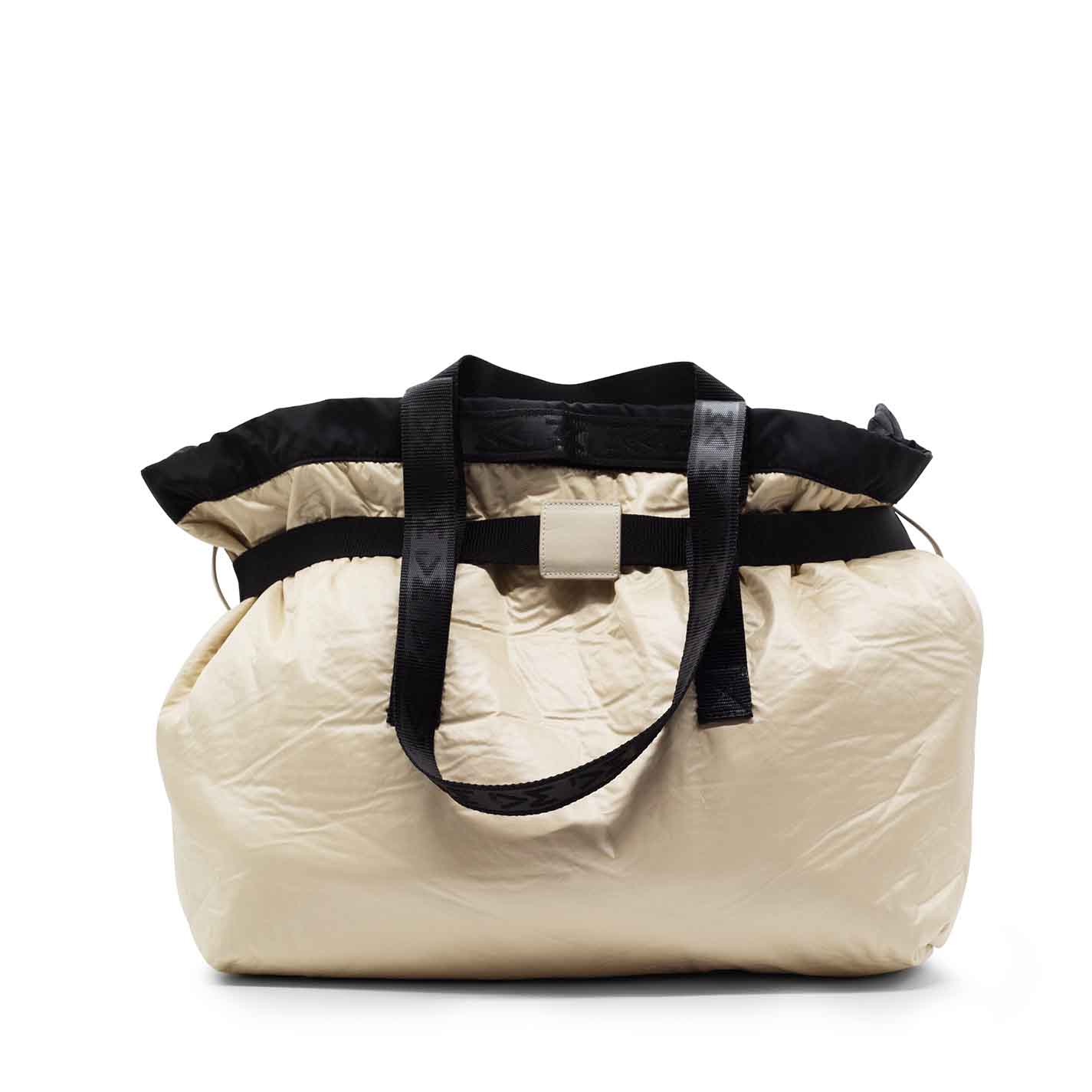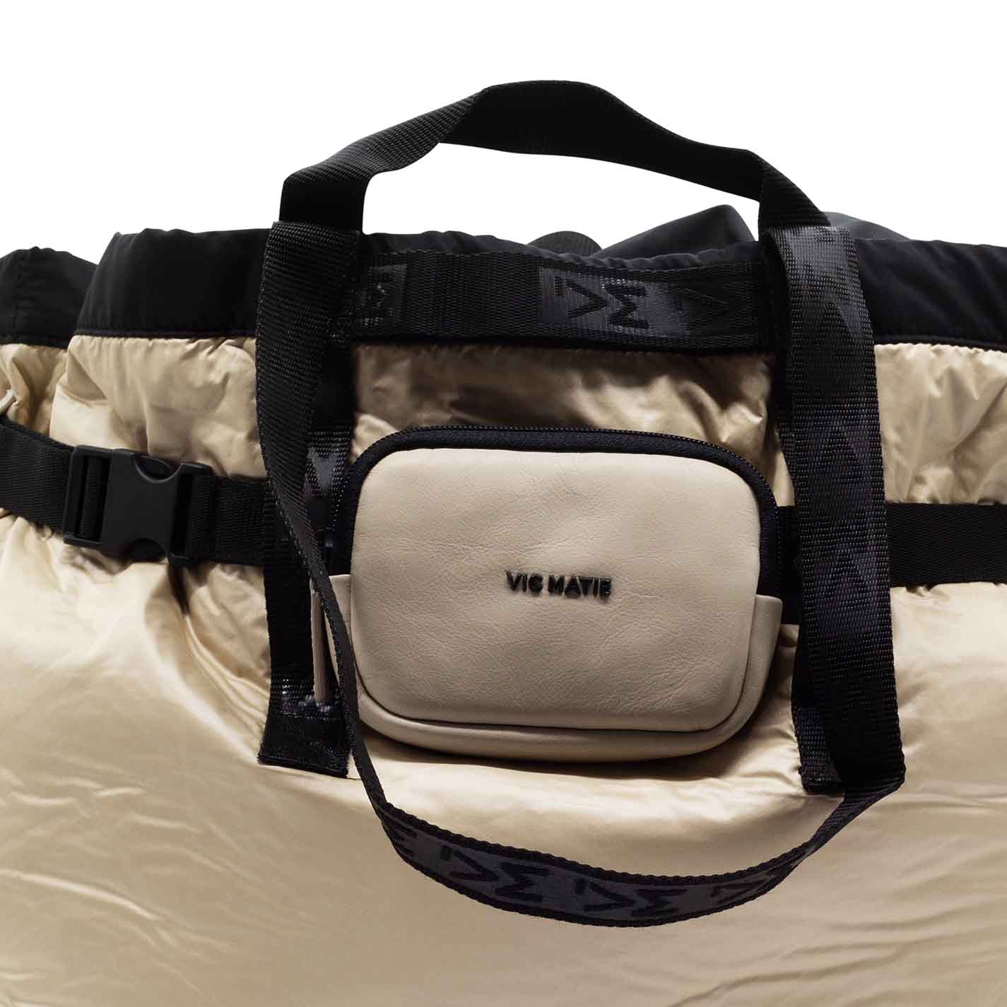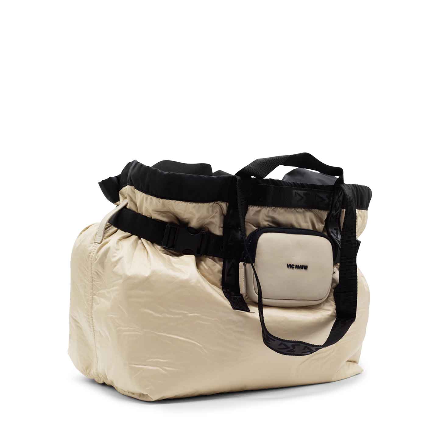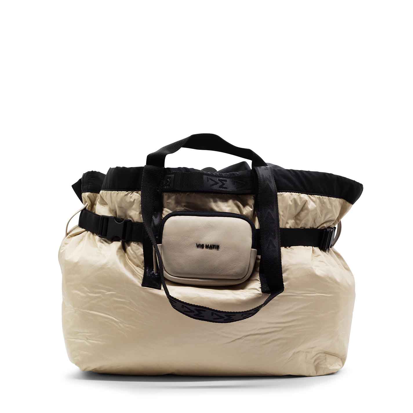 shopper tecnica sabbia interamente realizzata in nylon lucido , con borsellino in pelle arricchito da logo metallico estraibile come la cinta in cordura logata in cui è applicato;