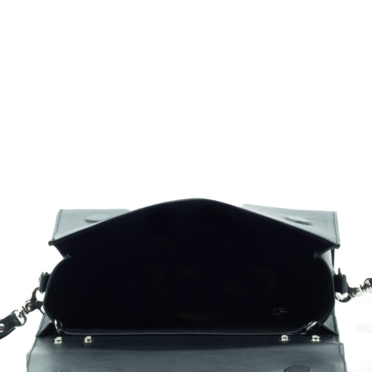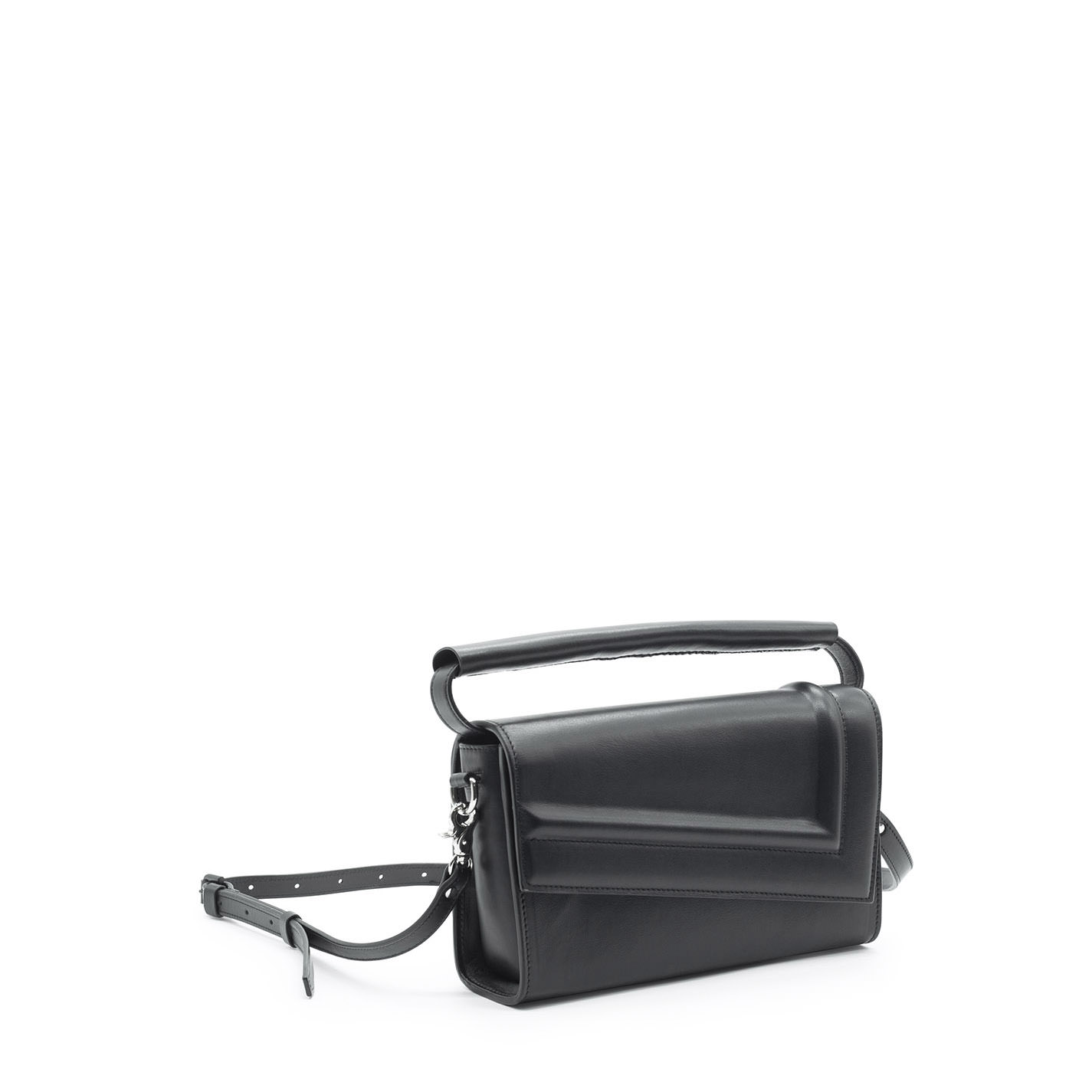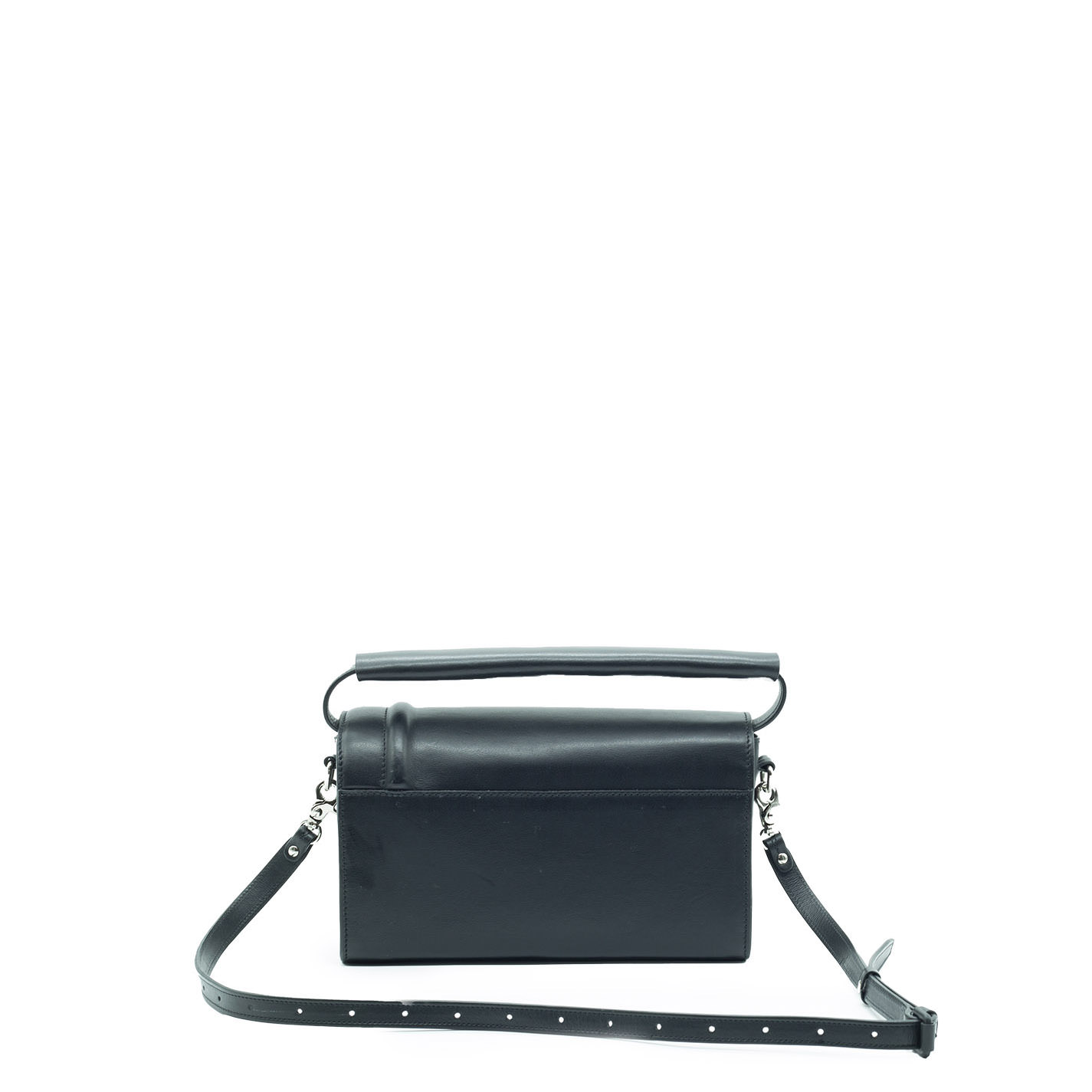 Borsa tracolla nera strutturata in pelle di vitello liscio, con motivo a rilievo su patta. Chiusura con magneti nascosti, manico imbottito e doppie tracolle estraibili.