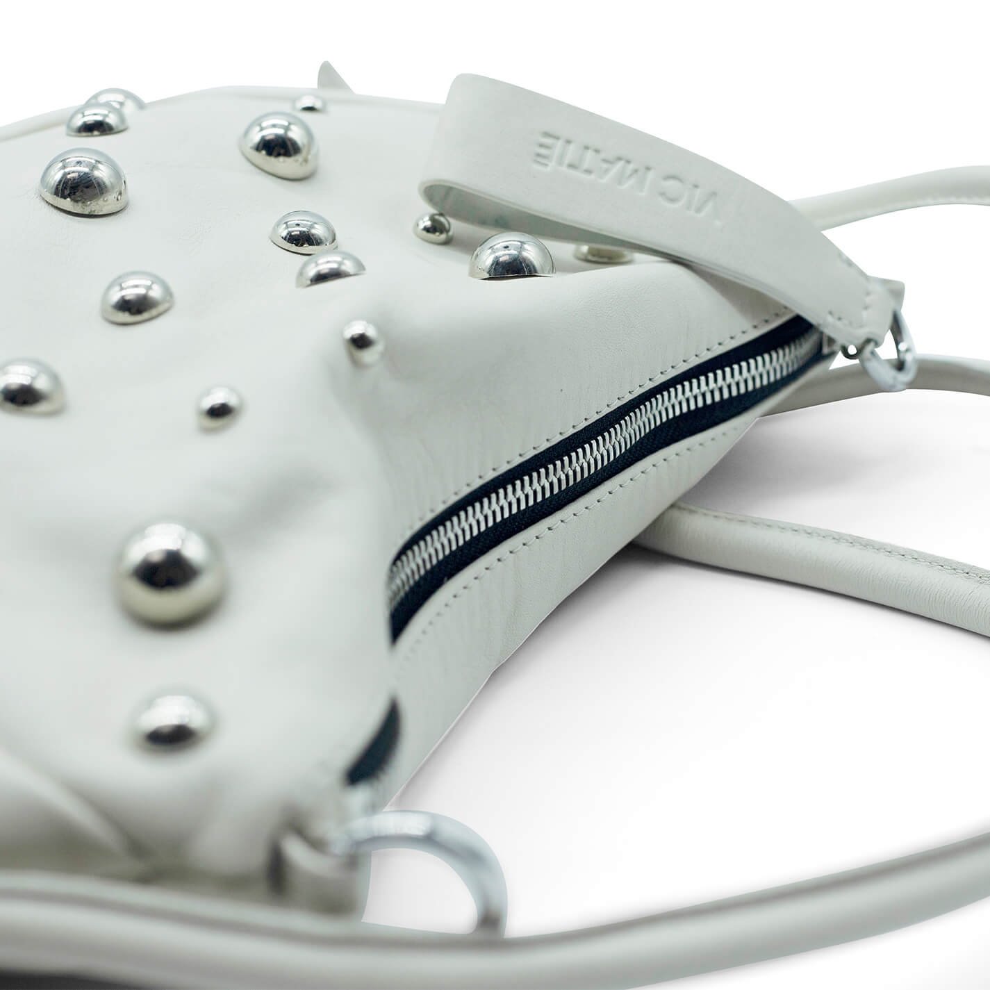 Tracolla panna con borchiein morbida pelle di vitello con tracolla annodata fissa e con borchie sferiche di colore argento. Chiusura con cerniera metallica e moschettoni ad anello agganciabili su se stessi.