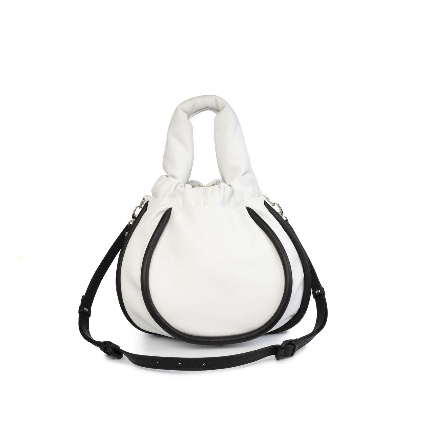 Sacca bianca/nera realizzata in nappa, a spicchi, interamente profilata da piping in pelle a contrasto ,chiusura con coulisse e automatico interno, tracolla regolabile e staccabile. Impreziosita da logo metallico sul davanti.