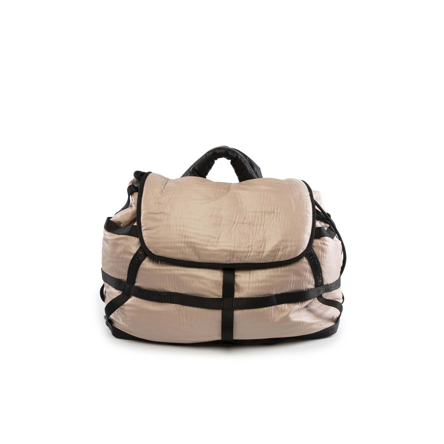 Maxi zaino cipria/nero in tessuto nylon lucido, ingabbiato da nastri logati a contrasto cuciti tra loro. Chiusura con tira coulisse e automatici interni e patta forata per il passaggio dei manici, spallacci in nylon imbottiti. Richiudibile nella tasca interna utile da viaggio.