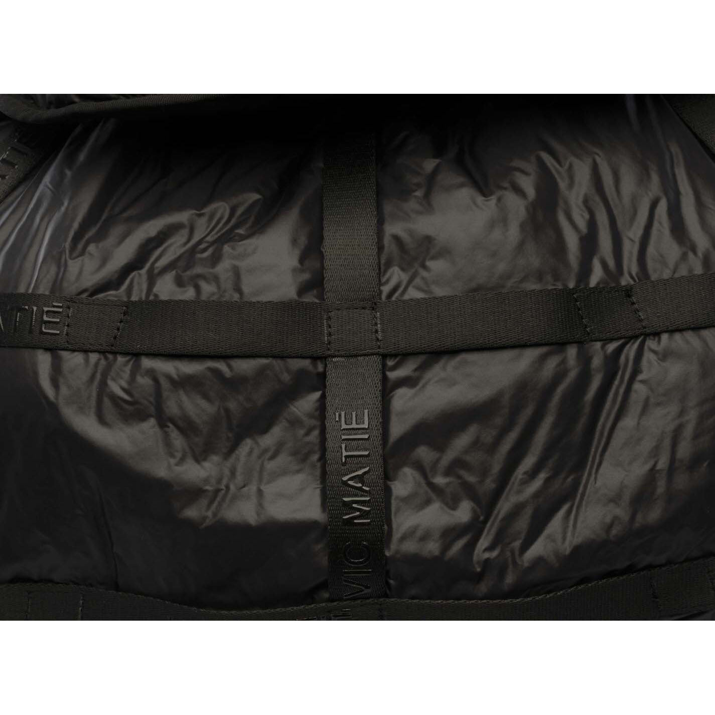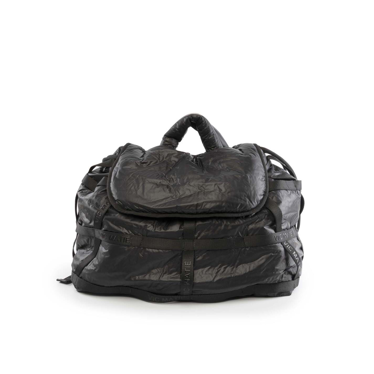 Maxi zaino nero in tessuto nylon lucido, ingabbiato da nastri logati tono su tono cuciti tra loro. Chiusura con tira coulisse e automatici interni e patta forata per il passaggio dei manici, spallacci in nylon imbottiti. Richiudibile nella tasca interna utile da viaggio.