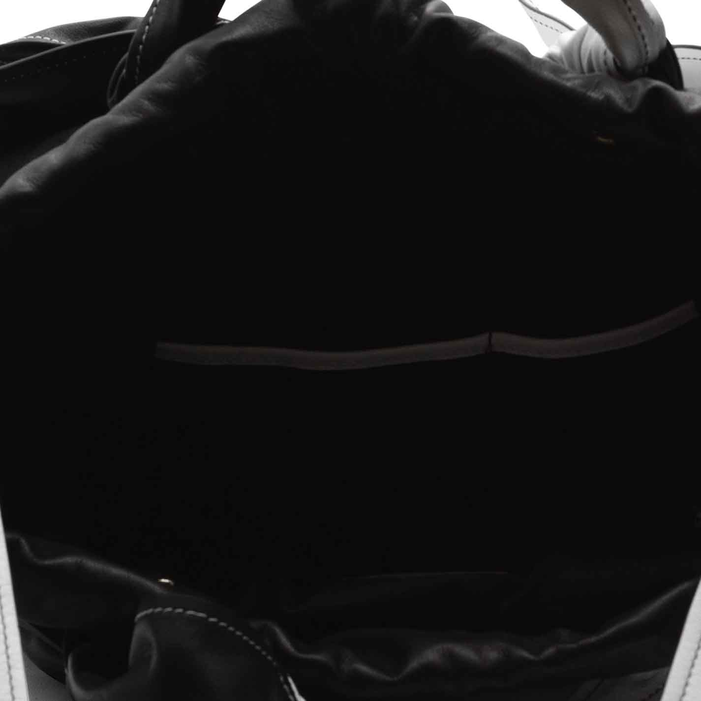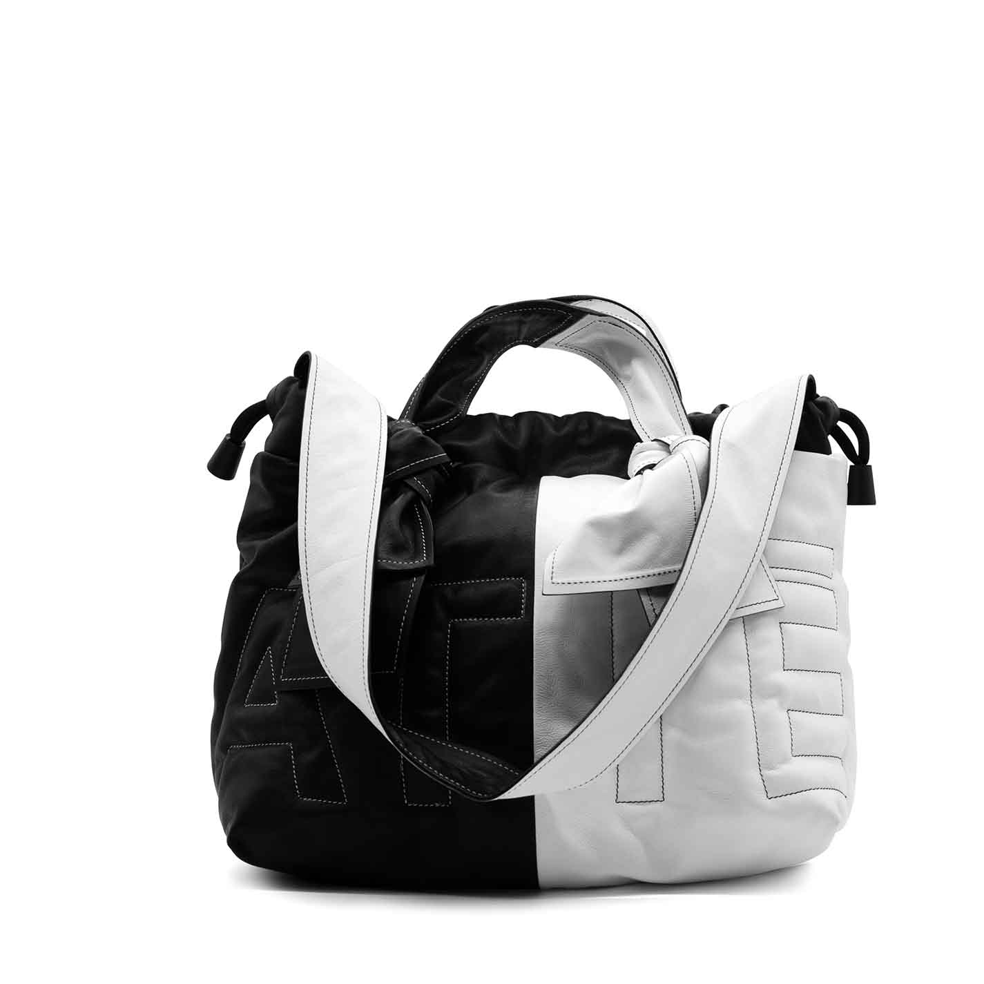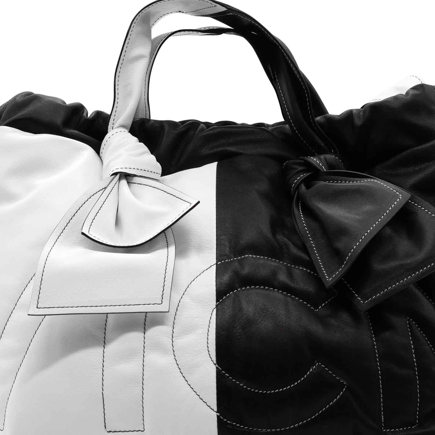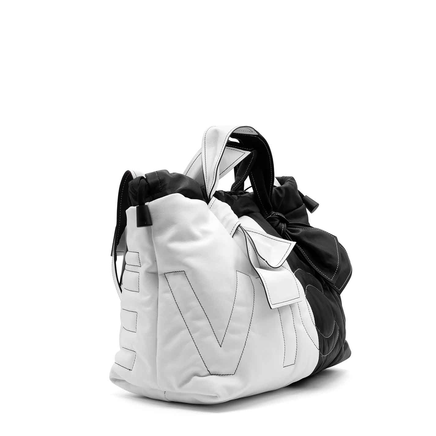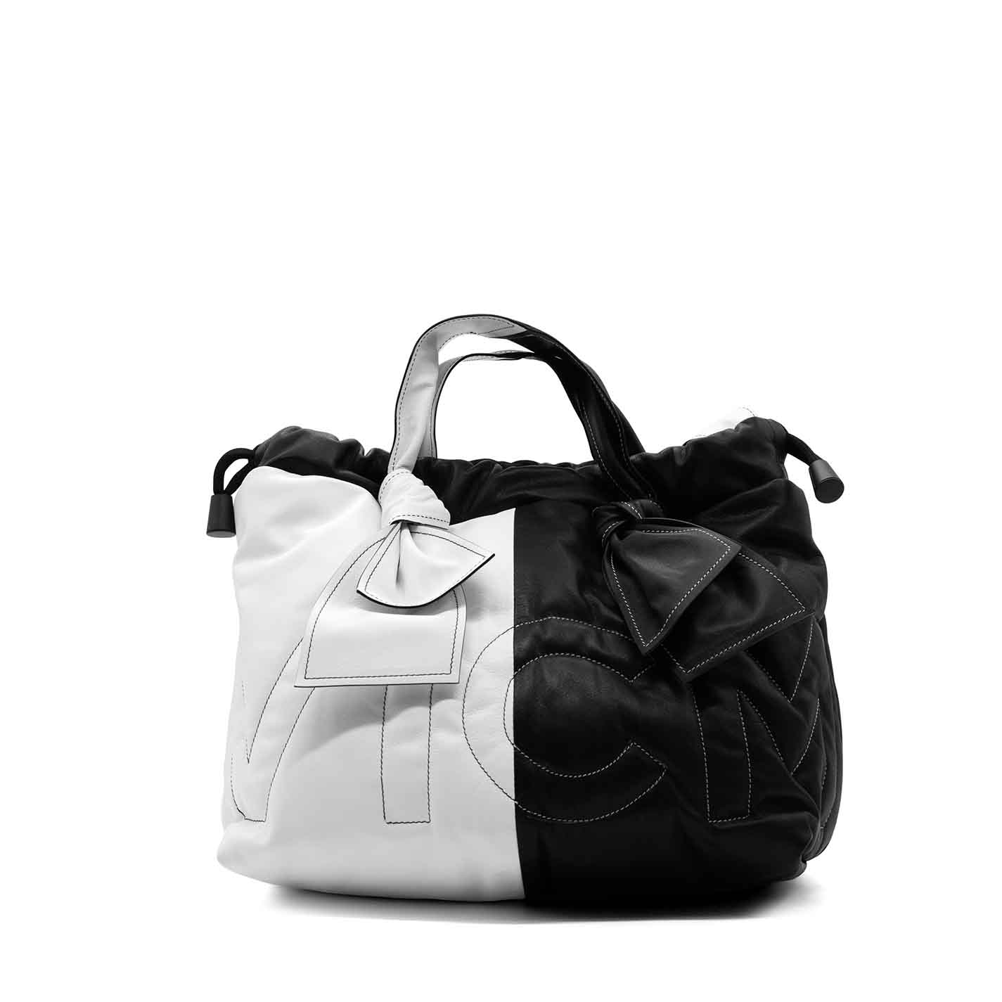 Shopper midi bicolore bianca/nera realizzata in morbido vitello nappato con maxi logo ricamato. Manici con effetto annodato, chiusura con coulisse e automatici.