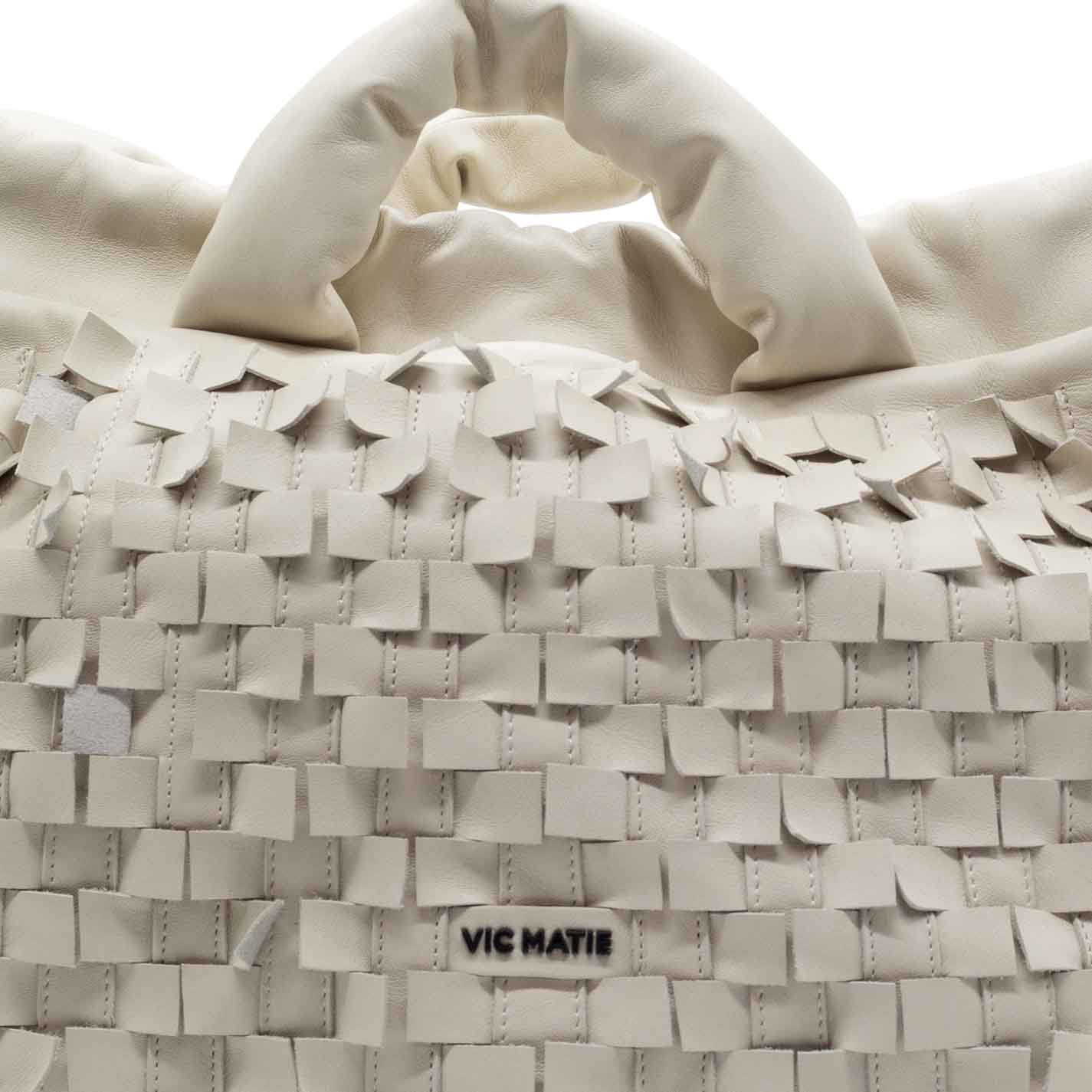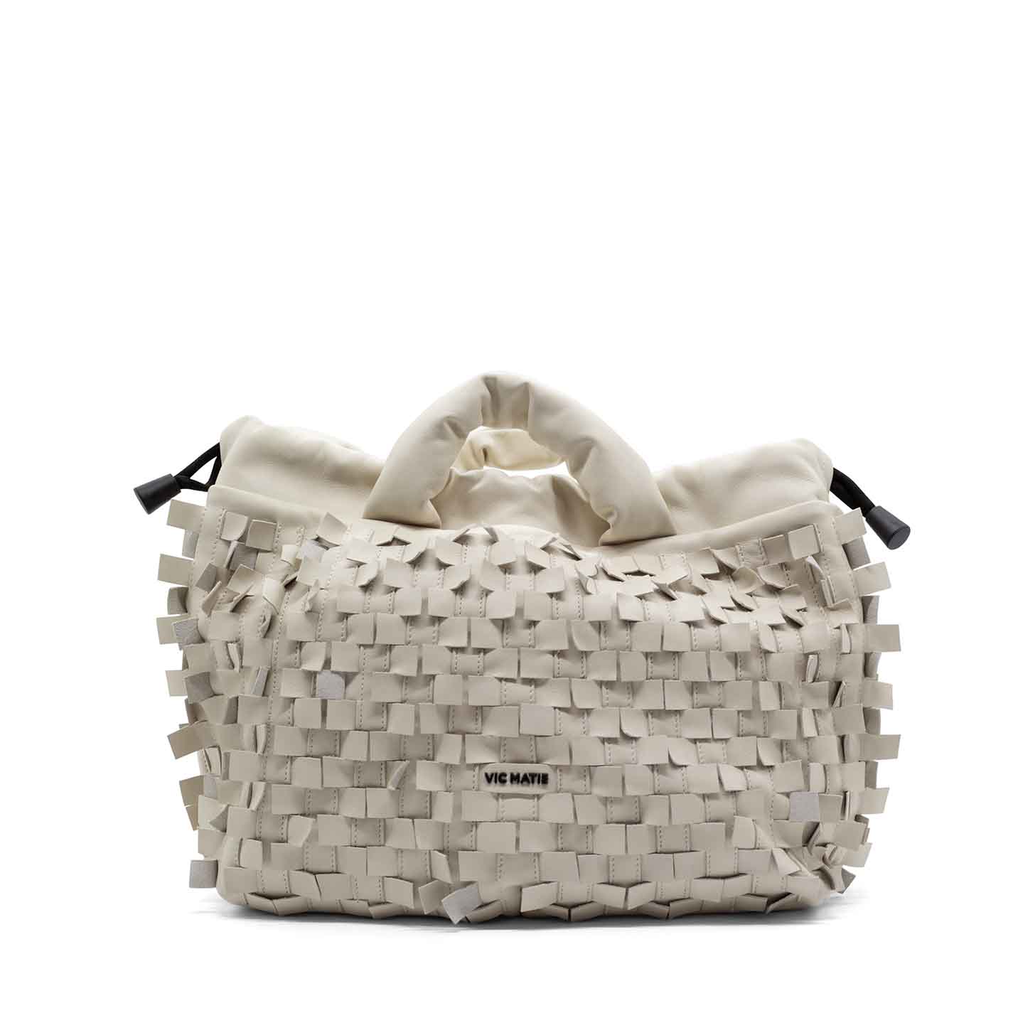 Shopper midi sfrangiata avorio realizzata in morbido vitello nappato con lavorazione di listini intrecciati e tagliati, che danno un effetto di sfrangiatura. Chiusura con coulisse e automatici, tracolla e manici imbottiti.