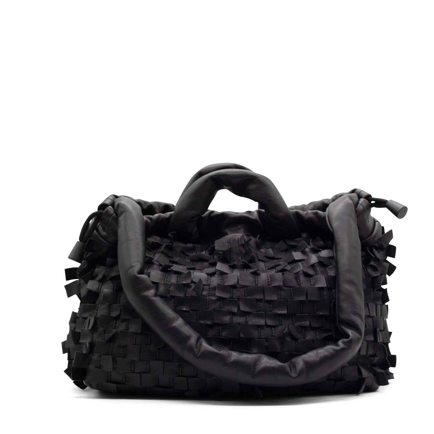 Shopper midi sfrangiata nera realizzata in morbido vitello nappato con lavorazione di listini intrecciati e tagliati, che danno un effetto di sfrangiatura. Chiusura con coulisse e automatici, tracolla e manici imbottiti.