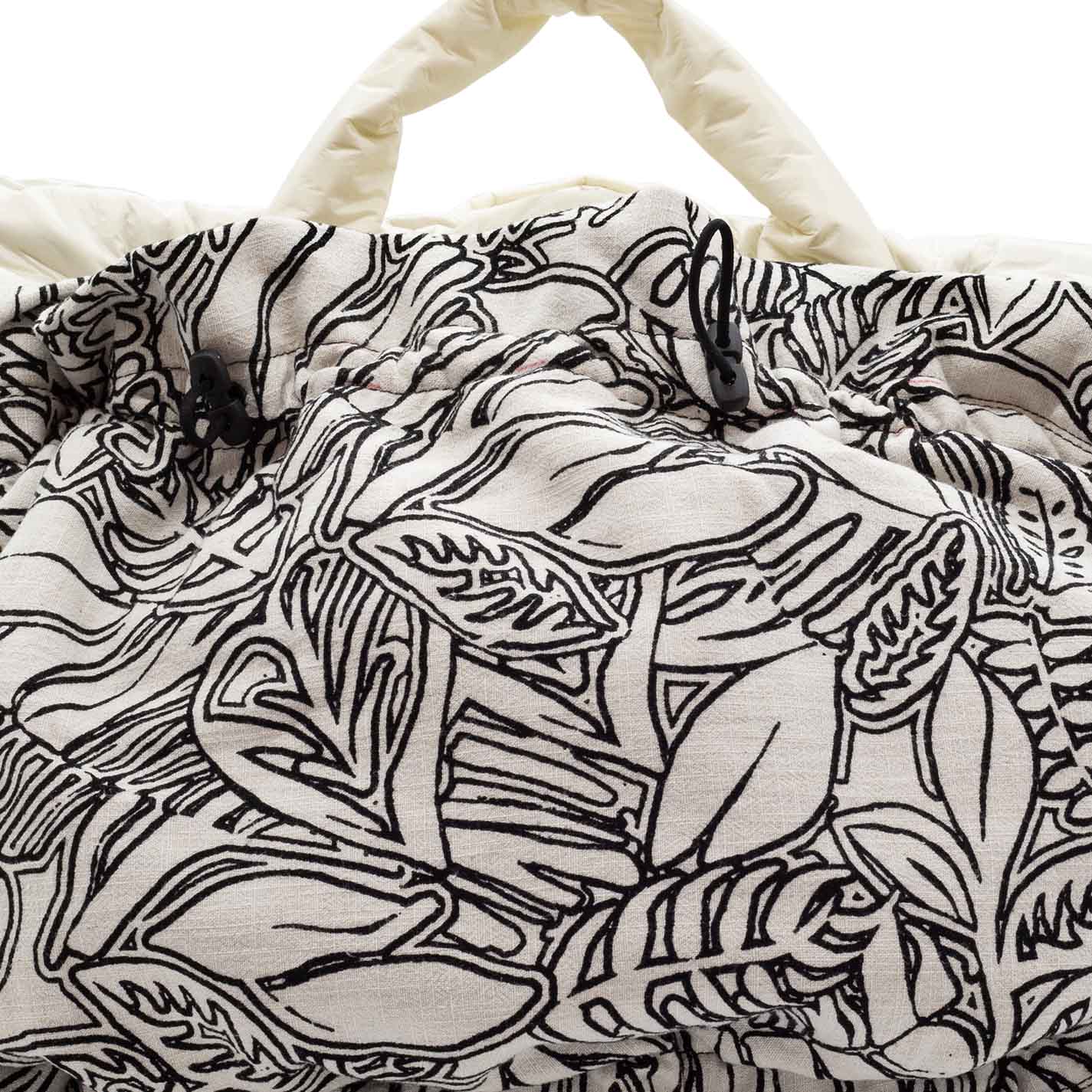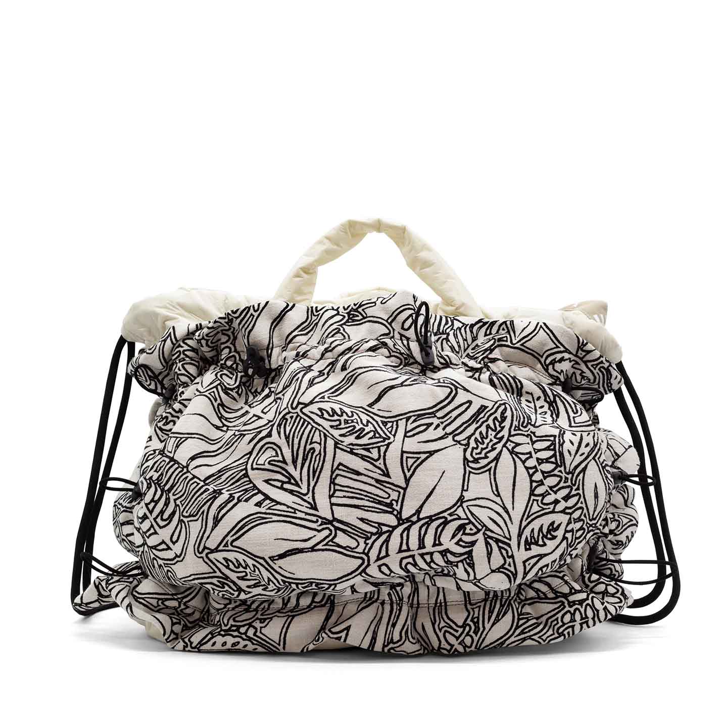 Shopper coulisse bianca/nera realizzata in nylon e tessuto fantasia floreale misto lino, con arricciature create da multi tira coulisse, chiusura con automatici nascosti. Tracolla logata e passa lacci in corda per poterlo indossare a zaino.