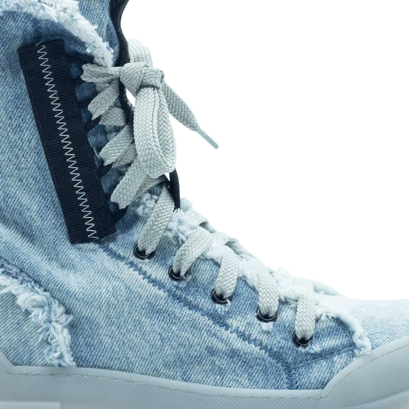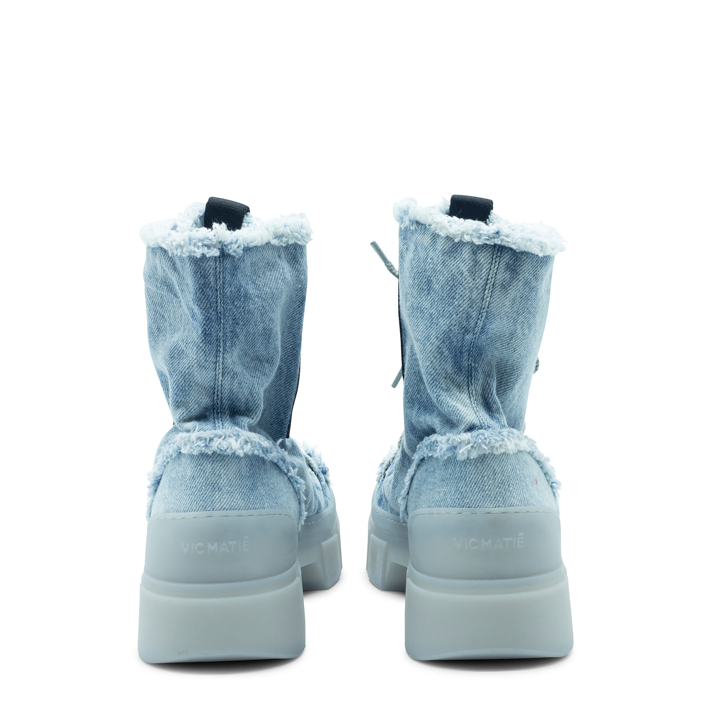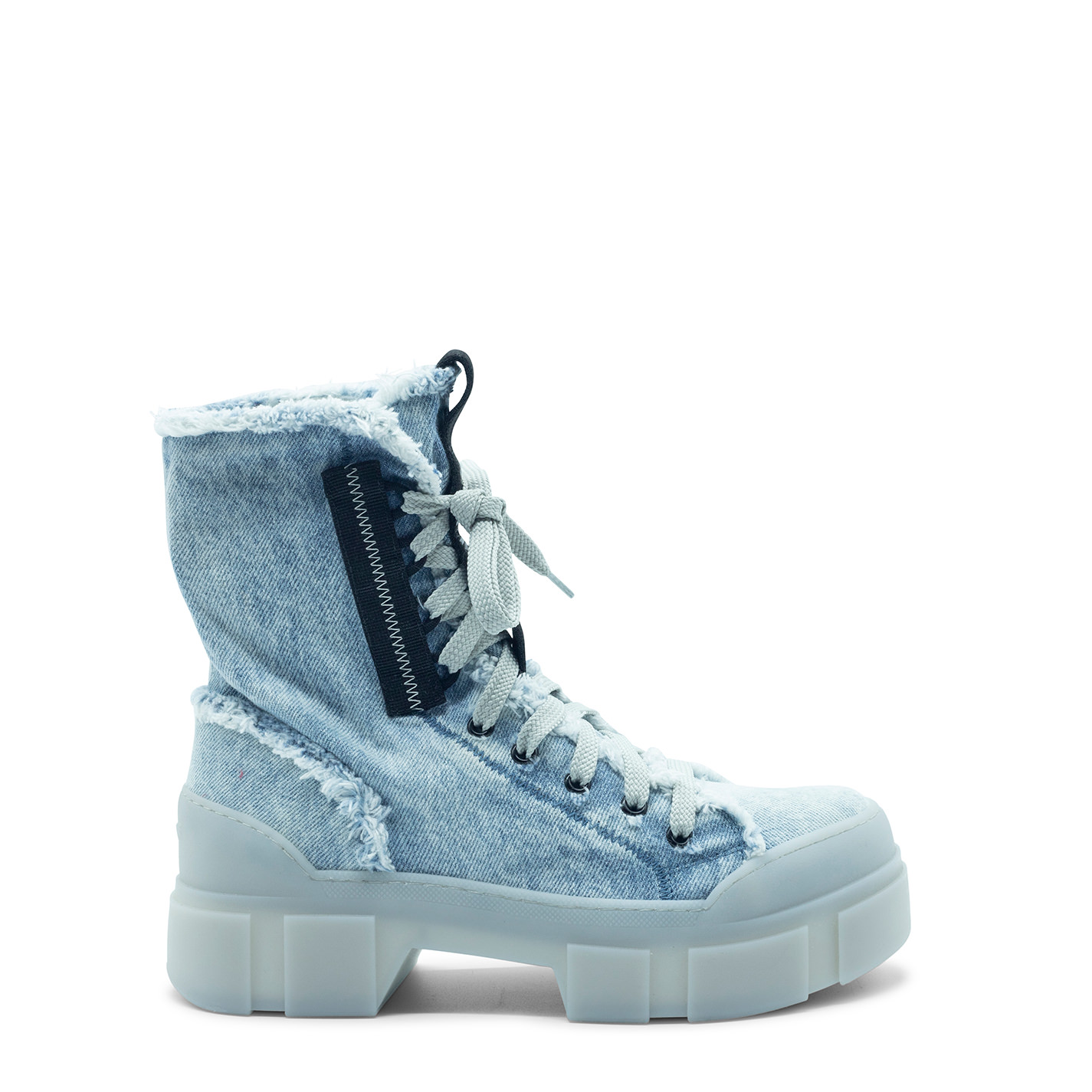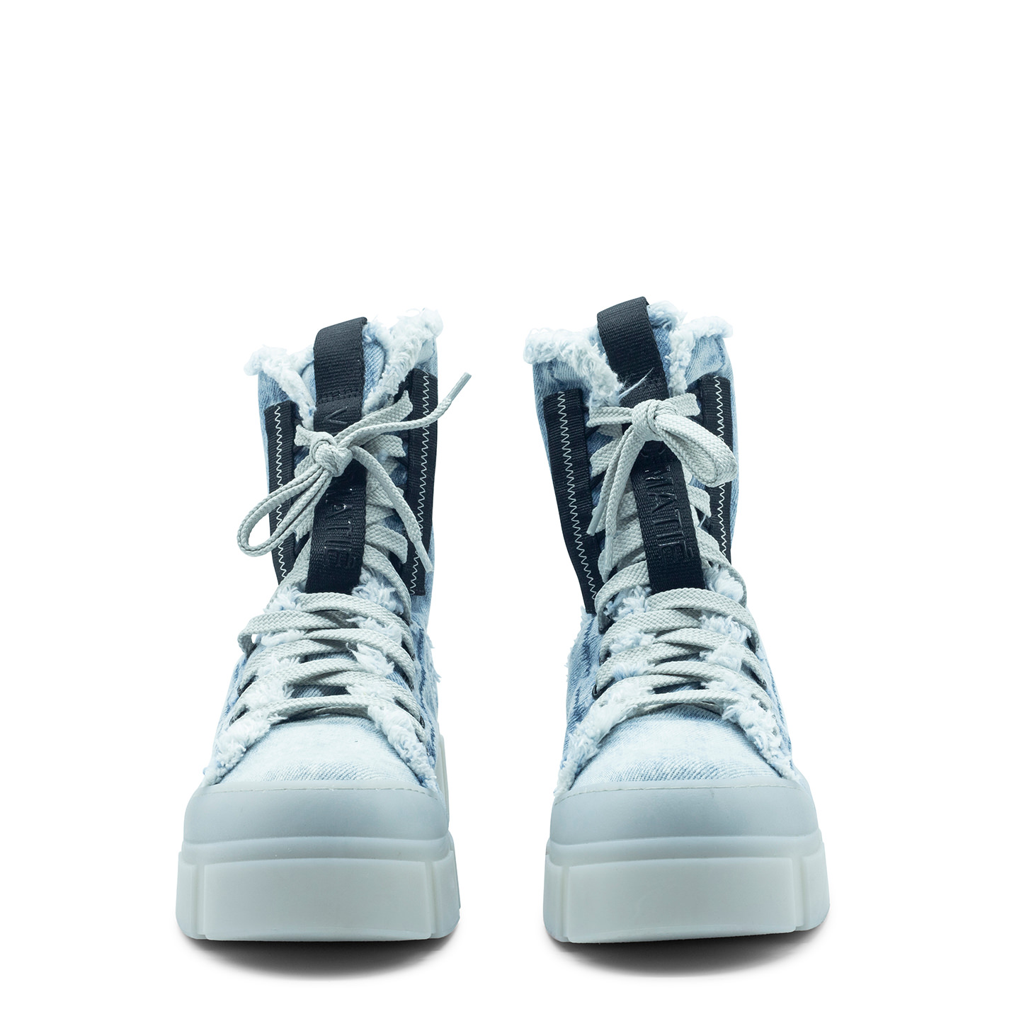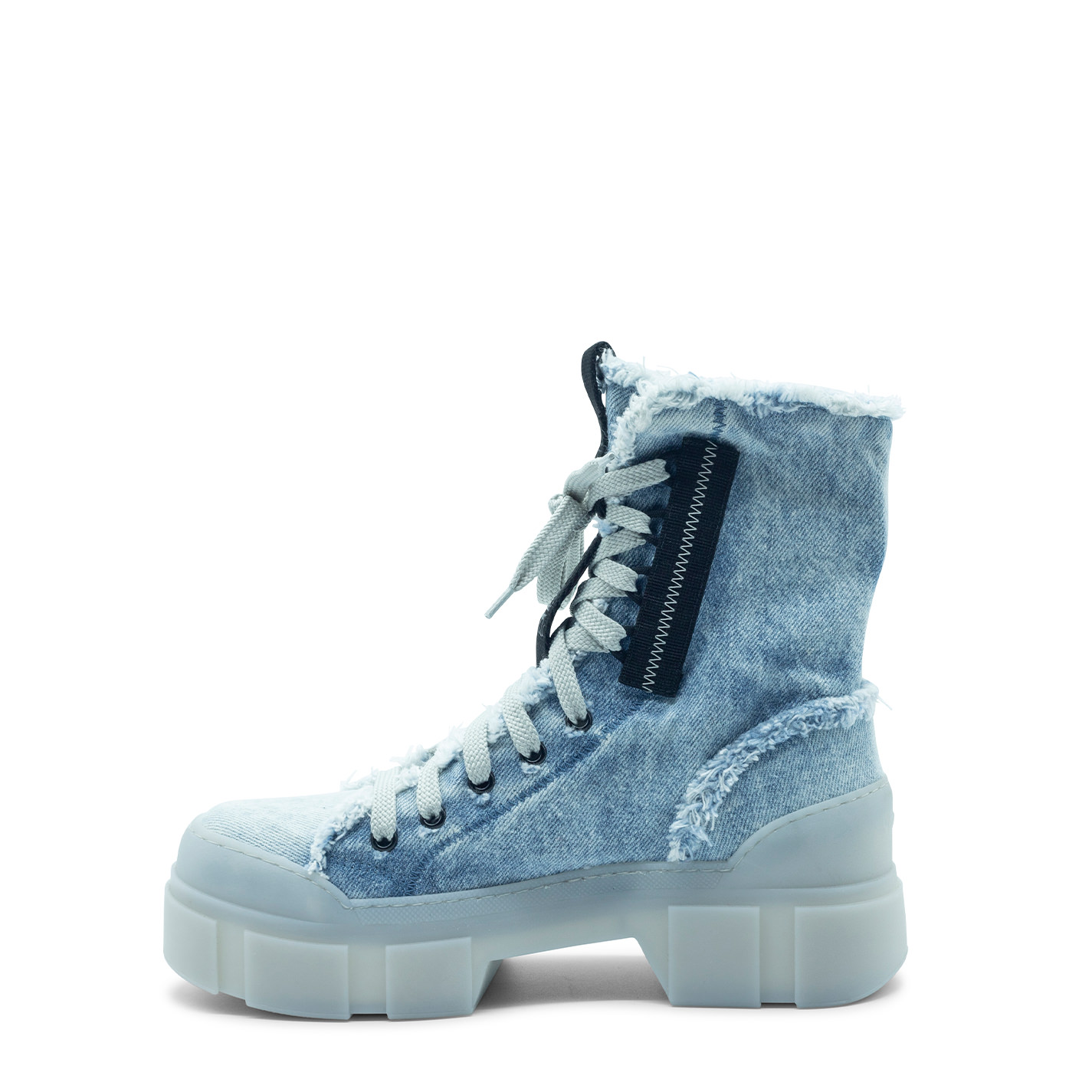 Roccia Anfibio azzurroin denim stone wash ,foderato in cotone colorato. Motivo di cuciture zig zag e passa lacci in contrasto. Suola guscio in TPU con tacche a rilievo e plantare TAG morbido ricoperto in pelle di vitello. Made in Italy.
