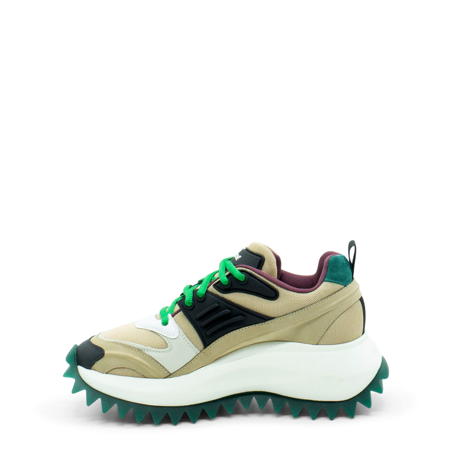 Running nera/cuoio/verde blue in nabuk/pelle/rete e crosta con accessori,passalacci e rilievi in gomma ,che caratterizzano anche la tomaia. Suola monoblocco xl extralight,logata con riporto in gomma e battistrada con maxi spikes , plantare anatomico rivestito in puro cotone. Made in Italy.