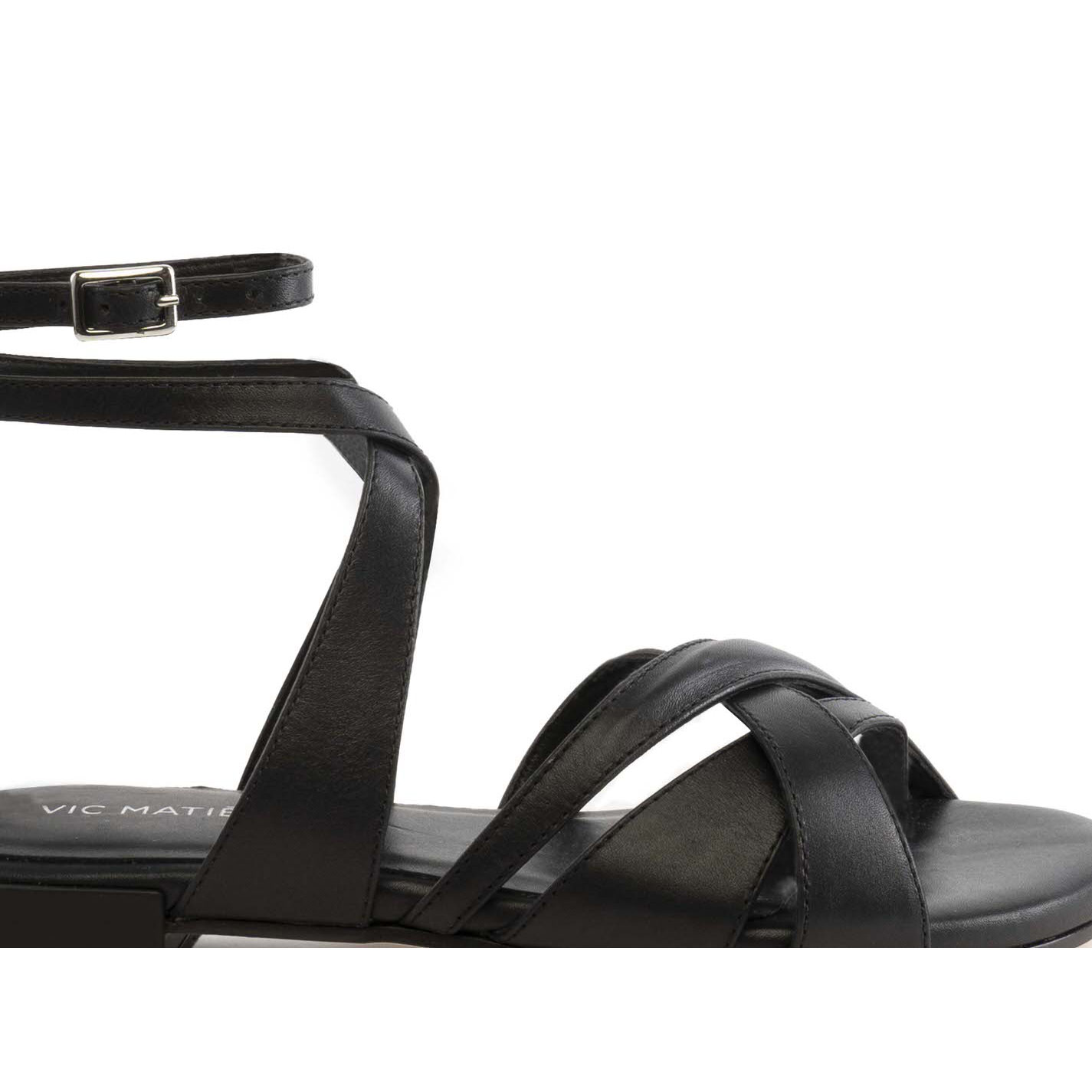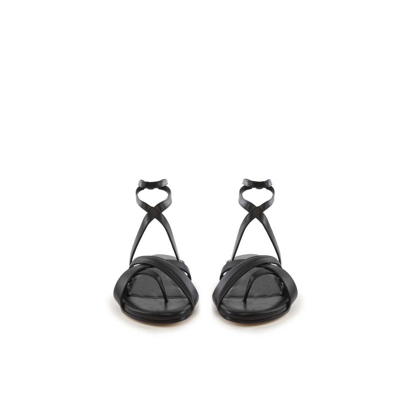 Sandalo flat nero in pelle di vitello mat, con fasce sagomate e incrociate sul davanti e motivo di lavorazione bombé, cinturino regolabile alla caviglia. Suola in cuoio e sottopiede confort ricoperto in pelle, tacco verniciato opaco tono su tono. Made in Italy.
